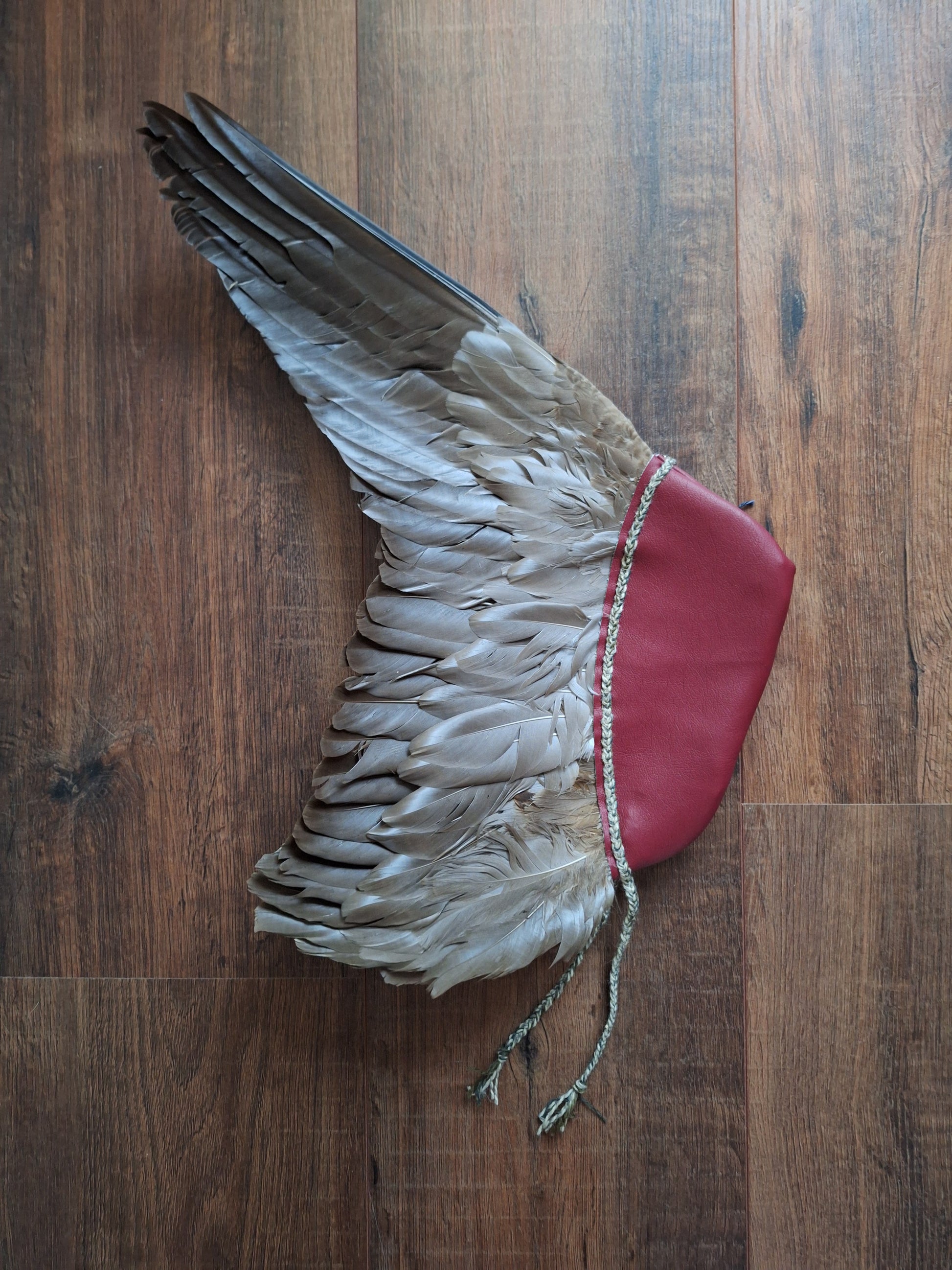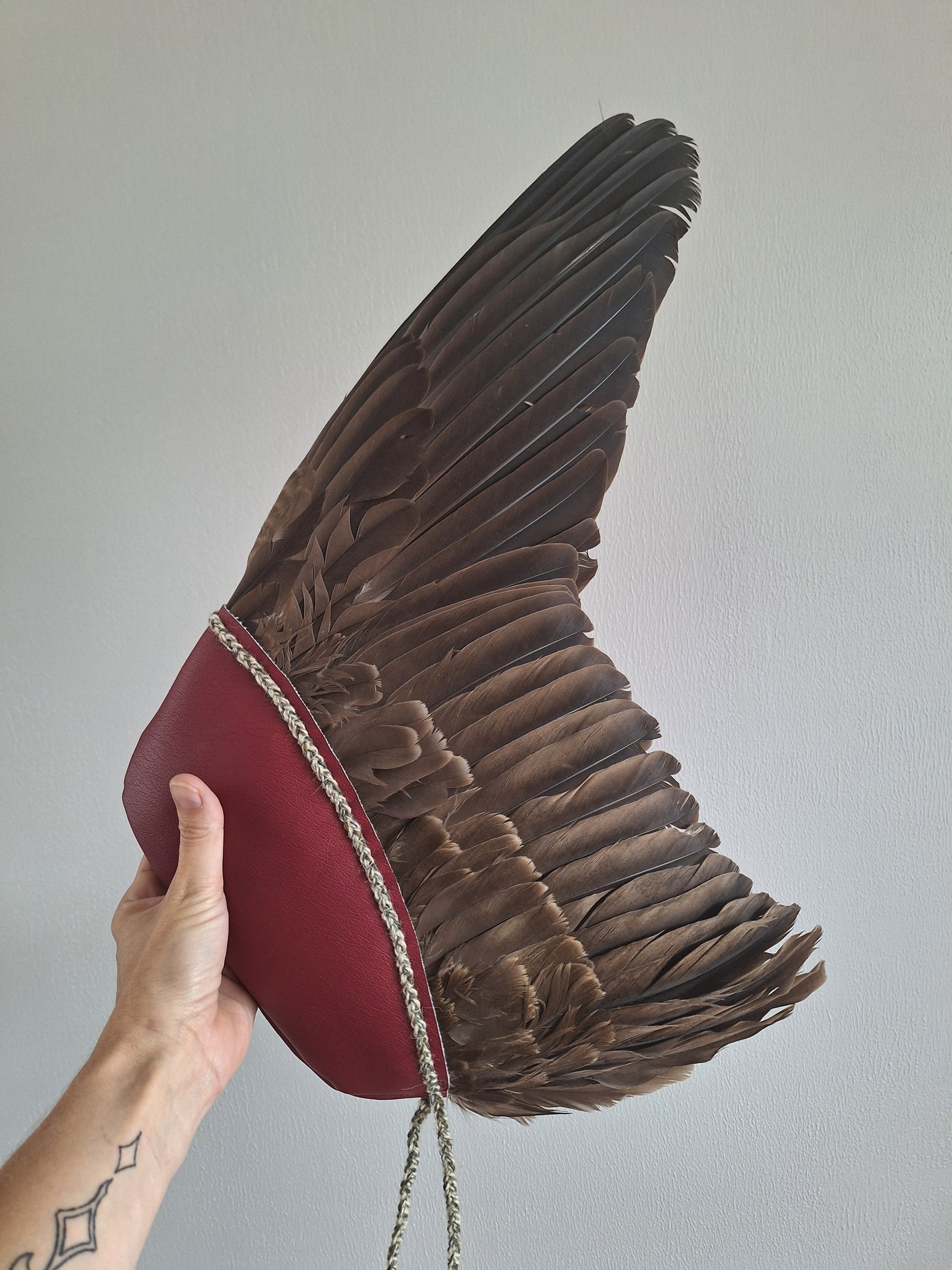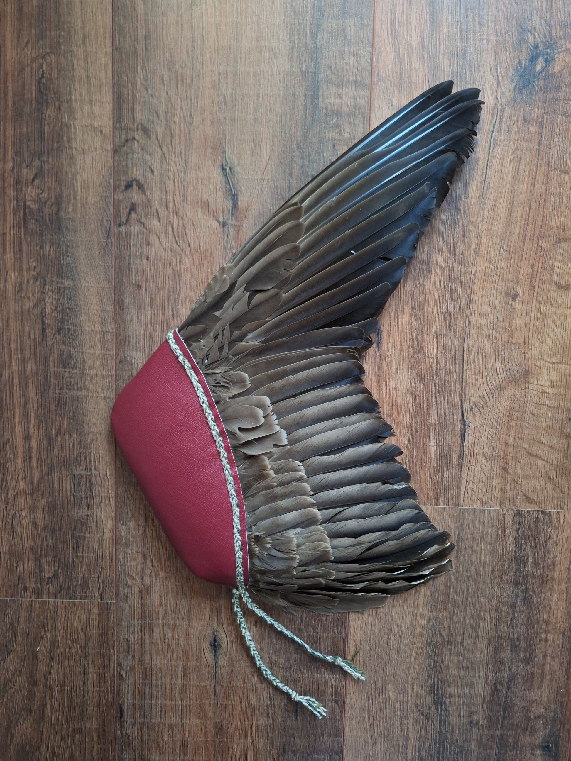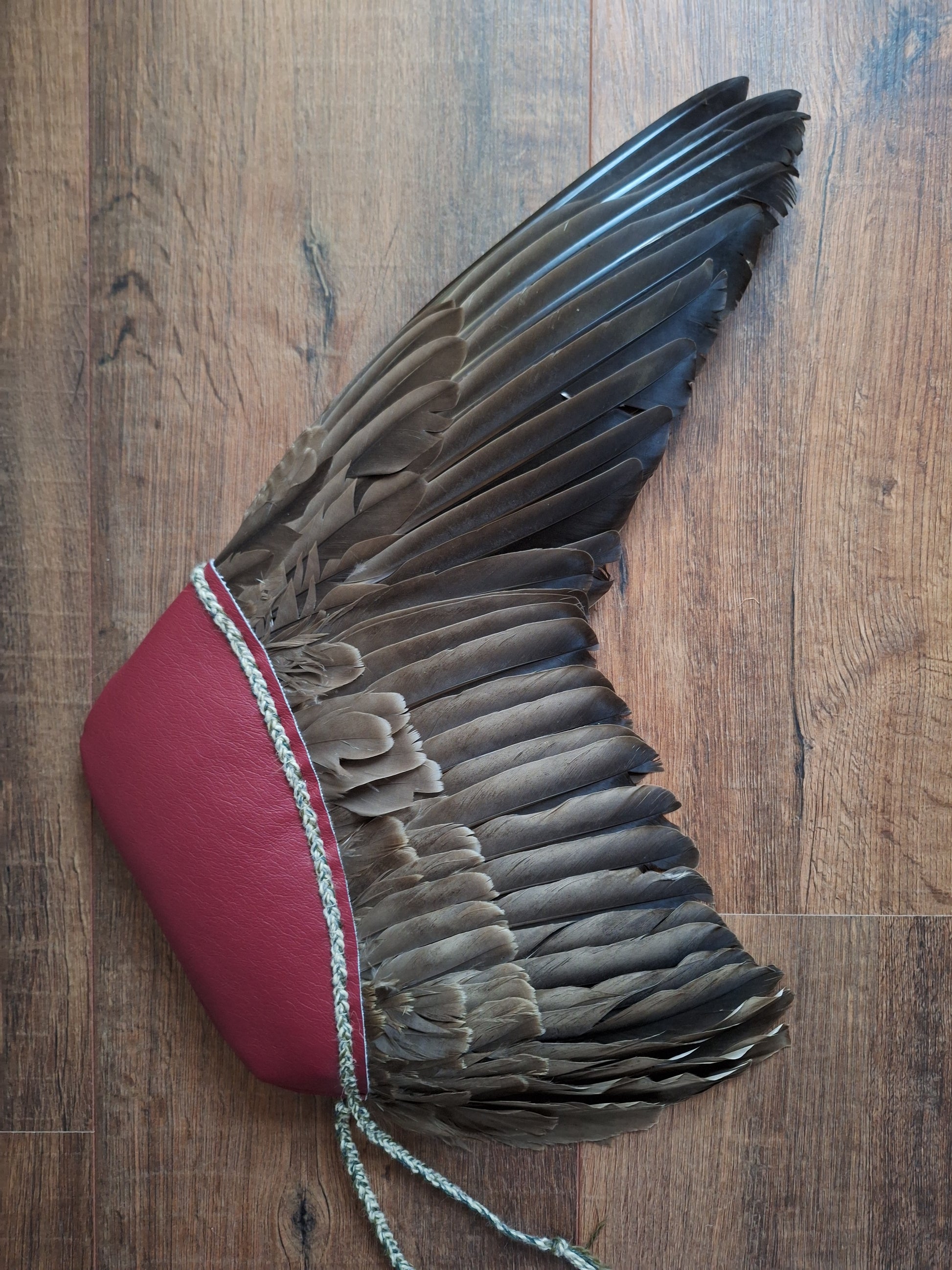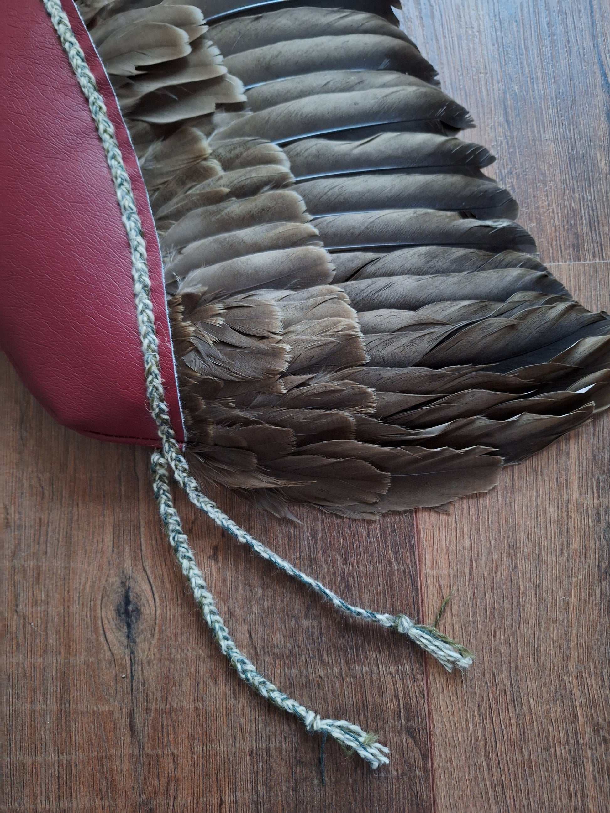 The wing has been handsewn into a sleeve of burgundy red faux leather and decorated with a braid made with 9 strands of old (1960's), left-over wool from the dutch wool brand 'Scheepjes'. During the braiding process, only the best of intentions have been put in.