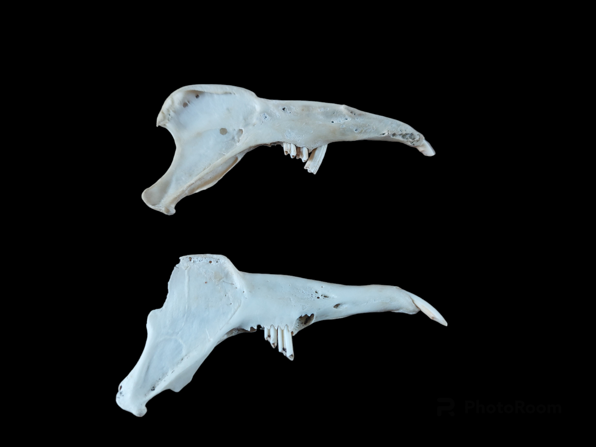 Big skull from an old hare, upper skull and separate lower jaws. Look closely at the pictures to observe the condition of the skull.