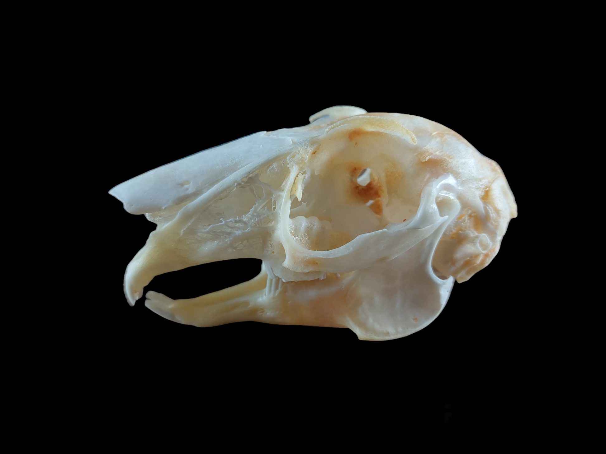 Nice skull from a dutch hare. Older animal, died of natural causes. Thoroughly cleaned and slightly bleached, but some (grease) staining on the back of the skull remains.