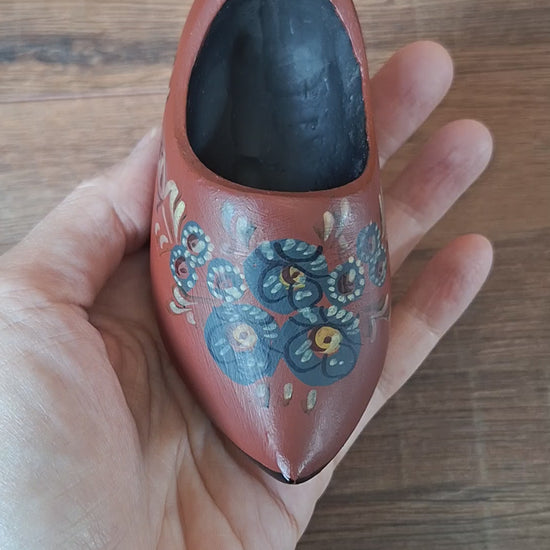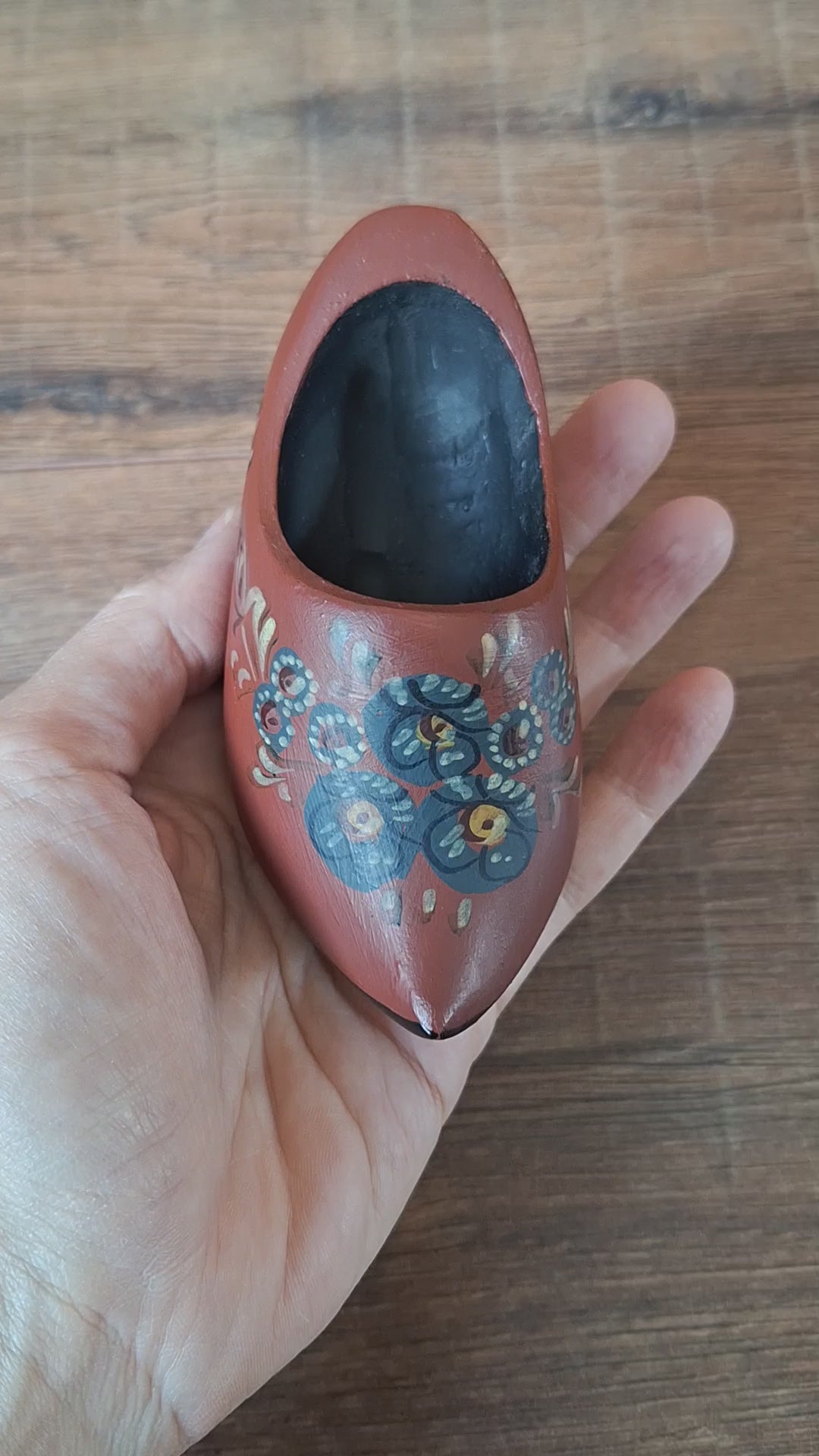 Small dutch wooden shoe ("klomp"), decorated in a traditional dutch folk painting style known as "Hindelooper", referring to the name of the small Frysian village where this style of painting originates.