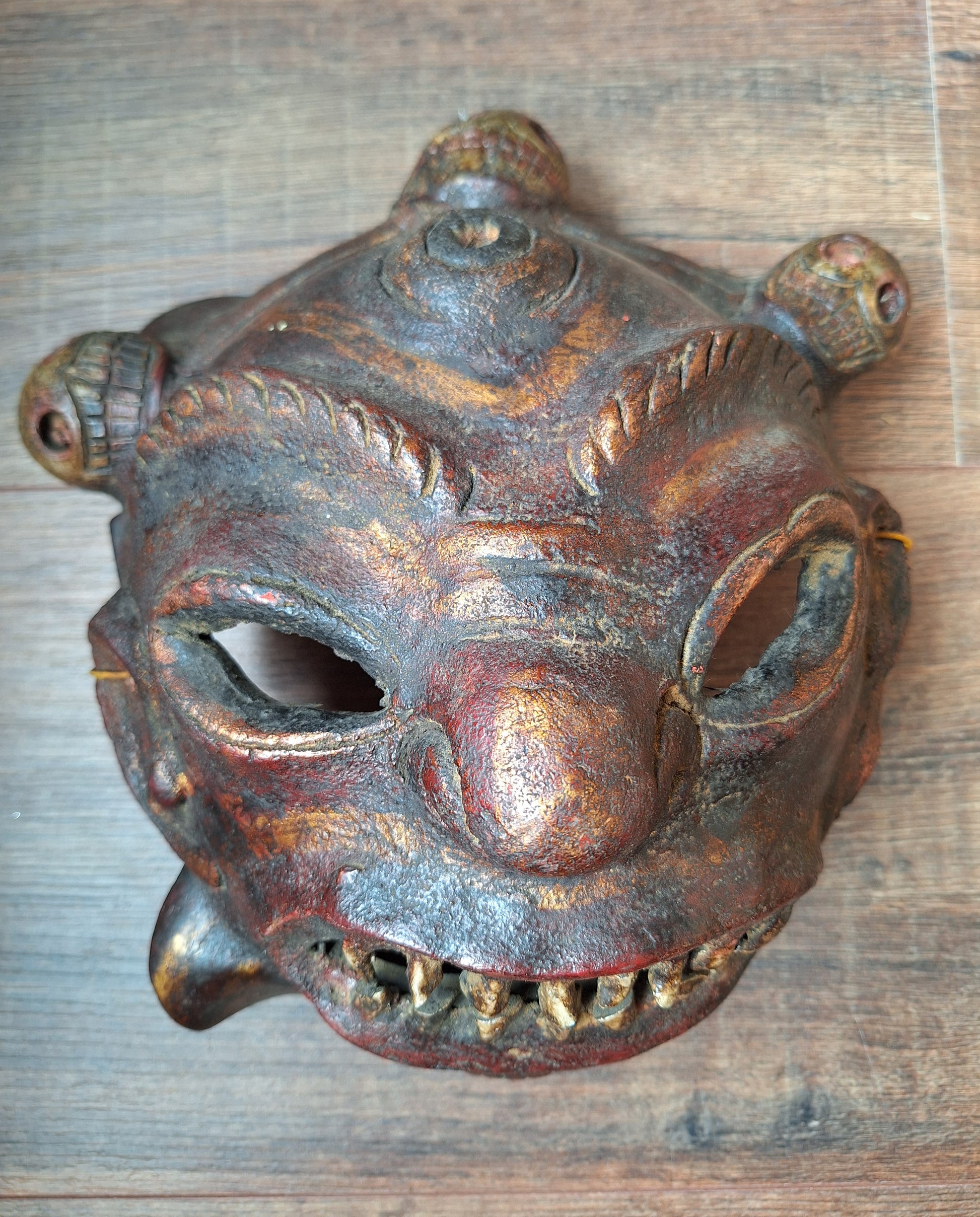 With special techniques the horn has first been flattened and then molded into the shape of the face. Further facial features have been added with clay, after which the mask has been decorated with red and golden paint and finished with a dark brown varnish. The wrathful-ness of this mask has been made apparent with its crown of three human skulls and a mouth full of teeth, that have been made by adding real animal teeth.