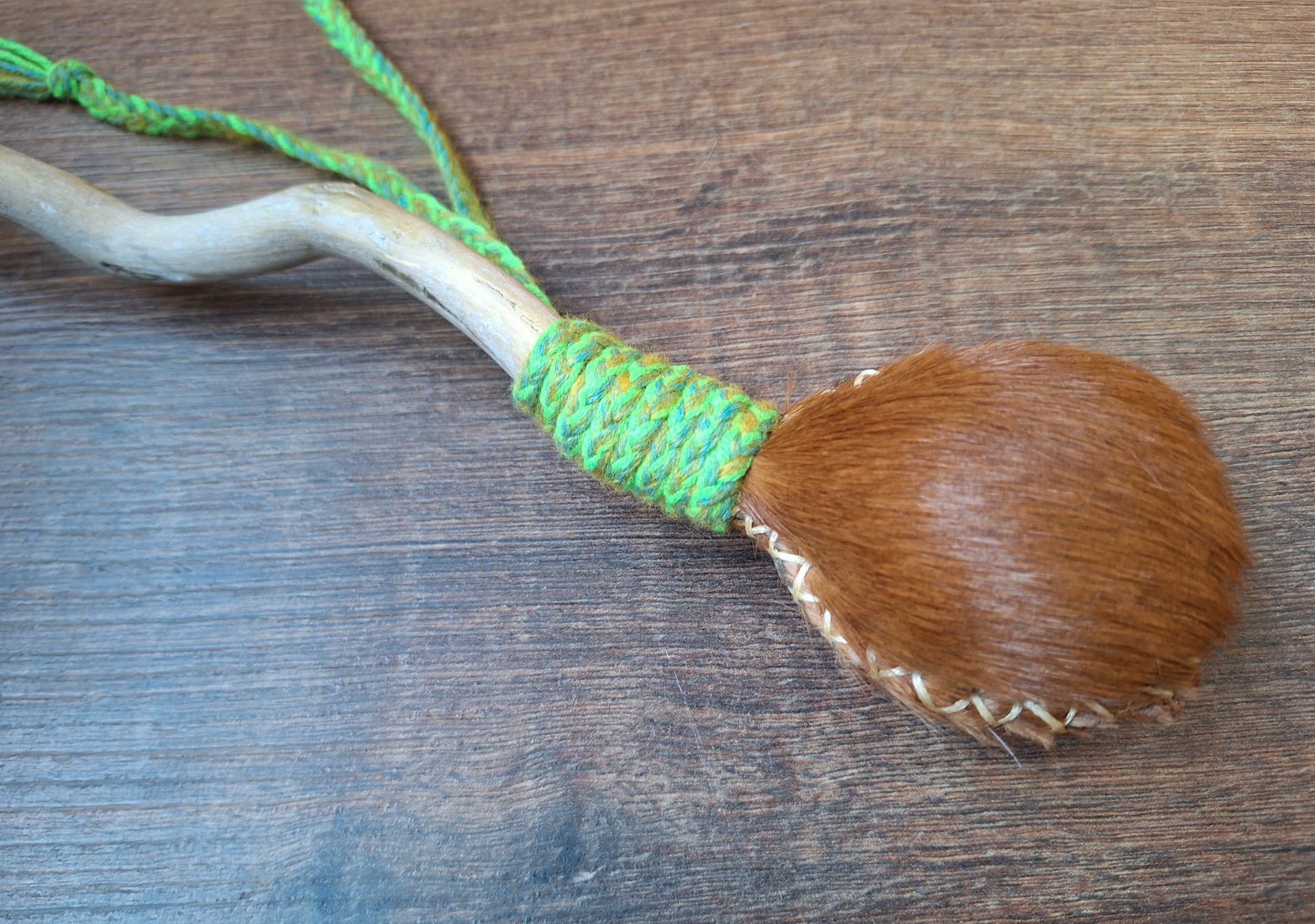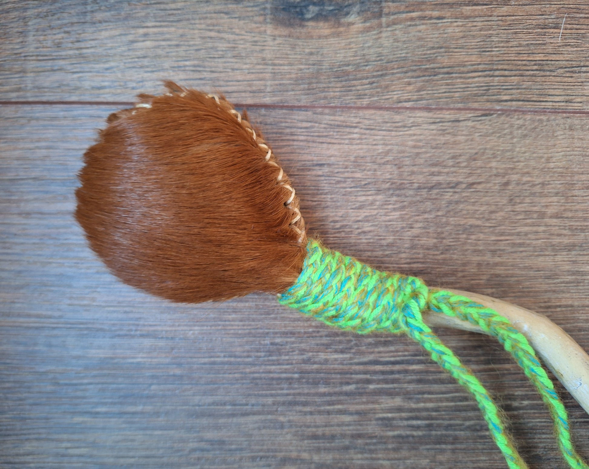 Rattle made with rawhide from a horse, acquired as scrap material from an artisan drum maker. The hide used for this rattle has a beautiful warm, copper-brown color.