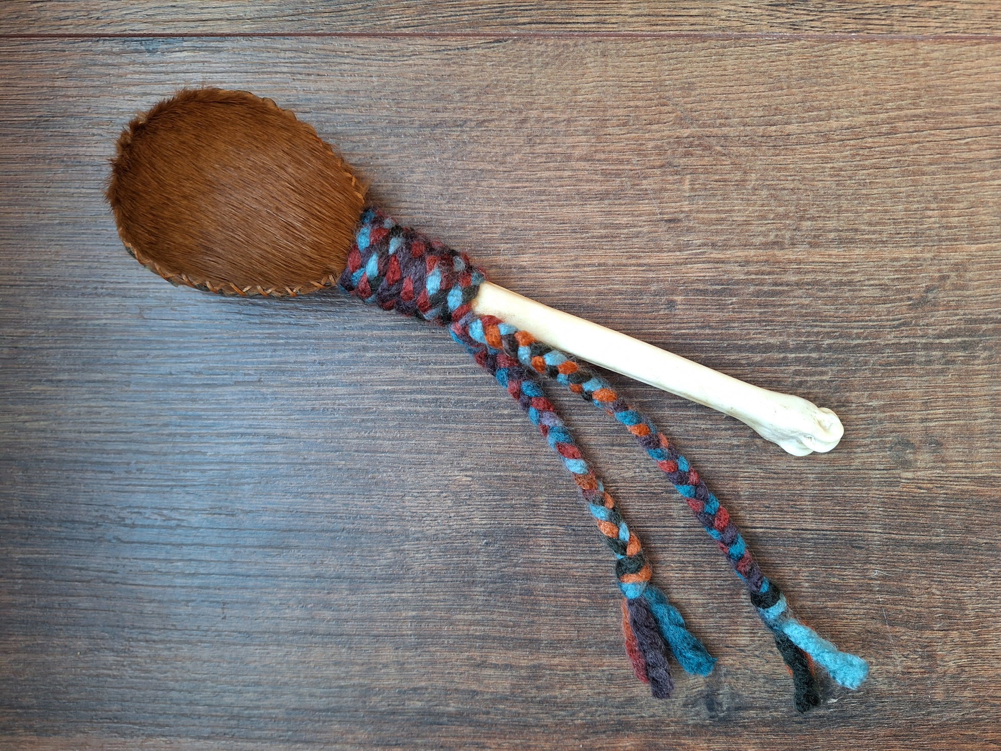 Rattle made with rawhide from a horse, acquired as scrap material from an artisan drum maker. The horse hide used for this rattle has a beautiful warm,copper-brown color.