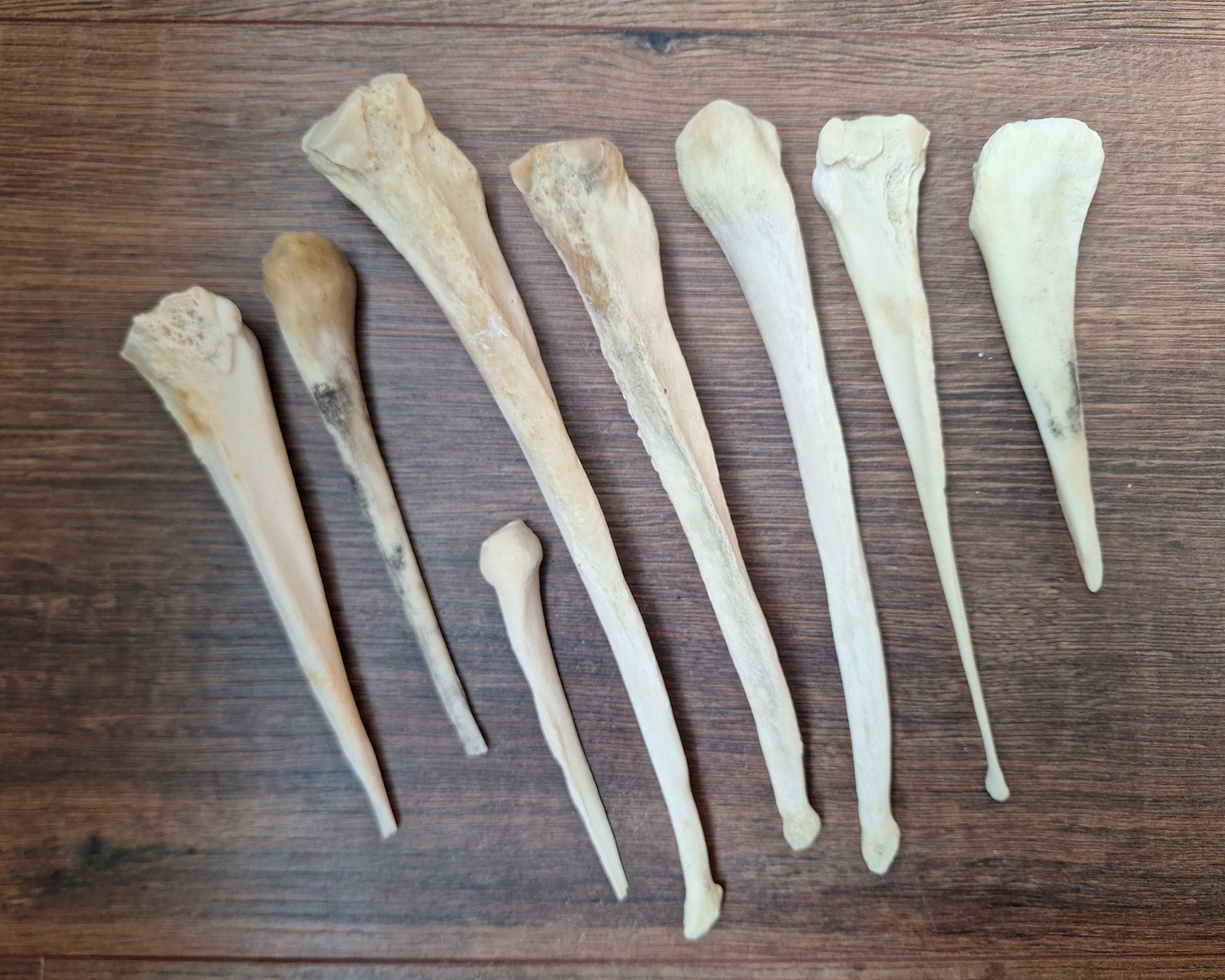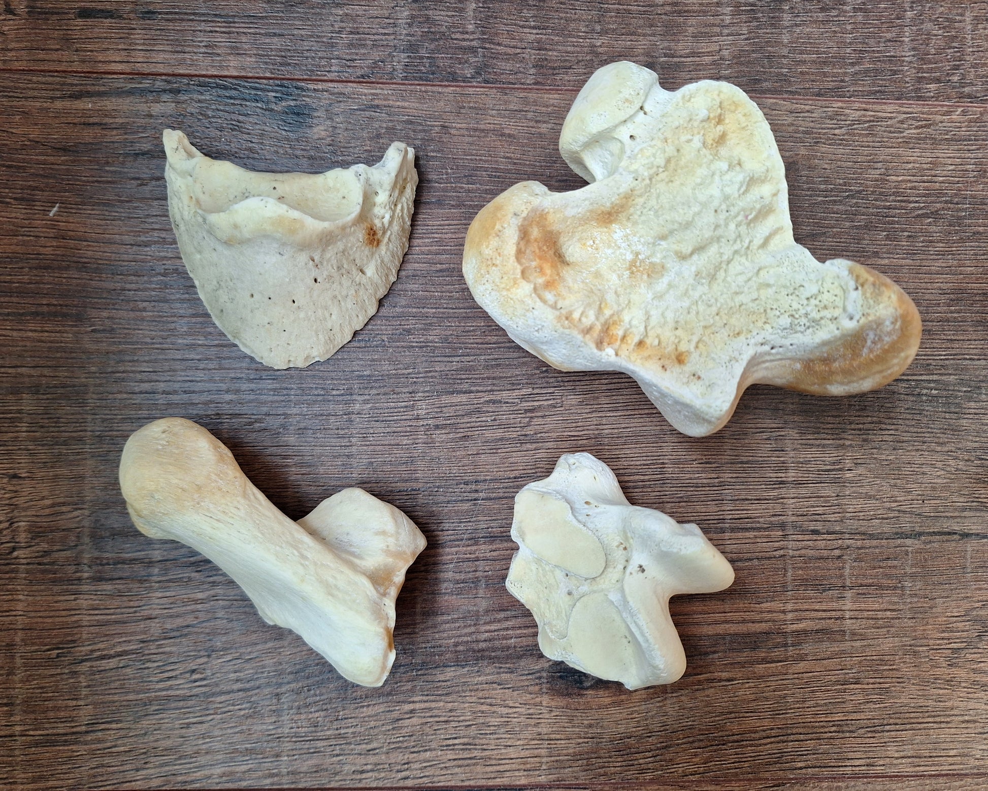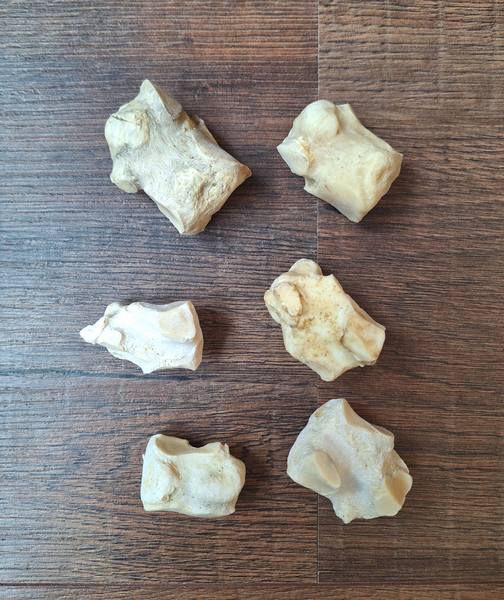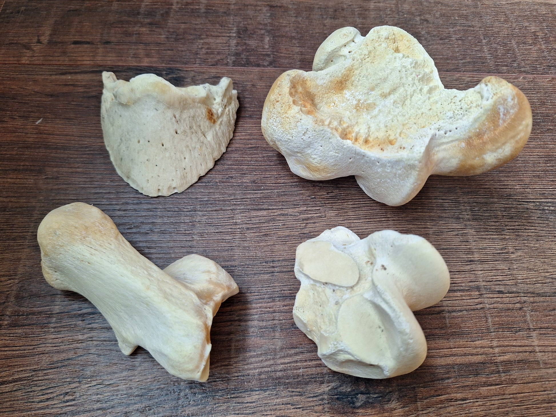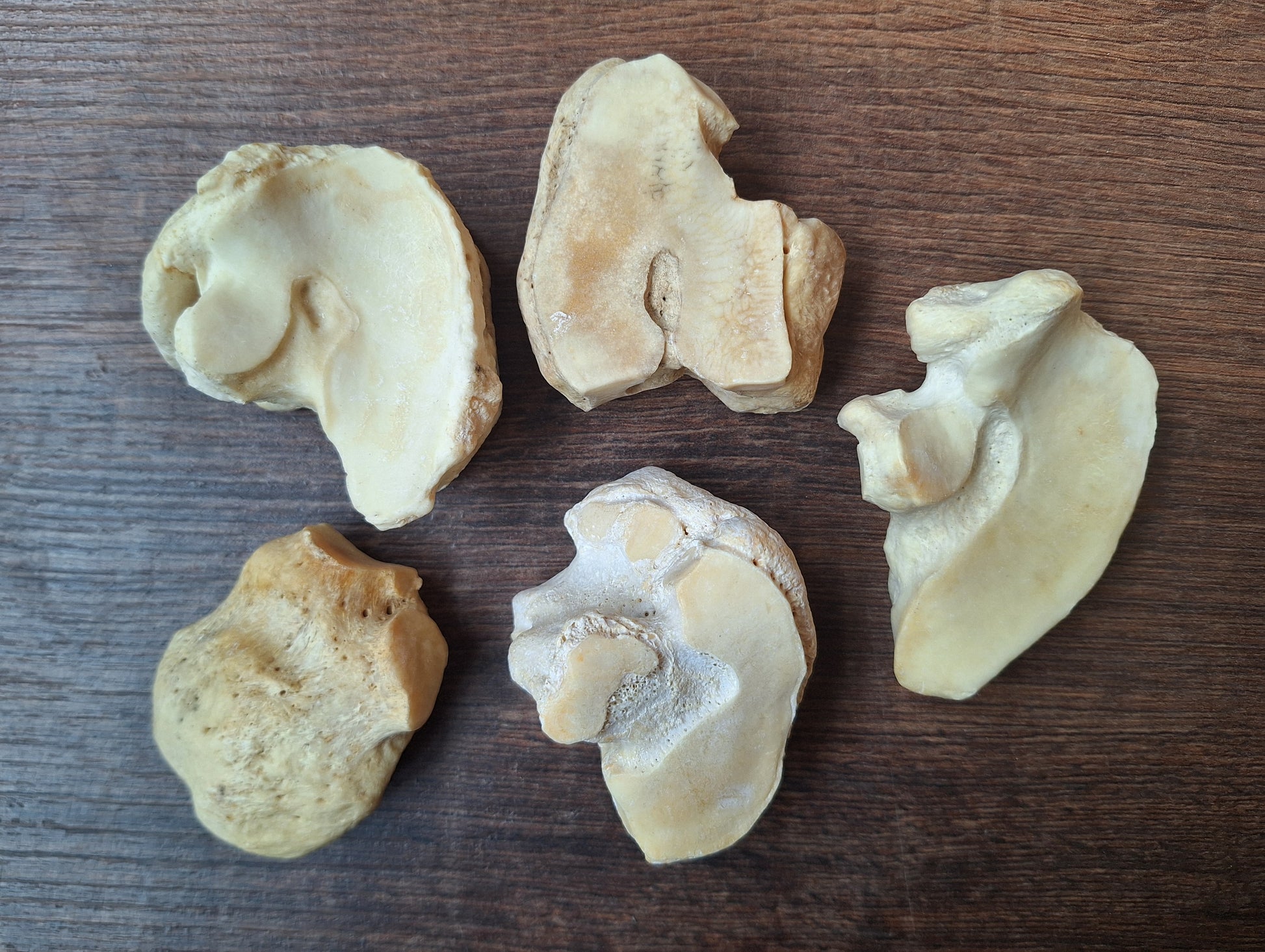 Here in our shop we offer you some sets of smaller sized horse bones for all kinds of crafting purposes. These bones all come from horses' lower legs, ankles and feet. All bones are in good condition and have been recently prepared. For an indication of the sizes; the (2) floorboards on which the bones are placed for the pictures are 24,5 centimeters wide. If you need more exact measurements for your specific purpose, of course feel free to send us a message.