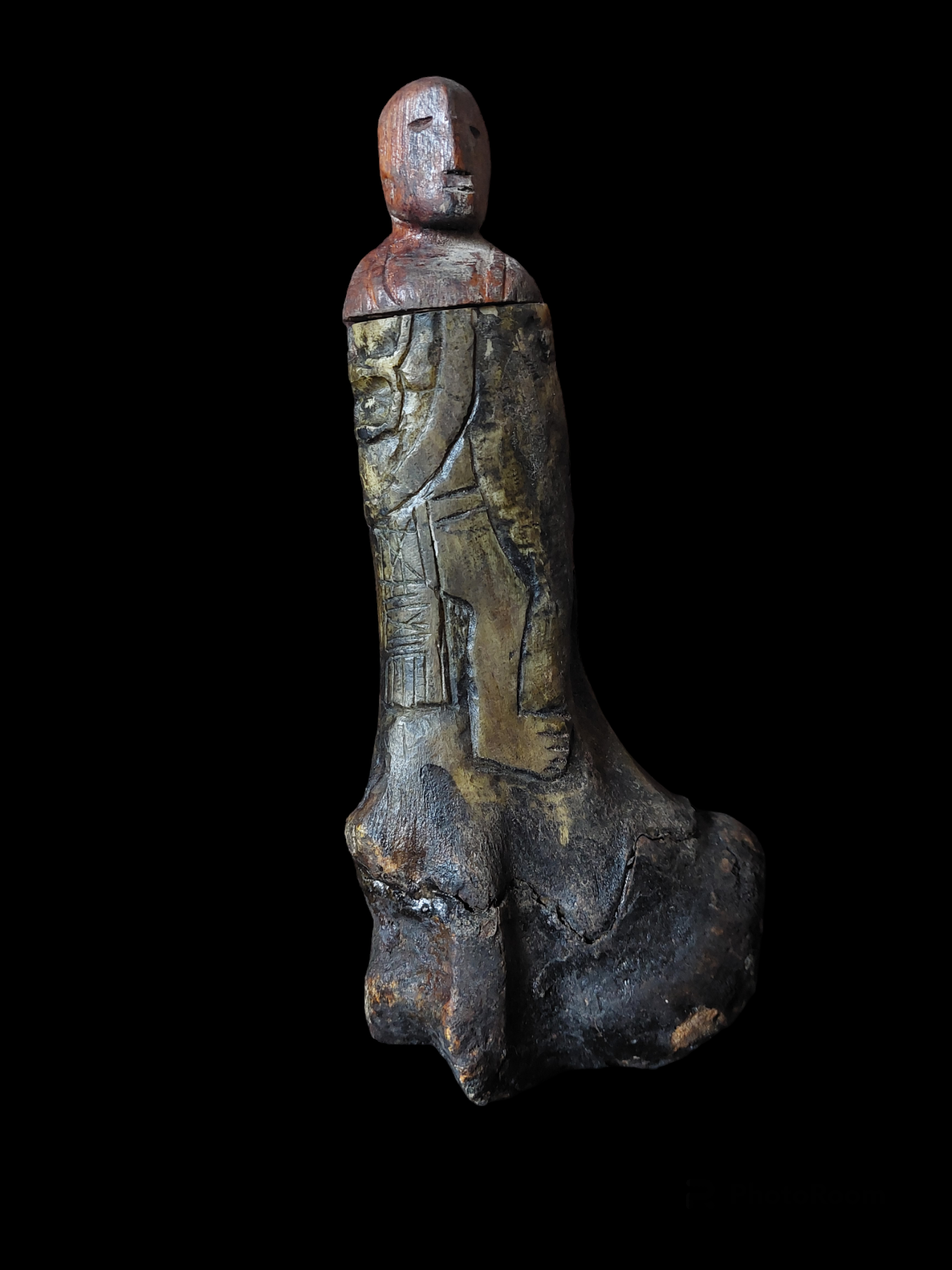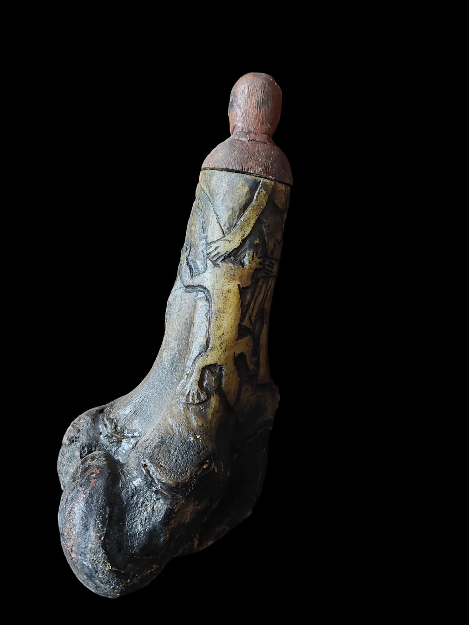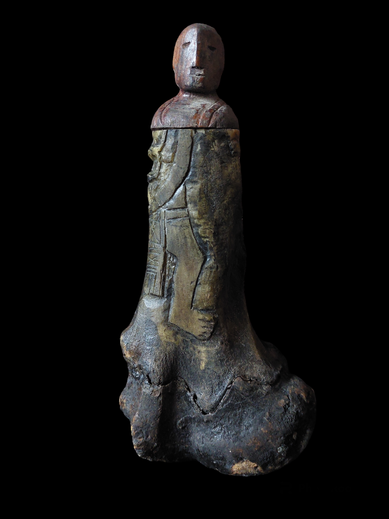 This bone container is a beautiful example of Ifugao tribal craftmanship. It is handcarved with decorations of a Bulul deity. Bulul are a special class of Ifugao ancestral spirits, they are worshipped as deities that protect the very important rice fields. In this container, the body of the Bulul deity is carved into the bone, and the head is formed by the wooden cap.