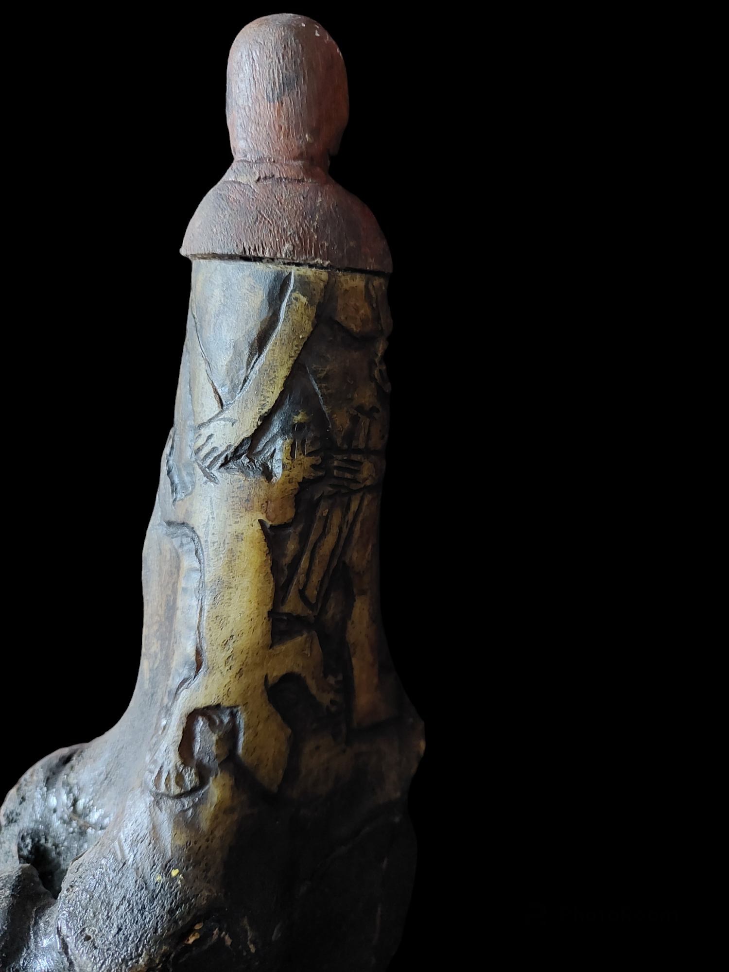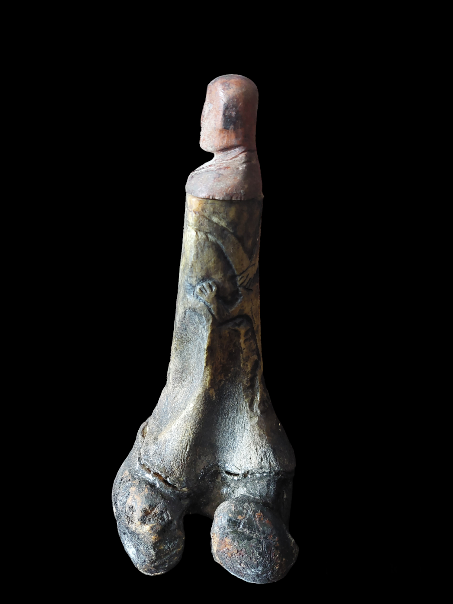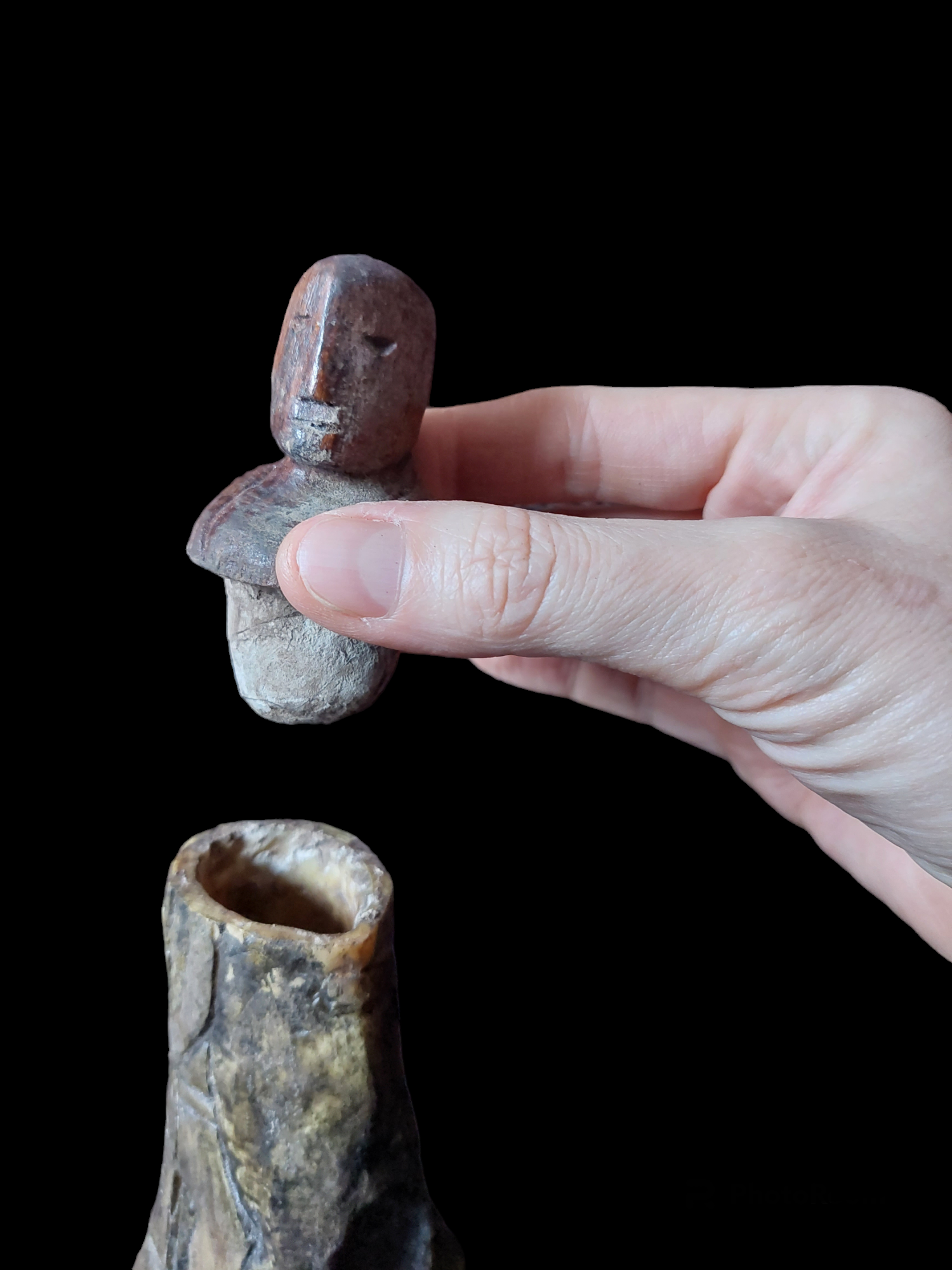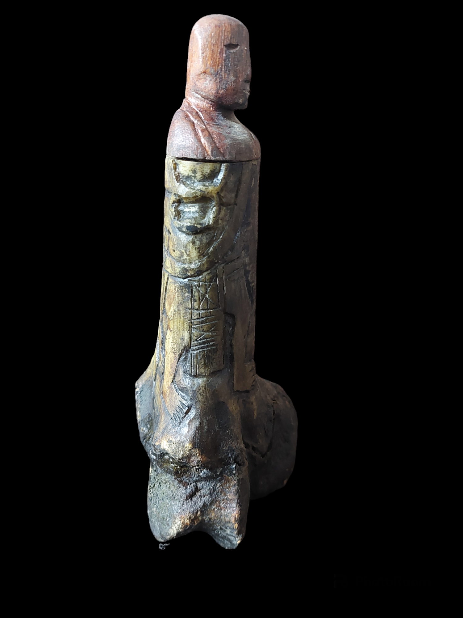 This bone container is a beautiful example of Ifugao tribal craftmanship. It is handcarved with decorations of a Bulul deity. Bulul are a special class of Ifugao ancestral spirits, they are worshipped as deities that protect the very important rice fields. In this container, the body of the Bulul deity is carved into the bone, and the head is formed by the wooden cap.