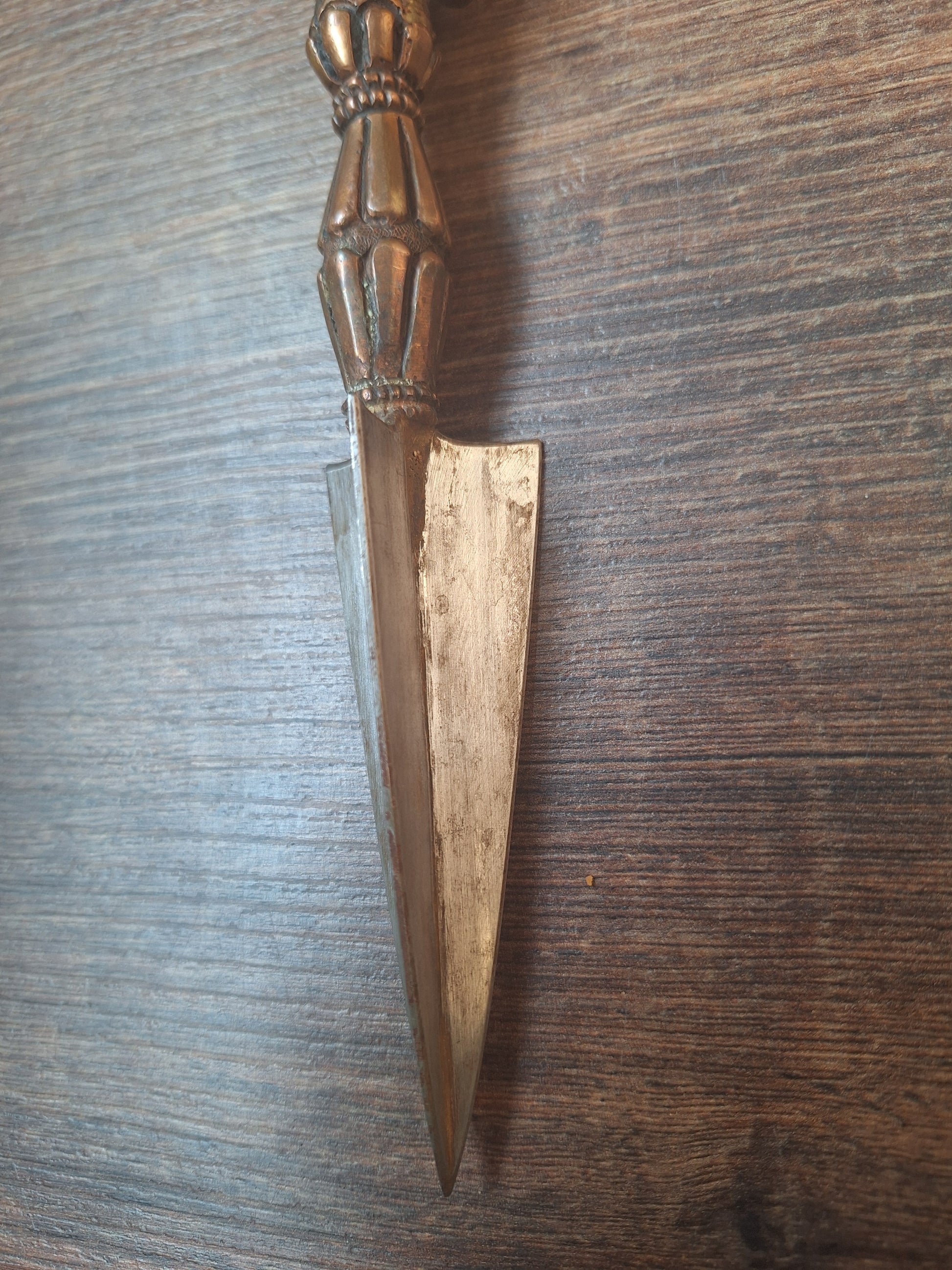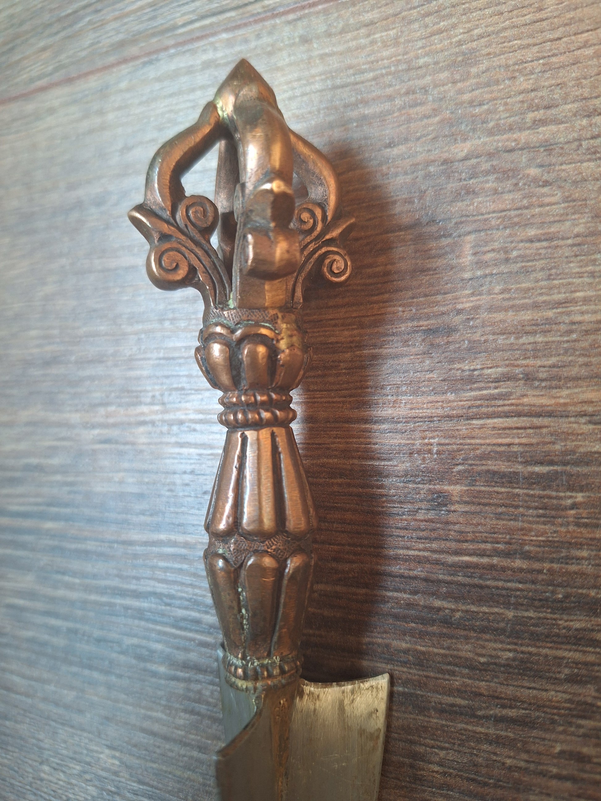 Pommel and handle are made of red copper and show a dorje symbol, a widespread symbol in the iconography of both buddhism and hinduism. The word 'dorje' (or in Sanskrit 'vajra') translates both as 'lightning bolt' and as 'diamond'. The dorje symbolizes the true nature of the universe and reality; the endless, ultimate emptiness in which all possibilities exist. As both a meditative symbol and (physical) ritual attribute it supports in 'cutting through the crap of the mind', finding a clear path through the diversions of the 'monkey-mind' and ego-chatter, seeing what's real and what's not. The dorje is said to destroy all kinds of ignorance and in this way helps in gaining true insights.