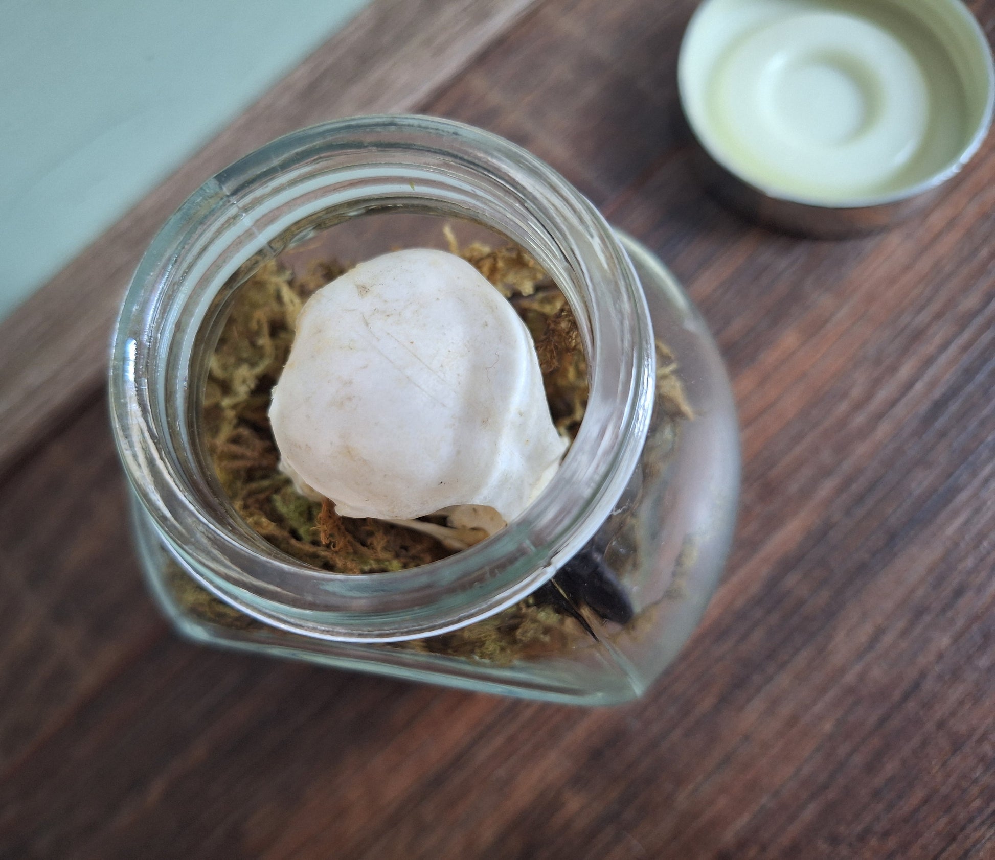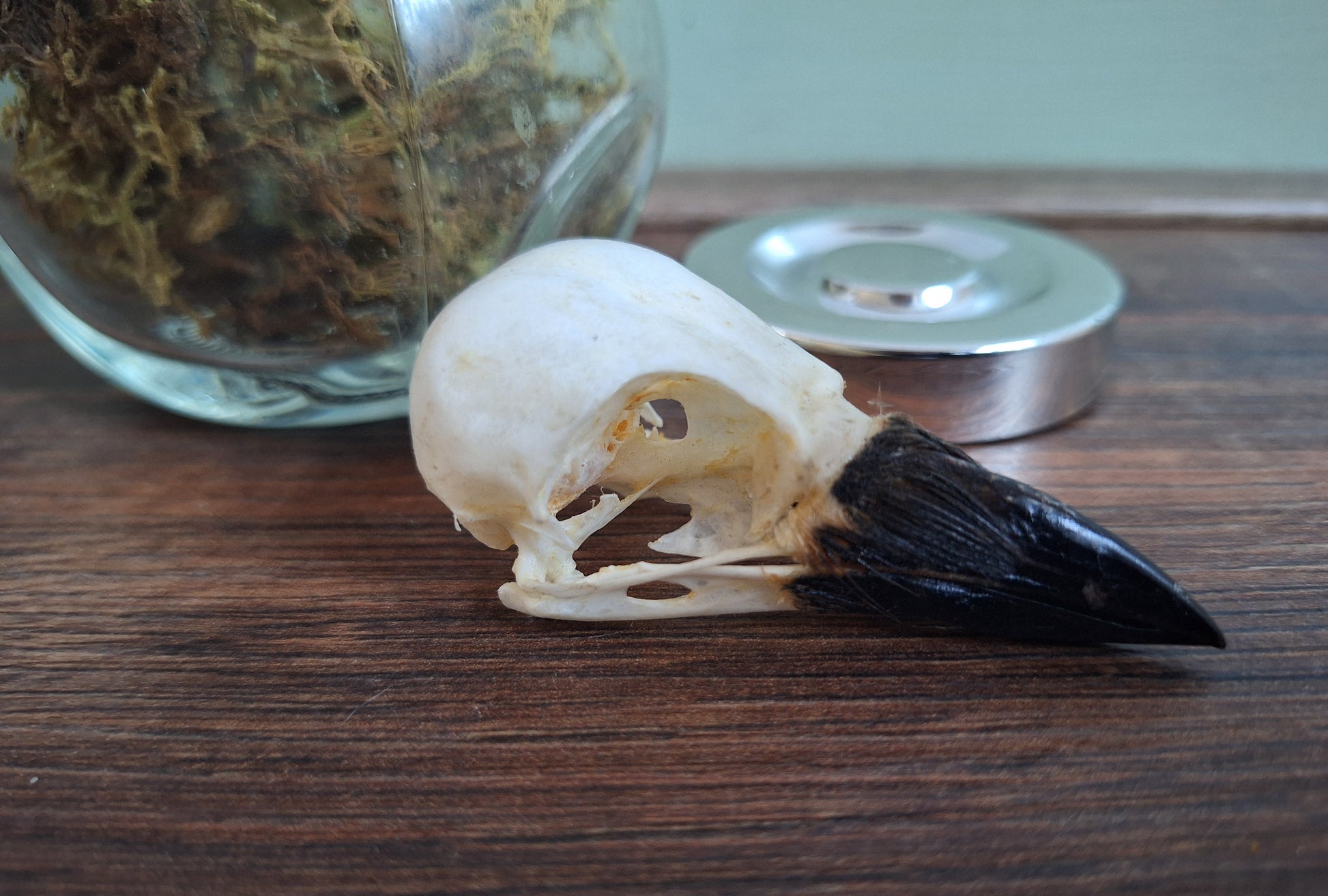 Skull from a jackdaw in a nice little glass jar with some decorative moss. In very good condition.