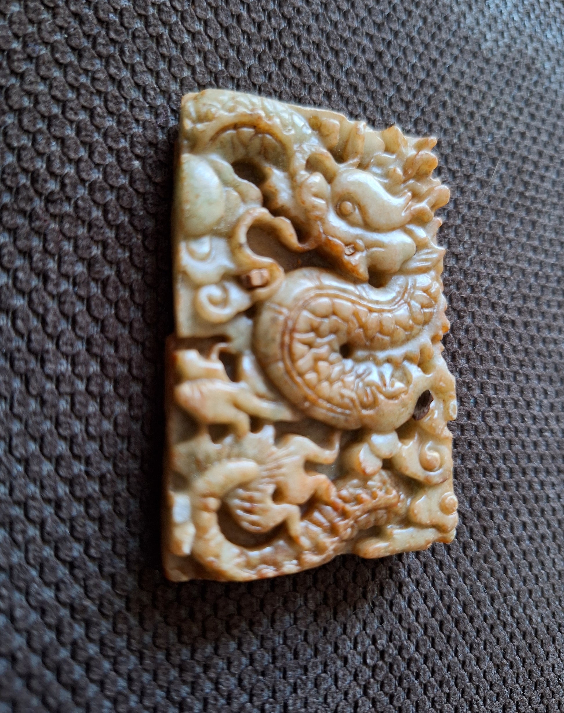 Very nice pendant with the depiction of a Chinese dragon, meticulously carved in a piece of light orange-brown jade.