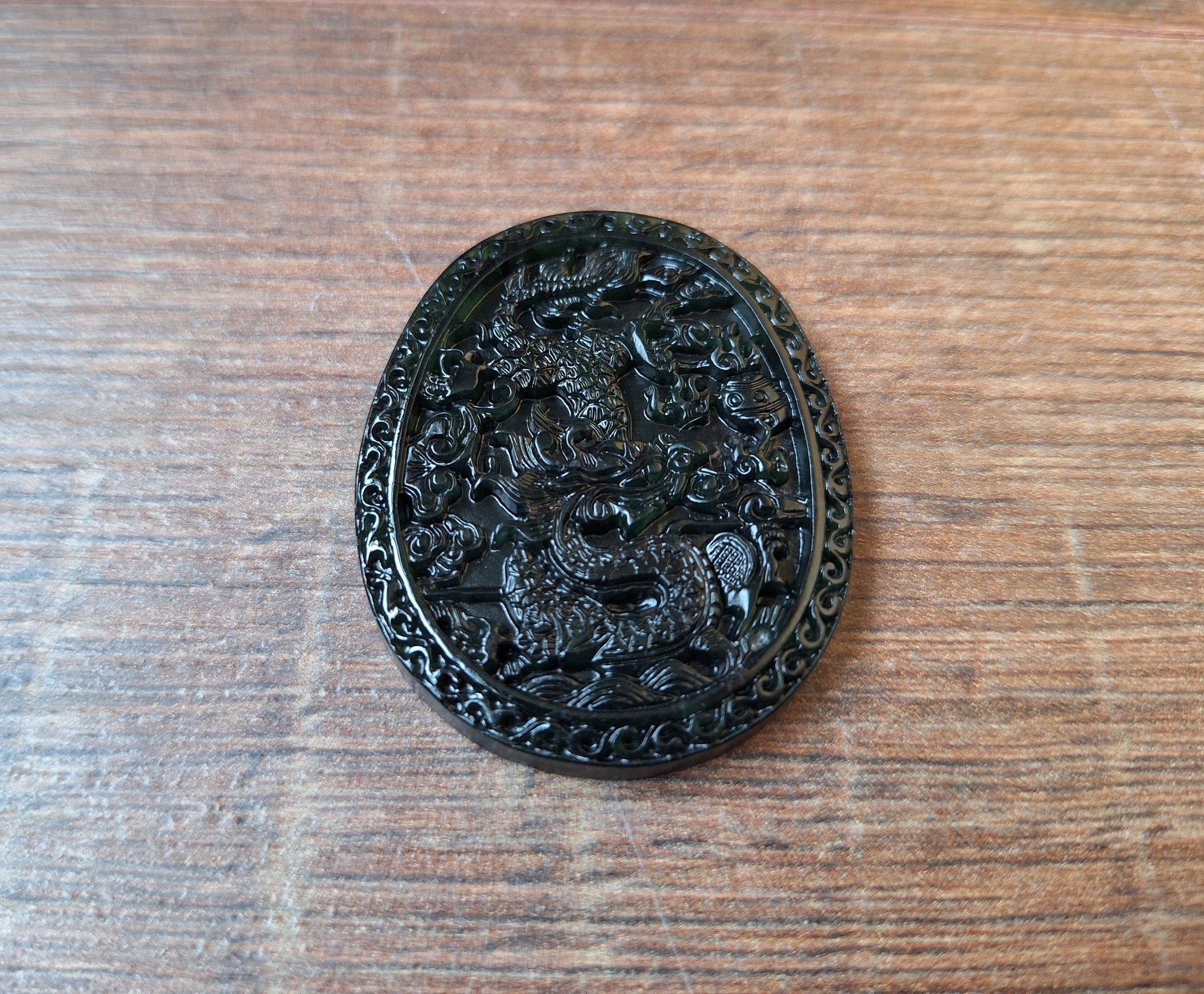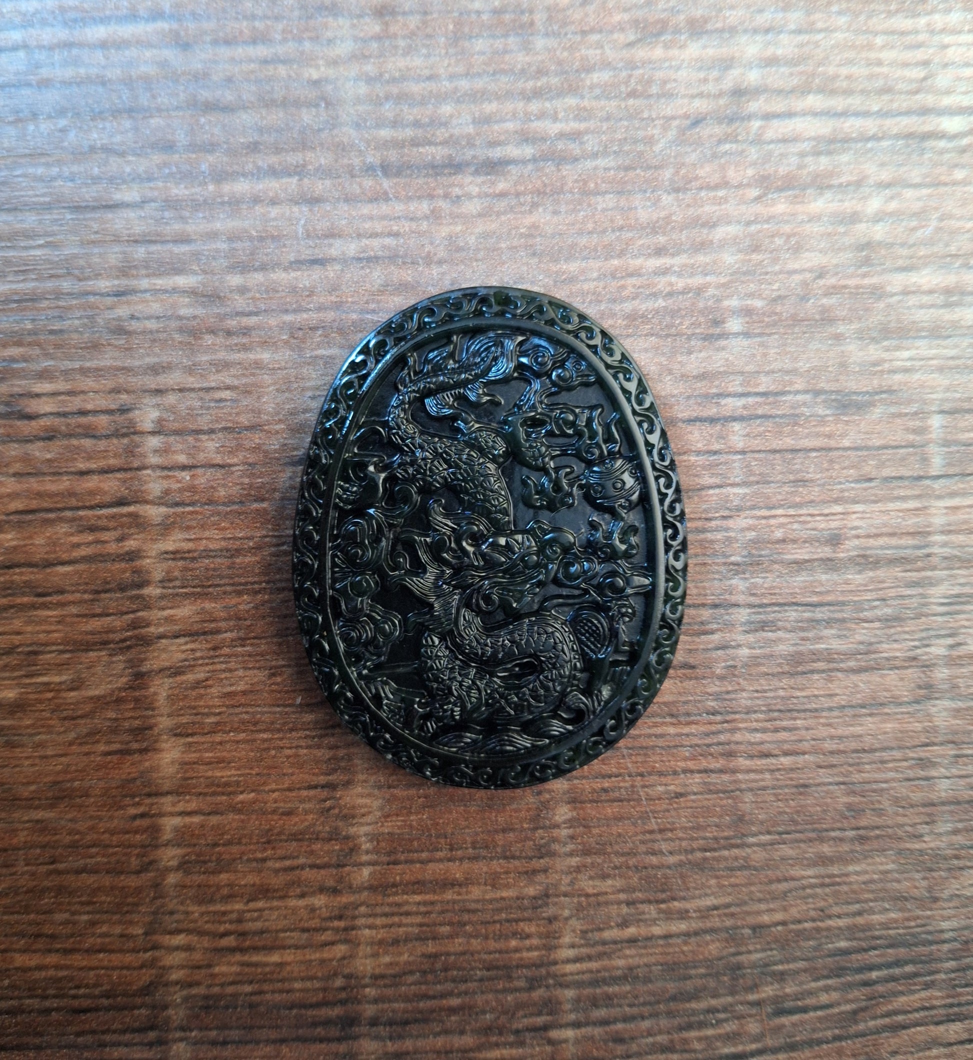 Very nice, recently made pendant with the depiction of a Chinese dragon, meticulously carved in a piece of dark green jade. When held up to the light, the jade shows its beautiful semi-transparent character in a bottle-green color with some darker spots.