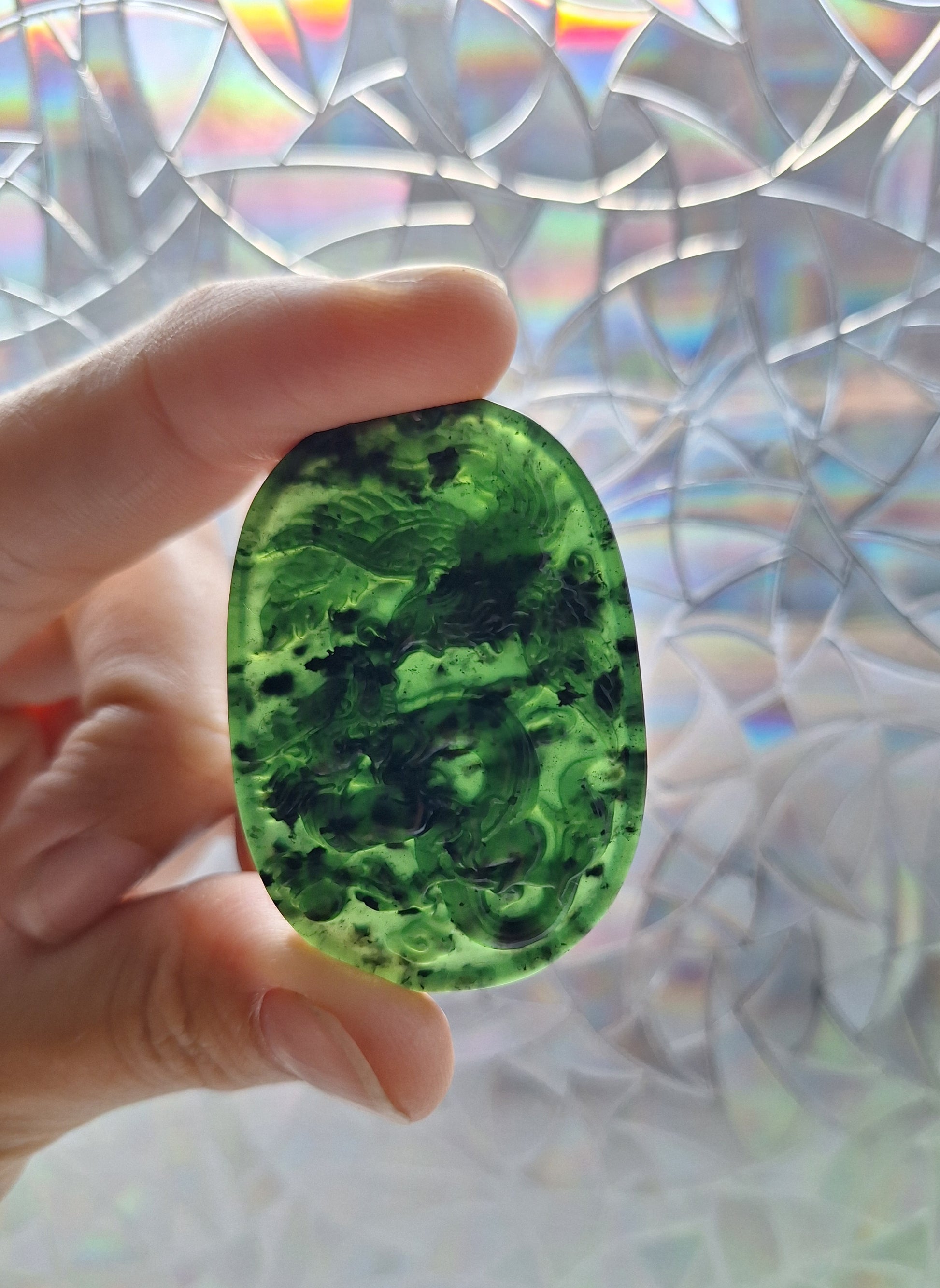 Very nice, recently made pendant with the depiction of a dragon and phoenix, meticulously carved in a piece of dark green jade. When held up to the light, the jade shows its beautiful semi-transparent character in a bottle-green color with some darker spots.