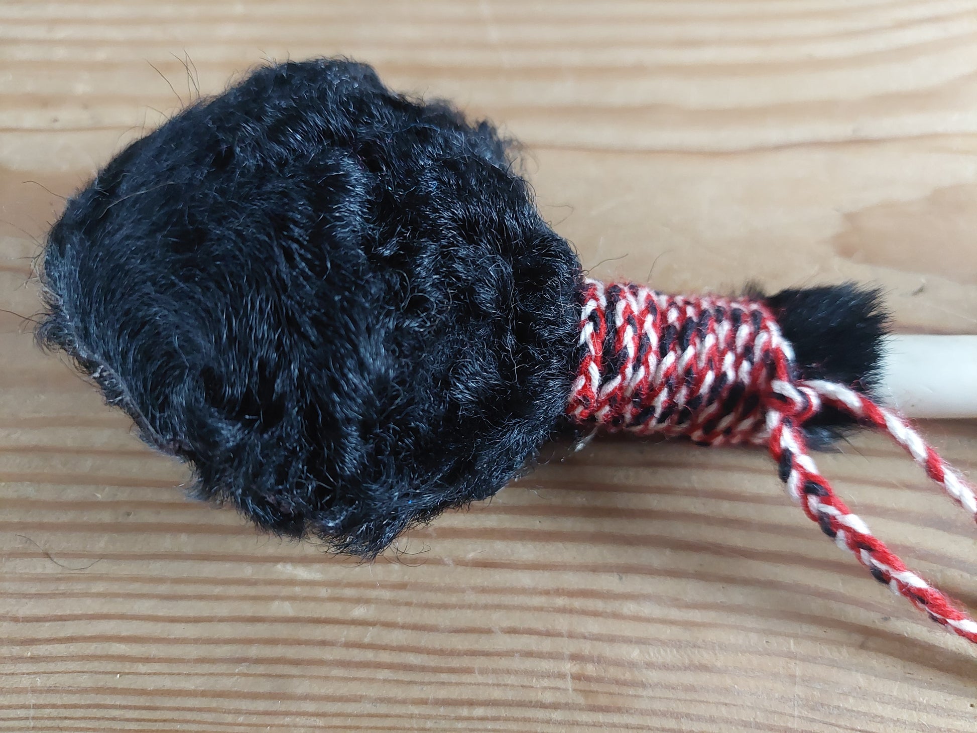 The rattle is decorated with a braid, made with 6 strands of cotton cord in the colors red, black and white. During the braiding, only the best of intentions and blessings were put in.