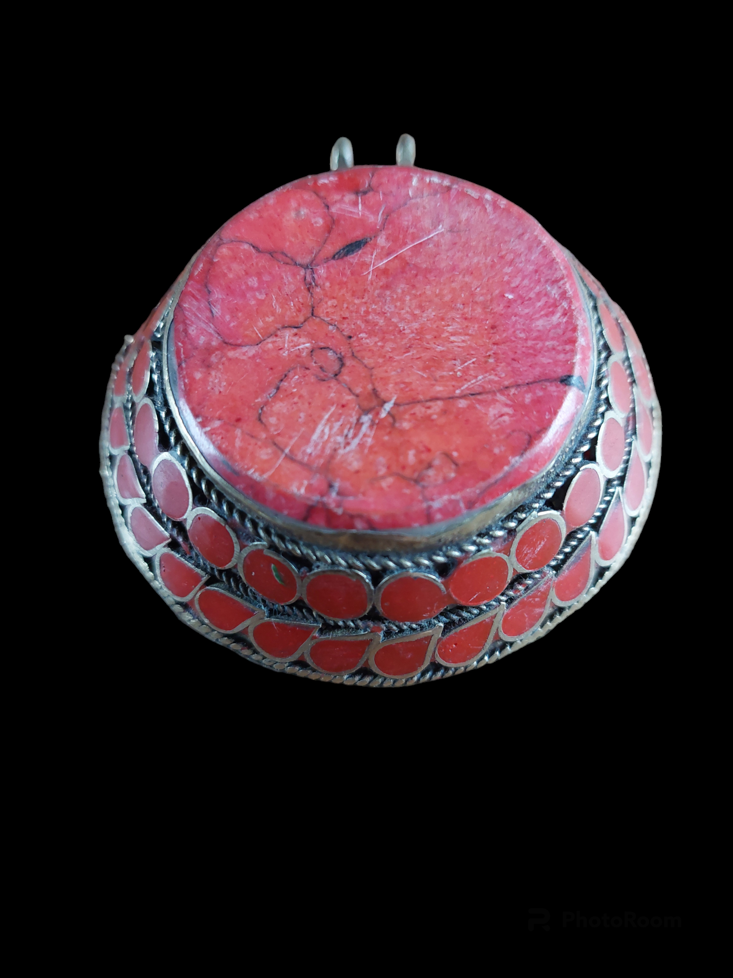 This beautiful and big pendant is made with Tibetan silver and red howlite, mimicking the appearance of coral.