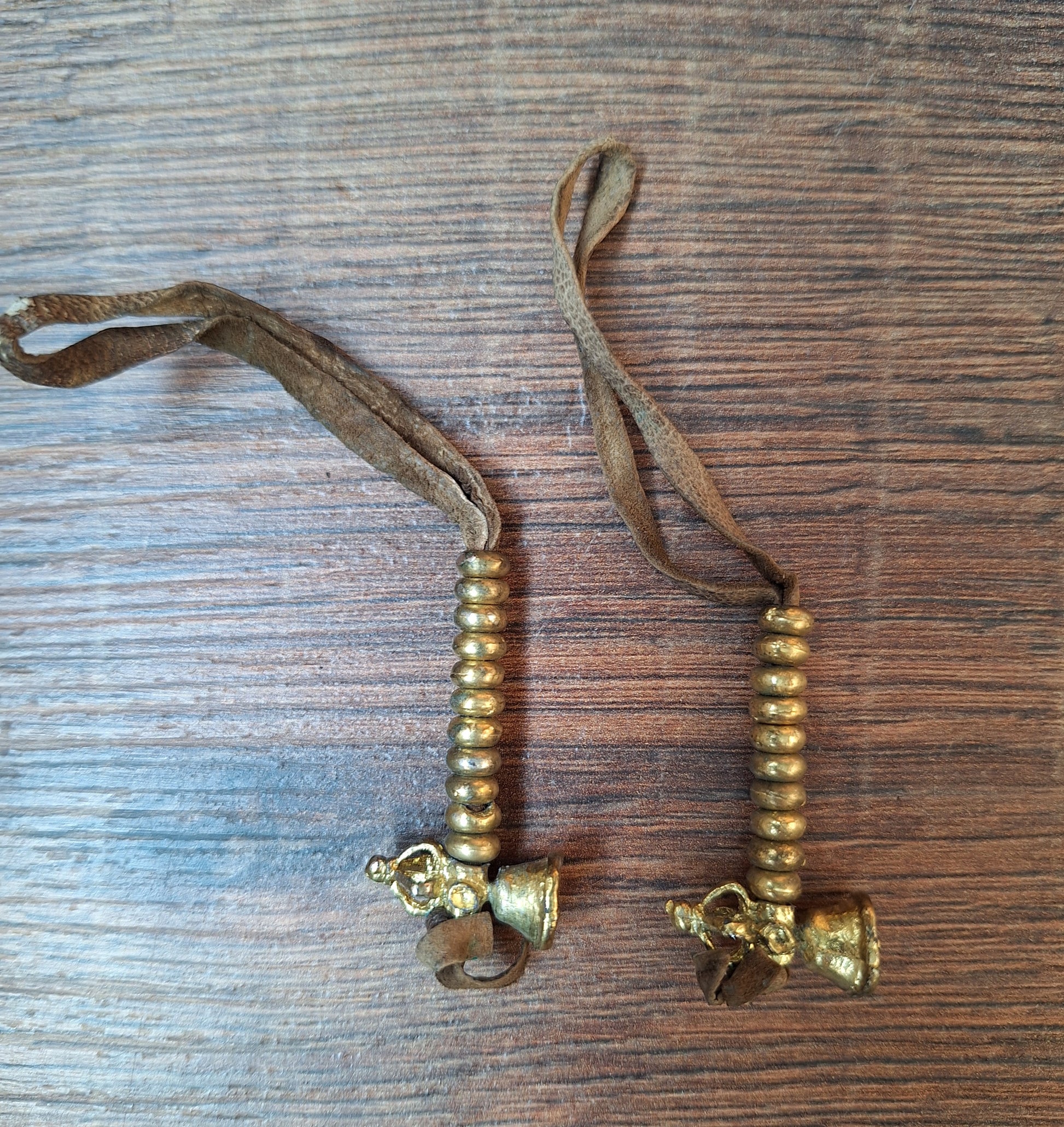 These counters are made with soft, light brown yak leather cords on which some gold painted alpaca metal beads and pendants (of a bell with dorje) have been strung. The pendants are 22 millimeters wide. Total length of each counter is approximately 10 centimeters. Weight is approximately 11 grams per counter.
