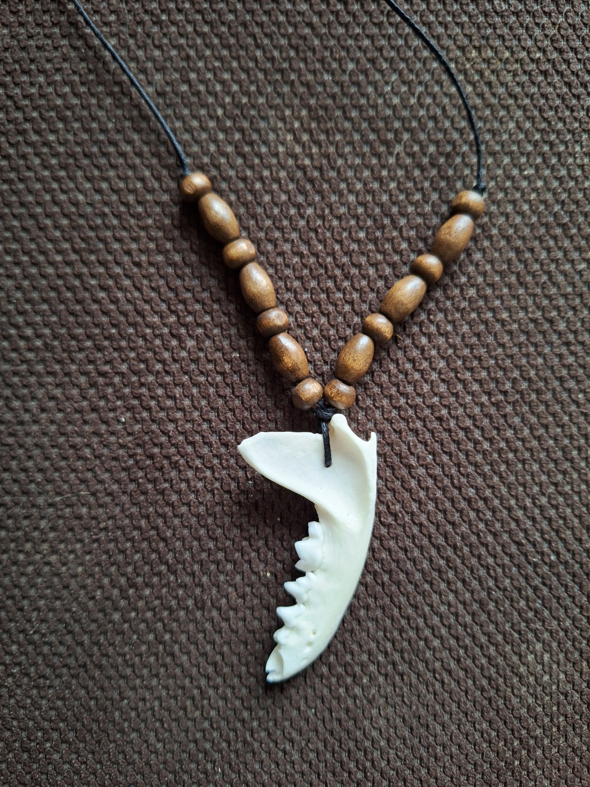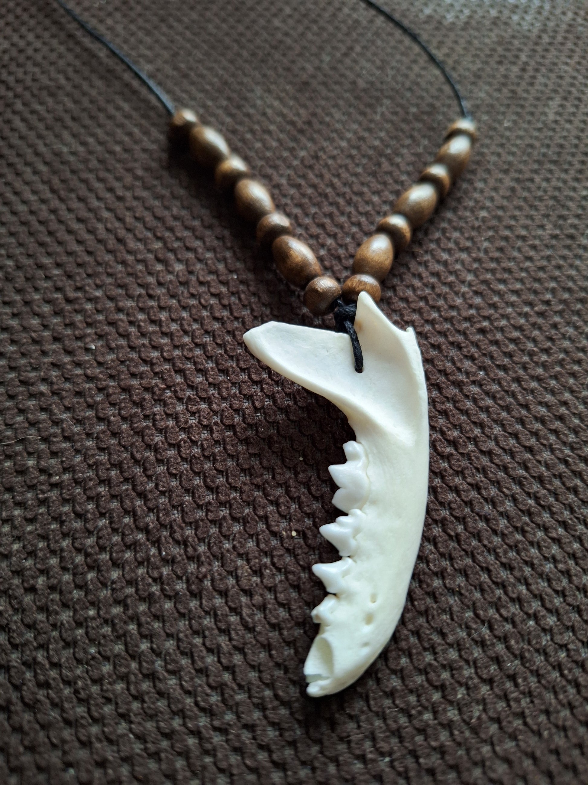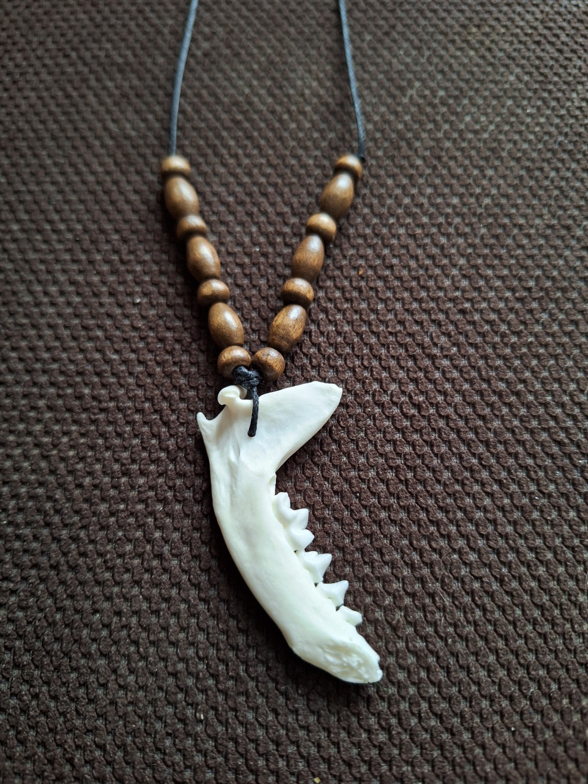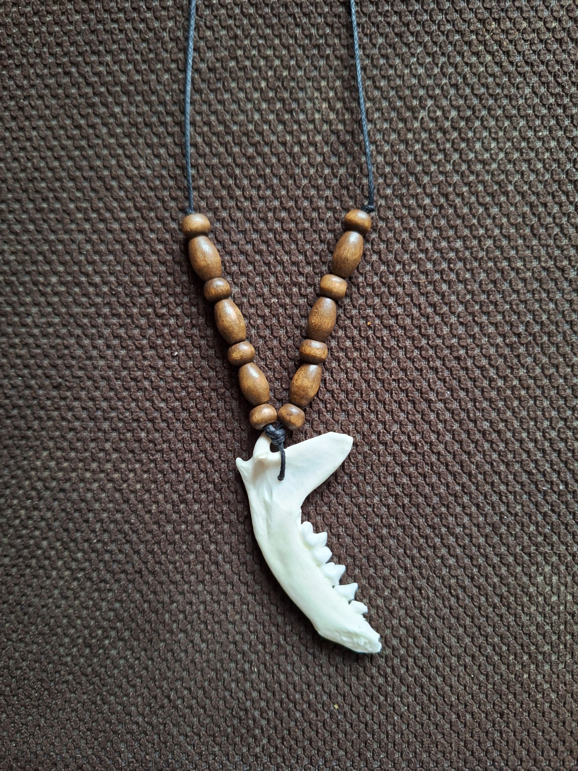 Amulet necklace made with a jaw bone from a marten. The jaw bone has been strung on black wax cord together with some re-used wooden beads, taken from old necklaces.