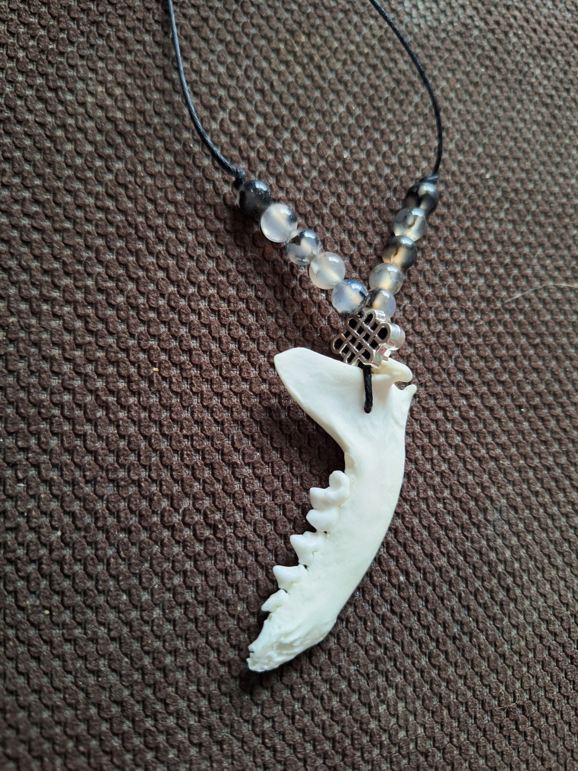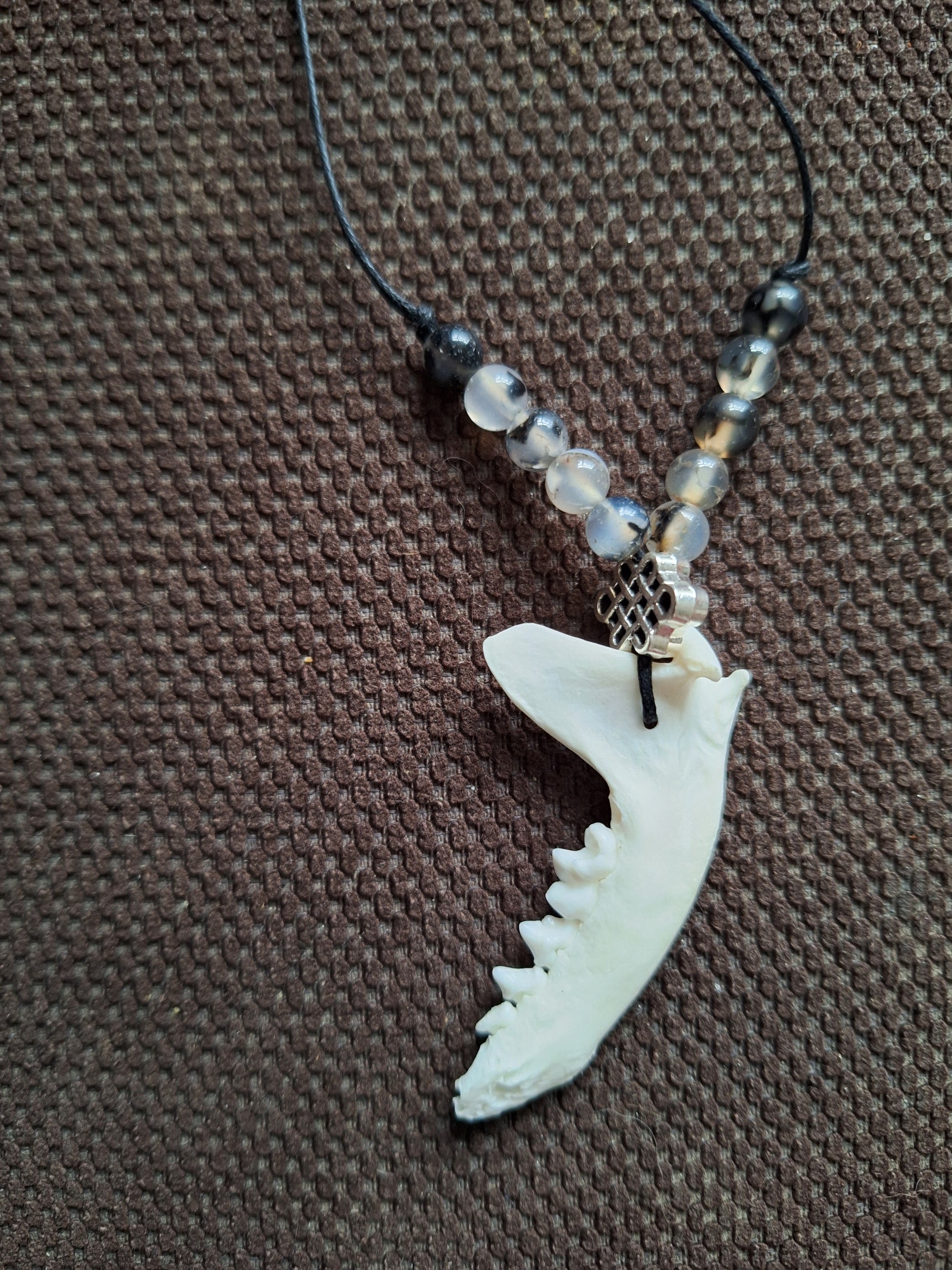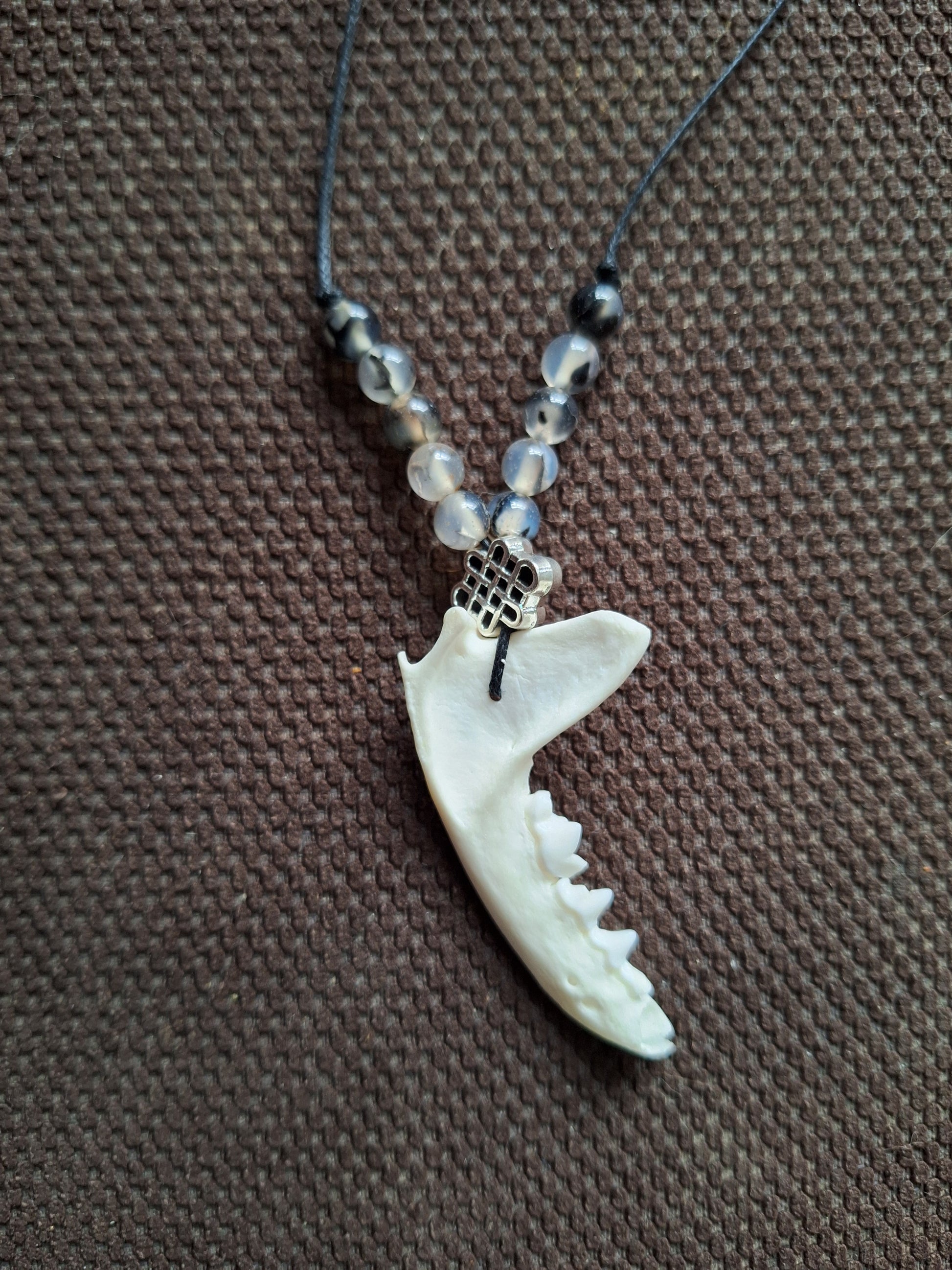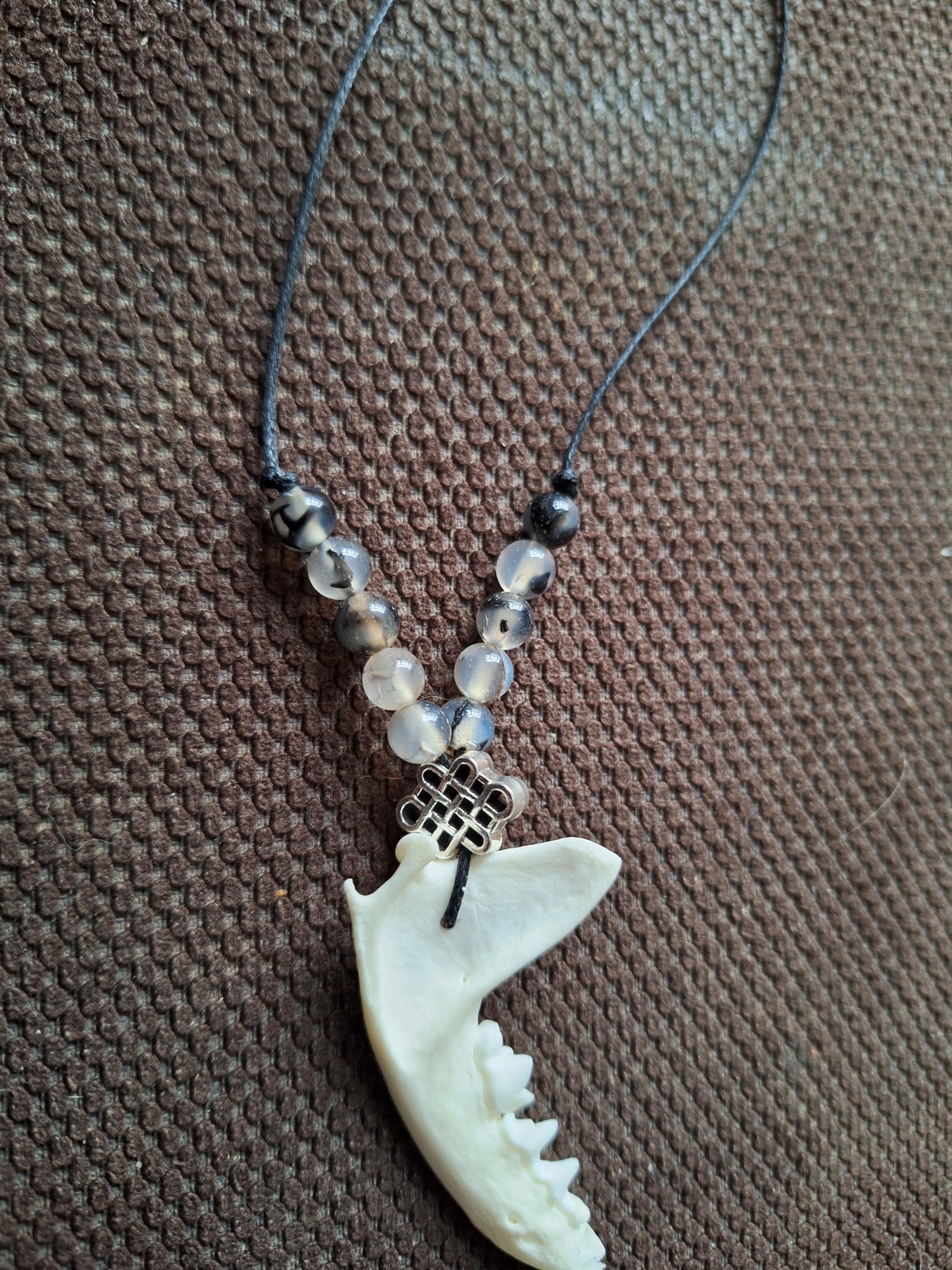 Amulet necklace made with a jaw bone from a marten. In this necklace the jaw bone has been combined with (natural stone) black & white dragon veins agate beads and a silver colored metal pendant with the symbol of an endless knot.
