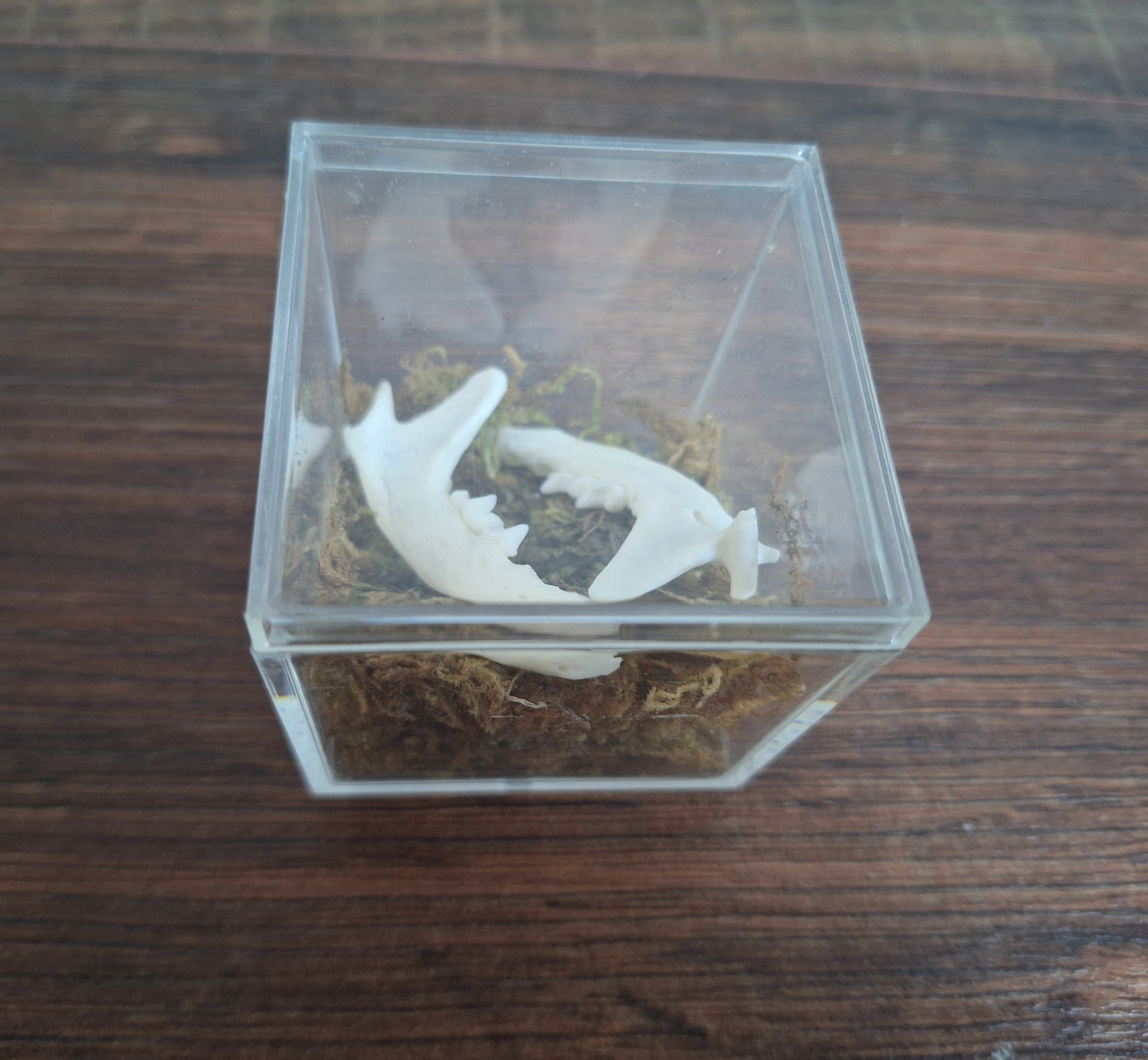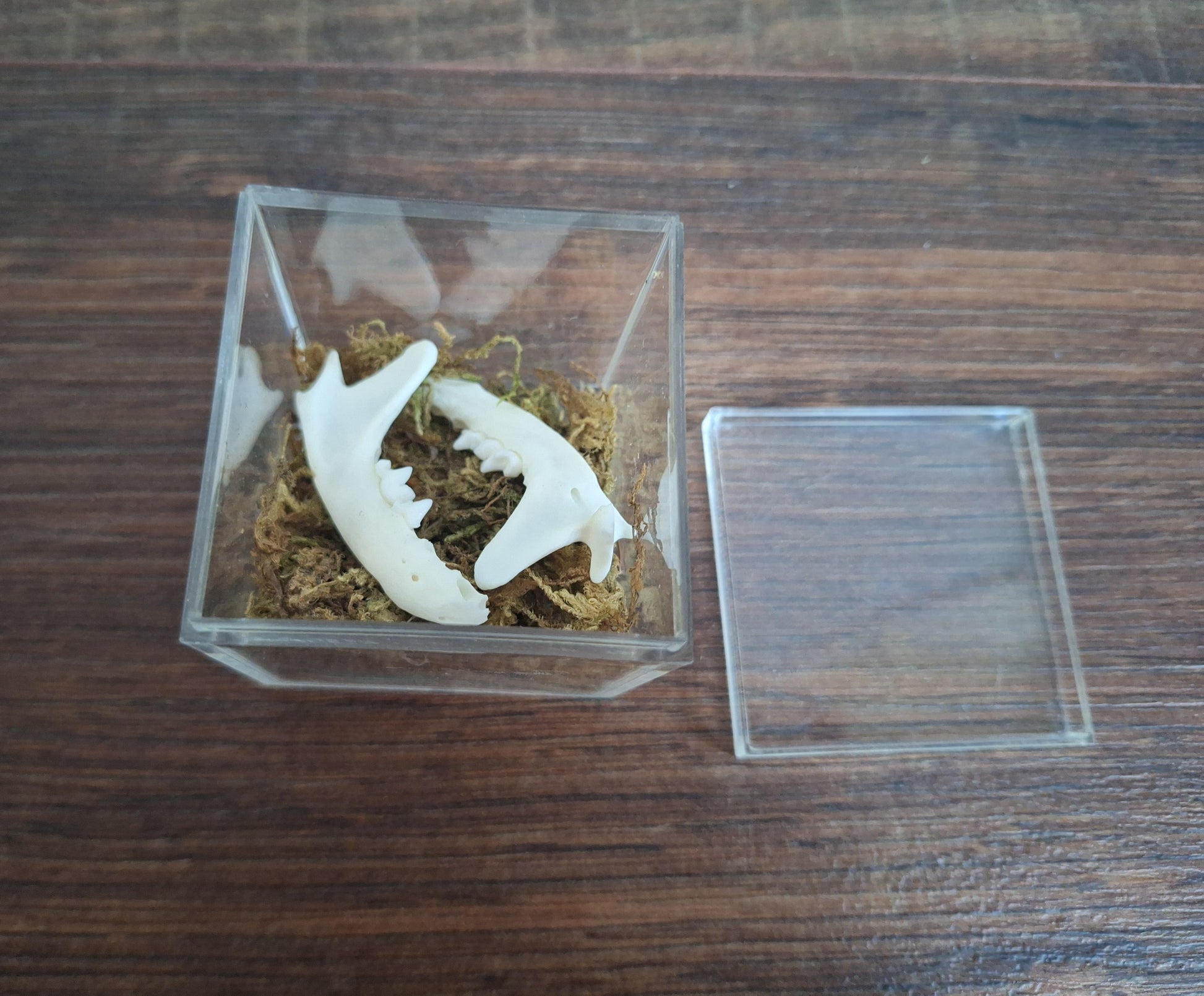 Set of lower jaws from a stone marten in a plastic display cube with some decorative moss.