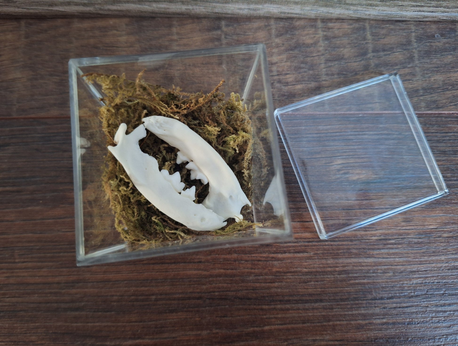 Set of lower jaws from a stone marten in a plastic display cube with some decorative moss.