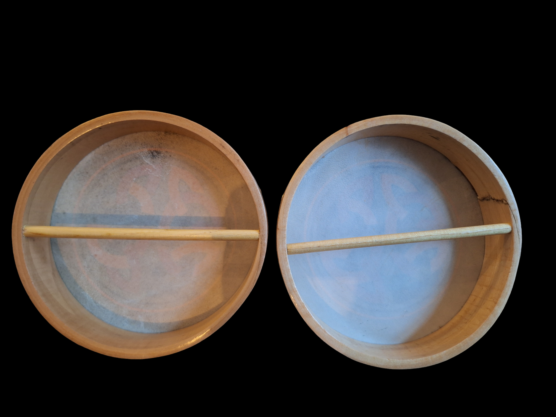 Please note; these drums are not from particularly high quality. This shows for example in how the decoration has been made on it; the celtic knot symbol is not handpainted, but printed on it. And of course, drums in this very small size (8 inch / 20,5 centimeters diameter) don't have a very resonant voice.