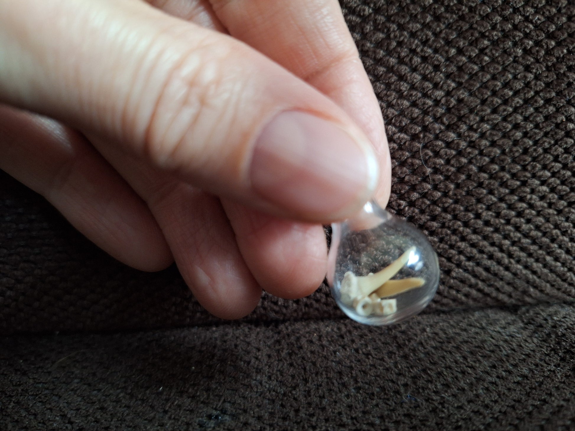 Miniature glass bottle filled with a few small fossilized shark teeth and some tiny shark vertebrae.