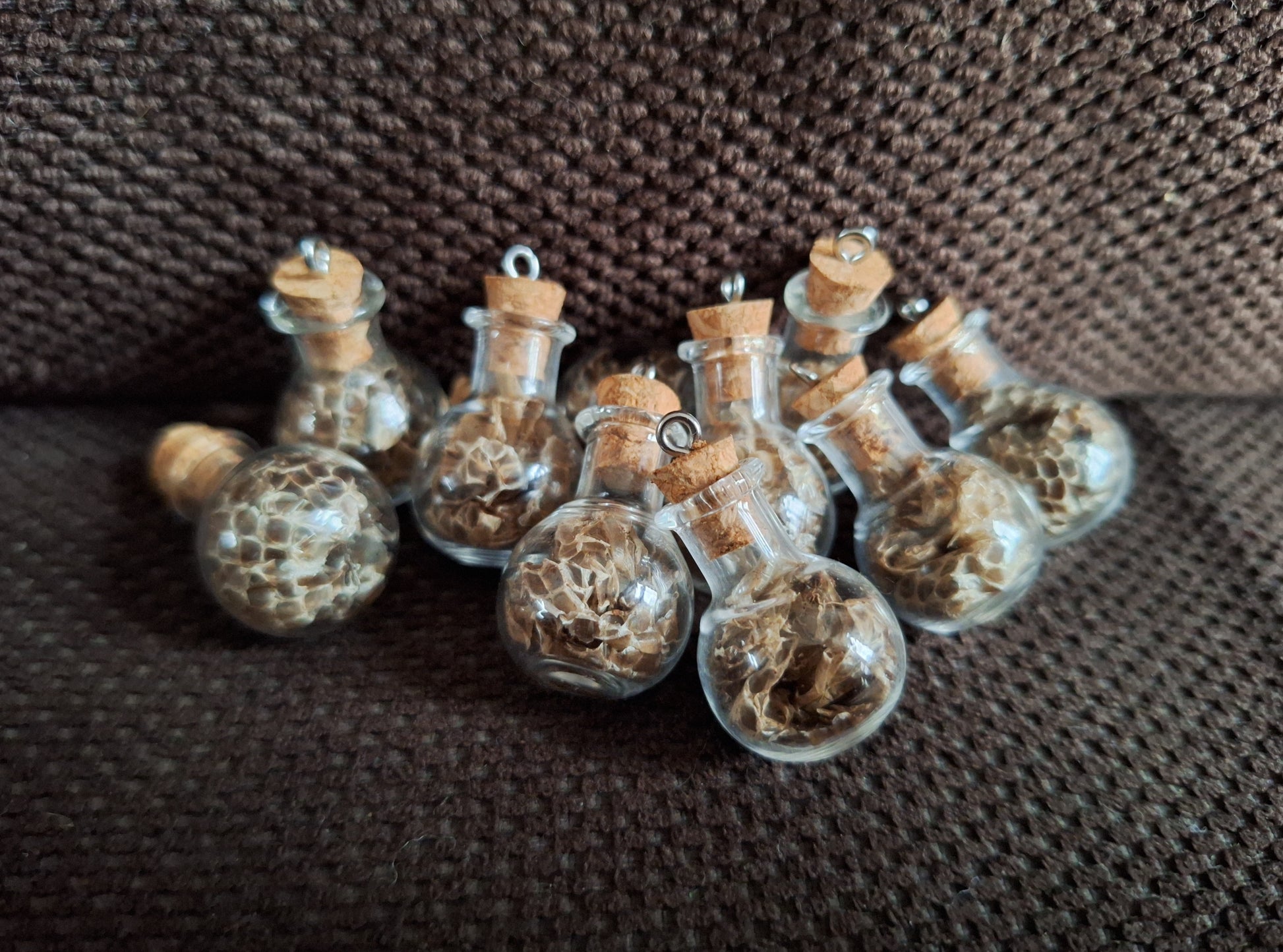 Miniature glass bottles filled with a piece of shedded snake skin.