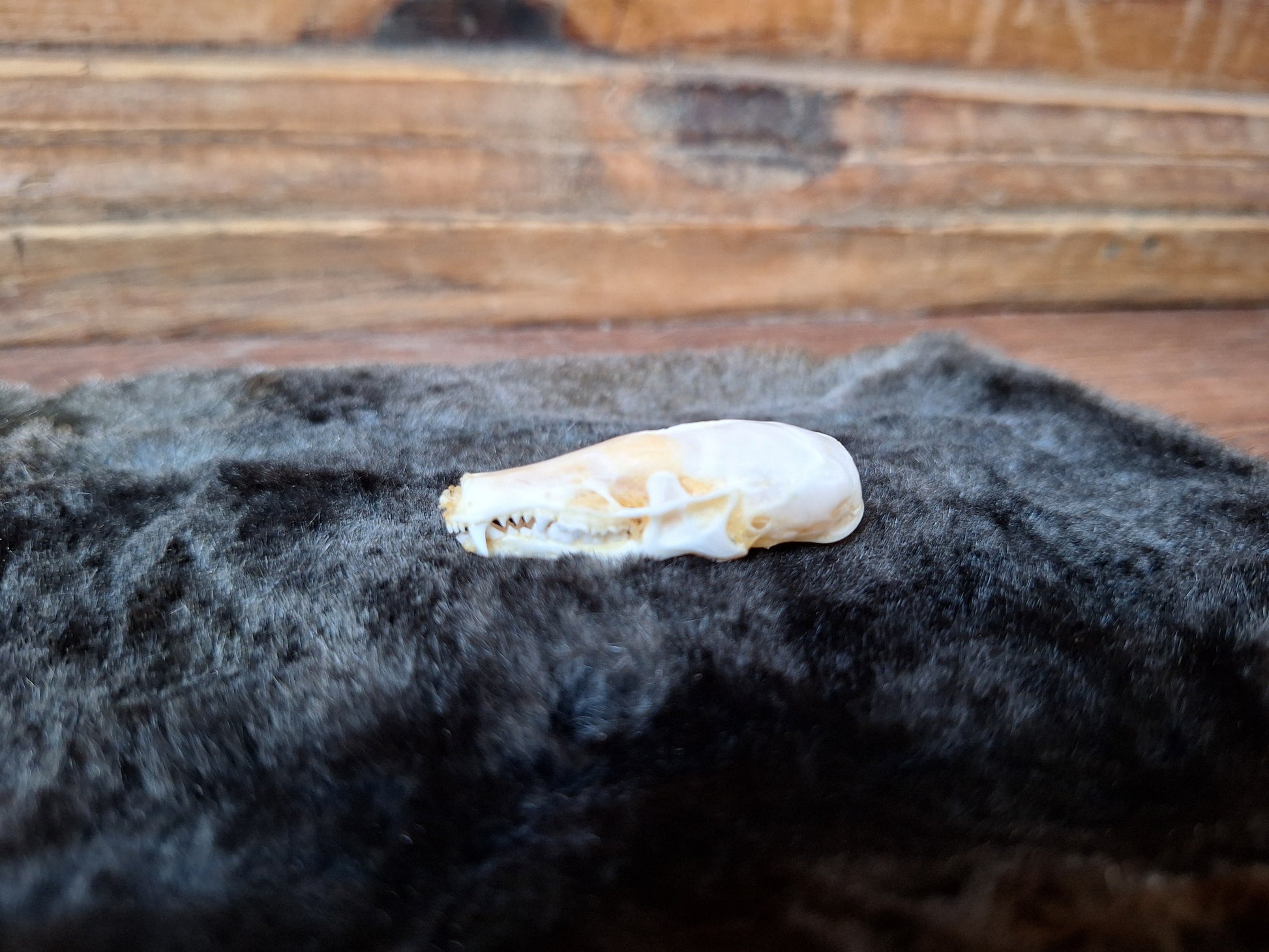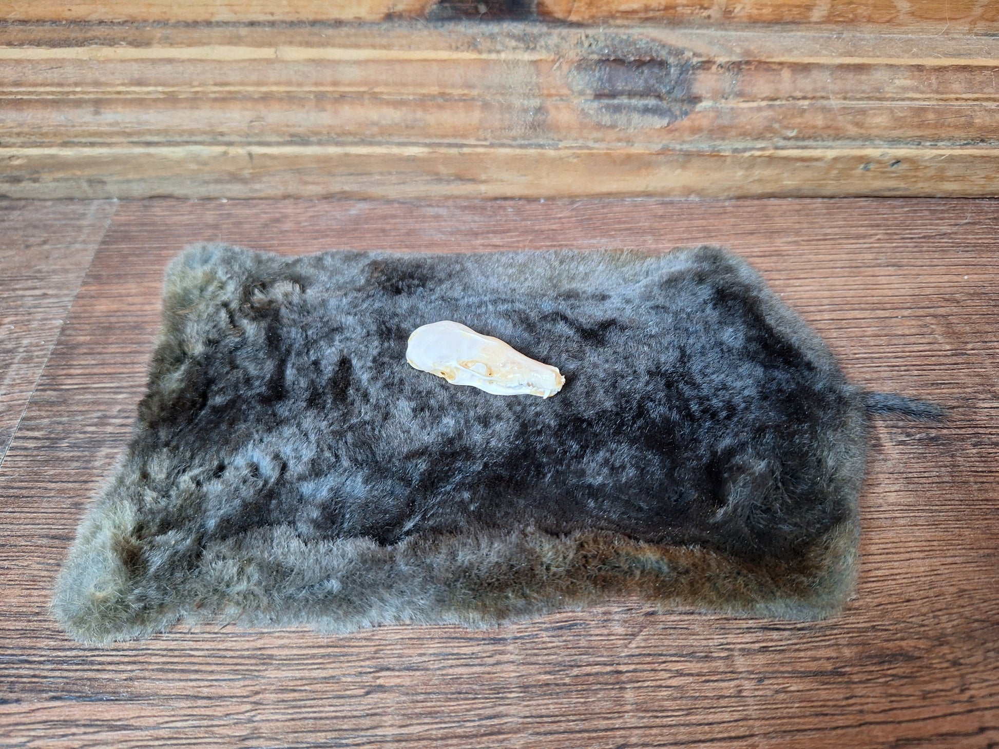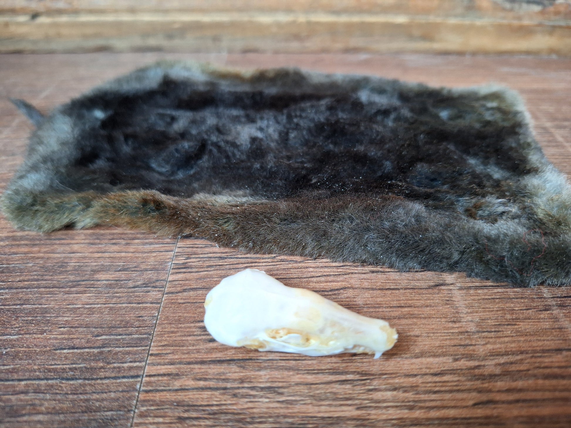The skull is in good condition and measures approximately 38 millimeters long and 18 millimeters wide. The hide is prepared in a simple way by scraping, cleaning and salting it, resulting in a hide that's rigid when it's dry. If you want to mold it into the shape of some personal crafting project, you can you soak it in water to make it flexible again, then shape it and let it dry again. The hide measures approximately 15 centimeters long (measured without the tail) and 8,5 centimeters wide.