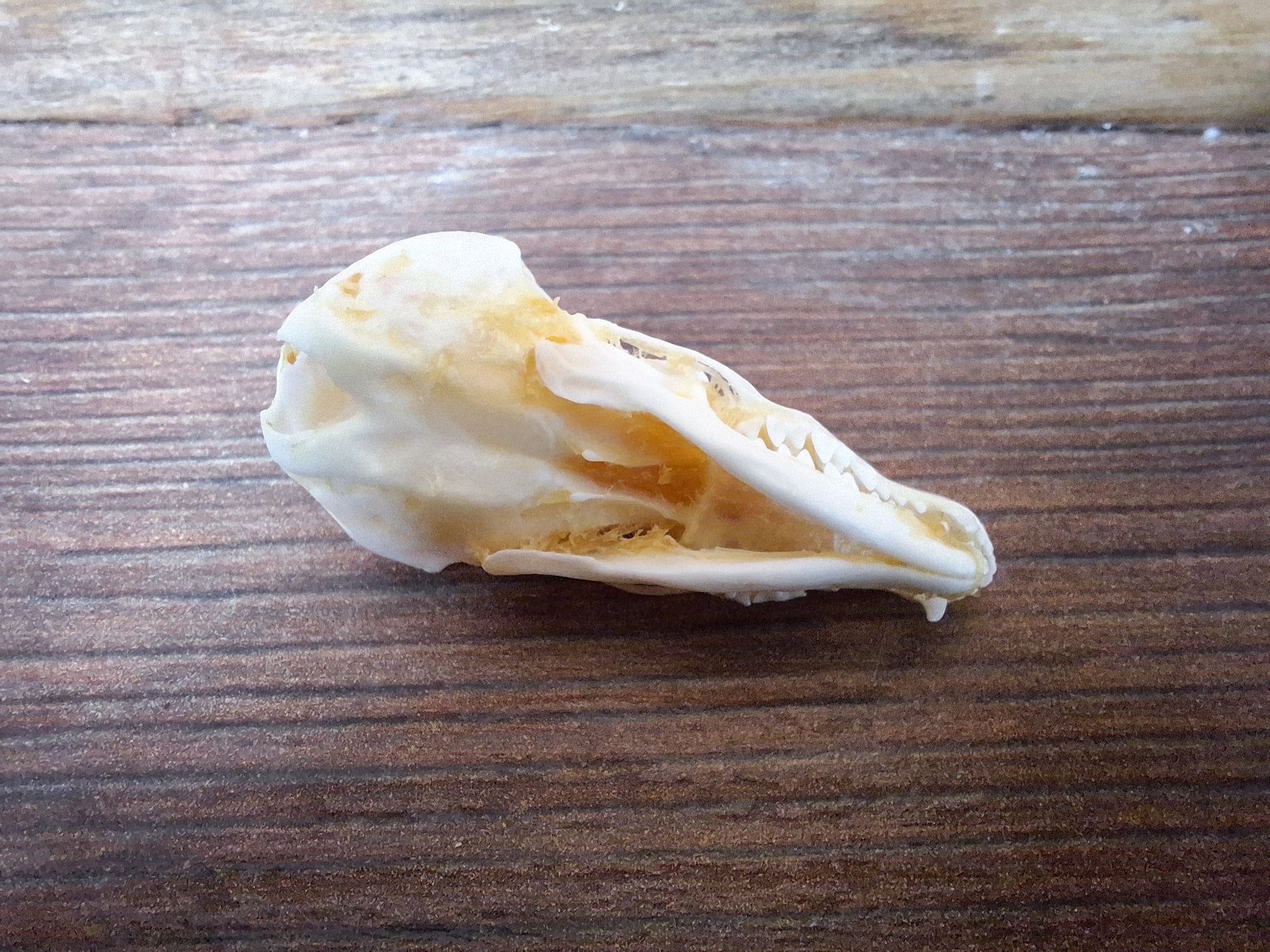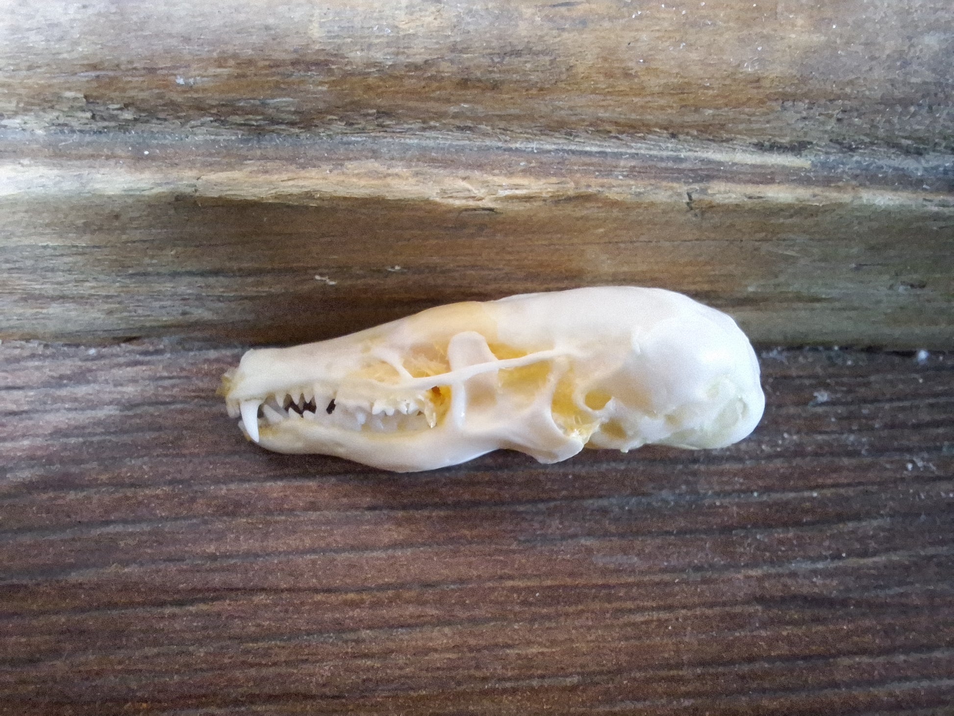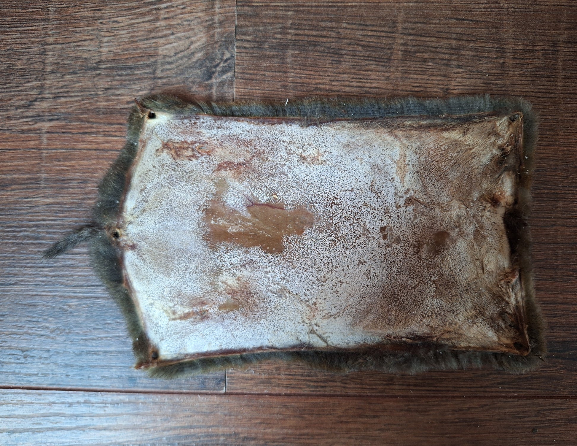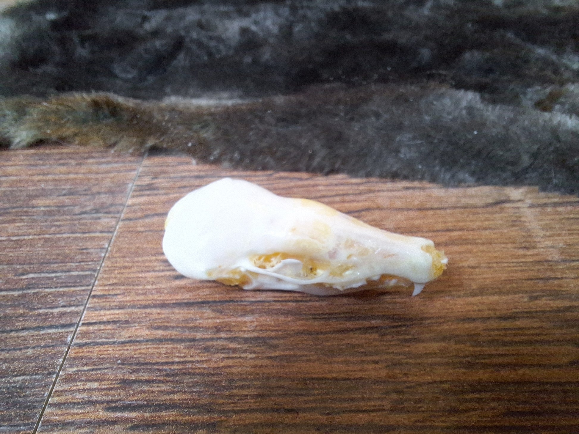 The skull is in good condition and measures approximately 38 millimeters long and 18 millimeters wide. The hide is prepared in a simple way by scraping, cleaning and salting it, resulting in a hide that's rigid when it's dry. If you want to mold it into the shape of some personal crafting project, you can you soak it in water to make it flexible again, then shape it and let it dry again. The hide measures approximately 15 centimeters long (measured without the tail) and 8,5 centimeters wide.