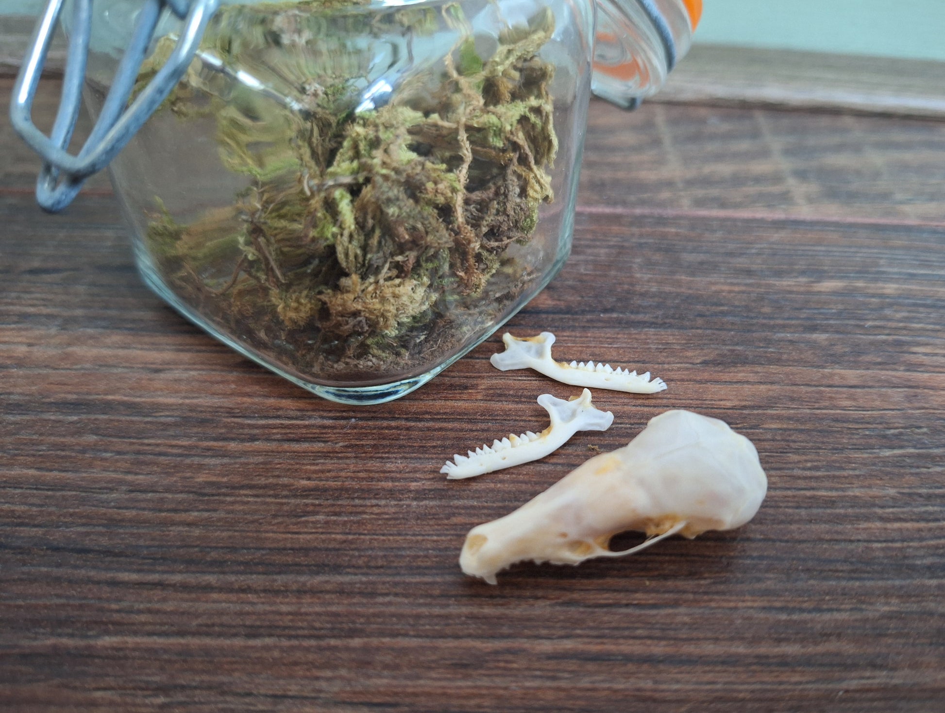Skull from a mole (consisting of an upper skull and two separate lower jaws) in a nice little glass jar with some decorative moss. In good condition.