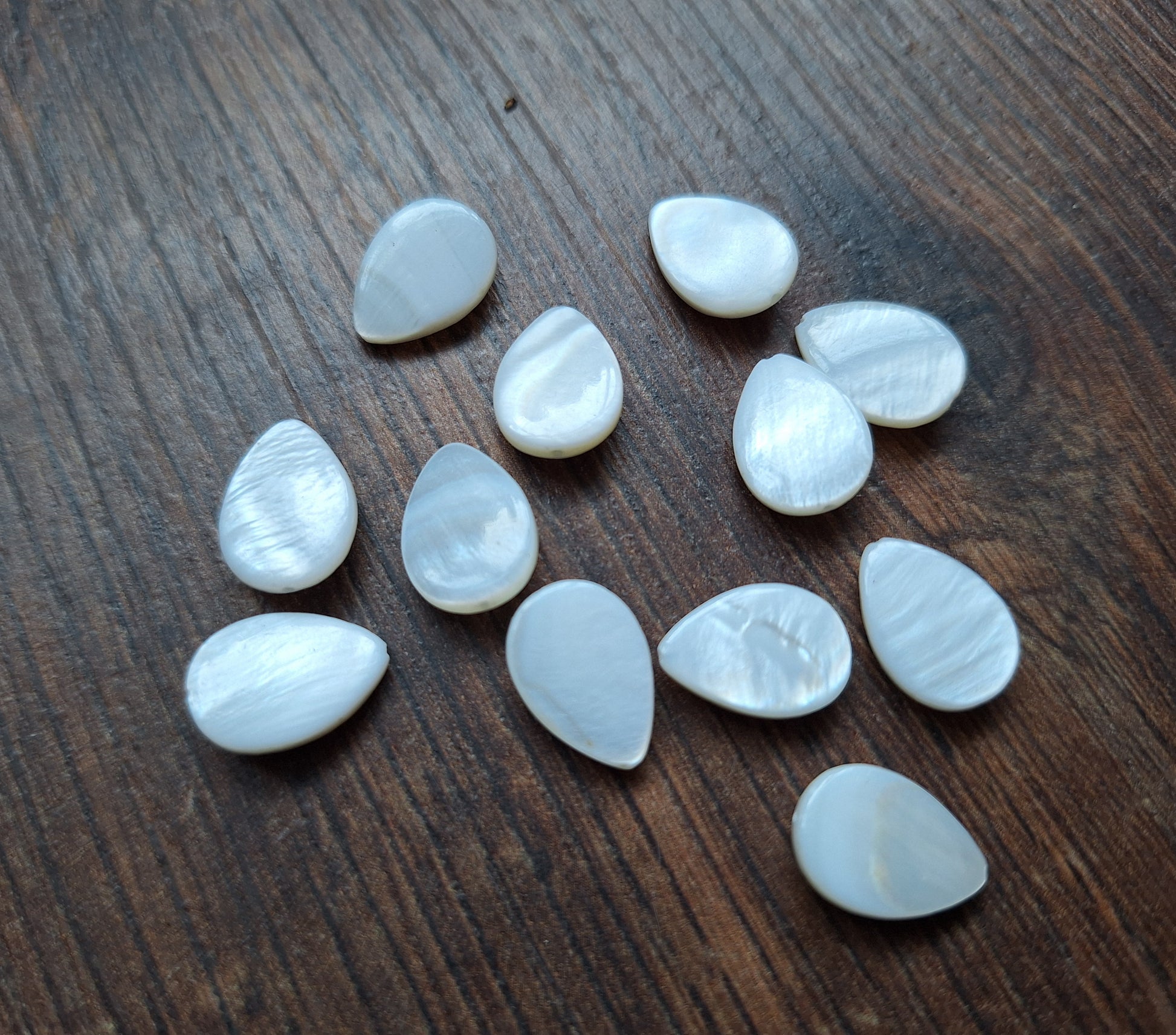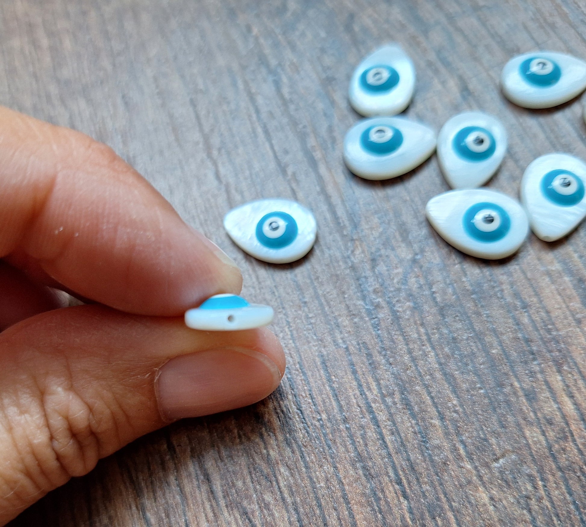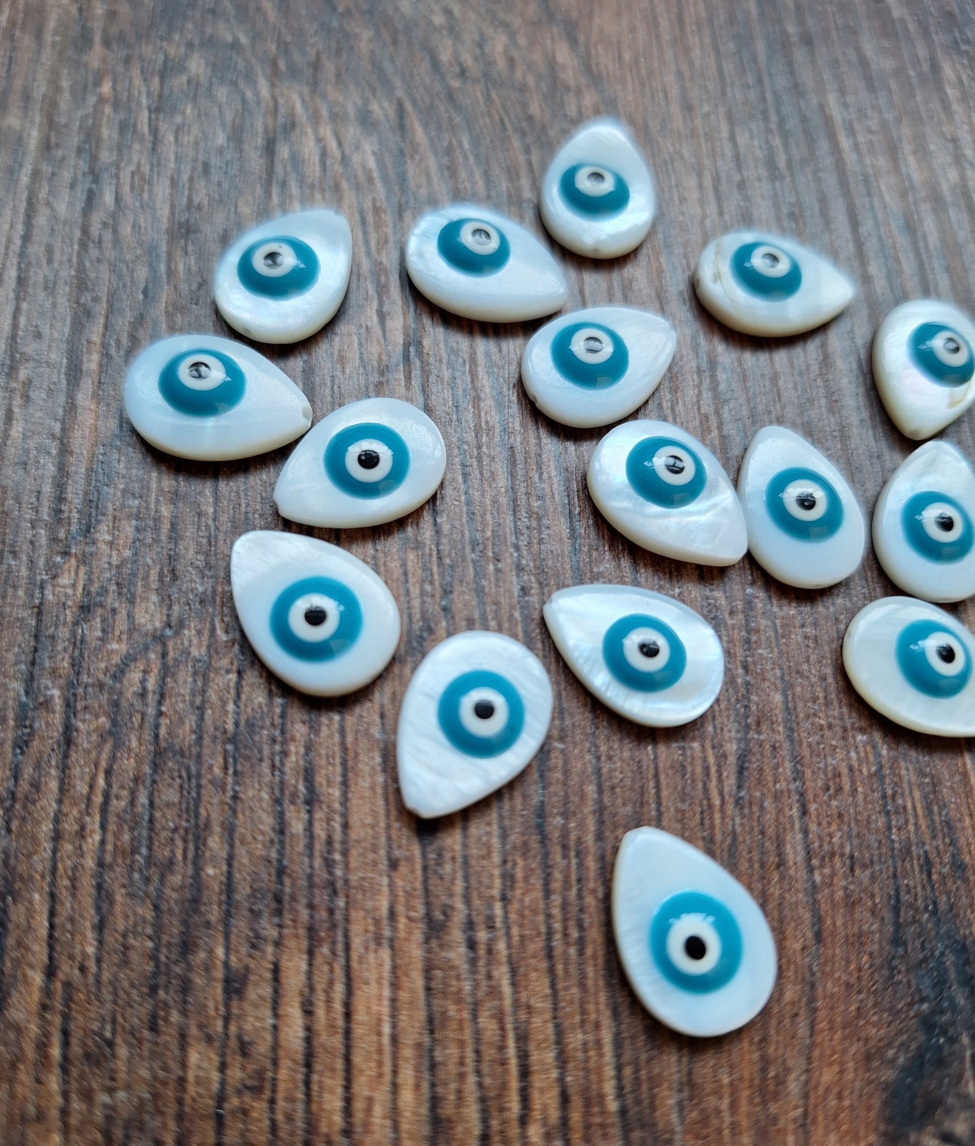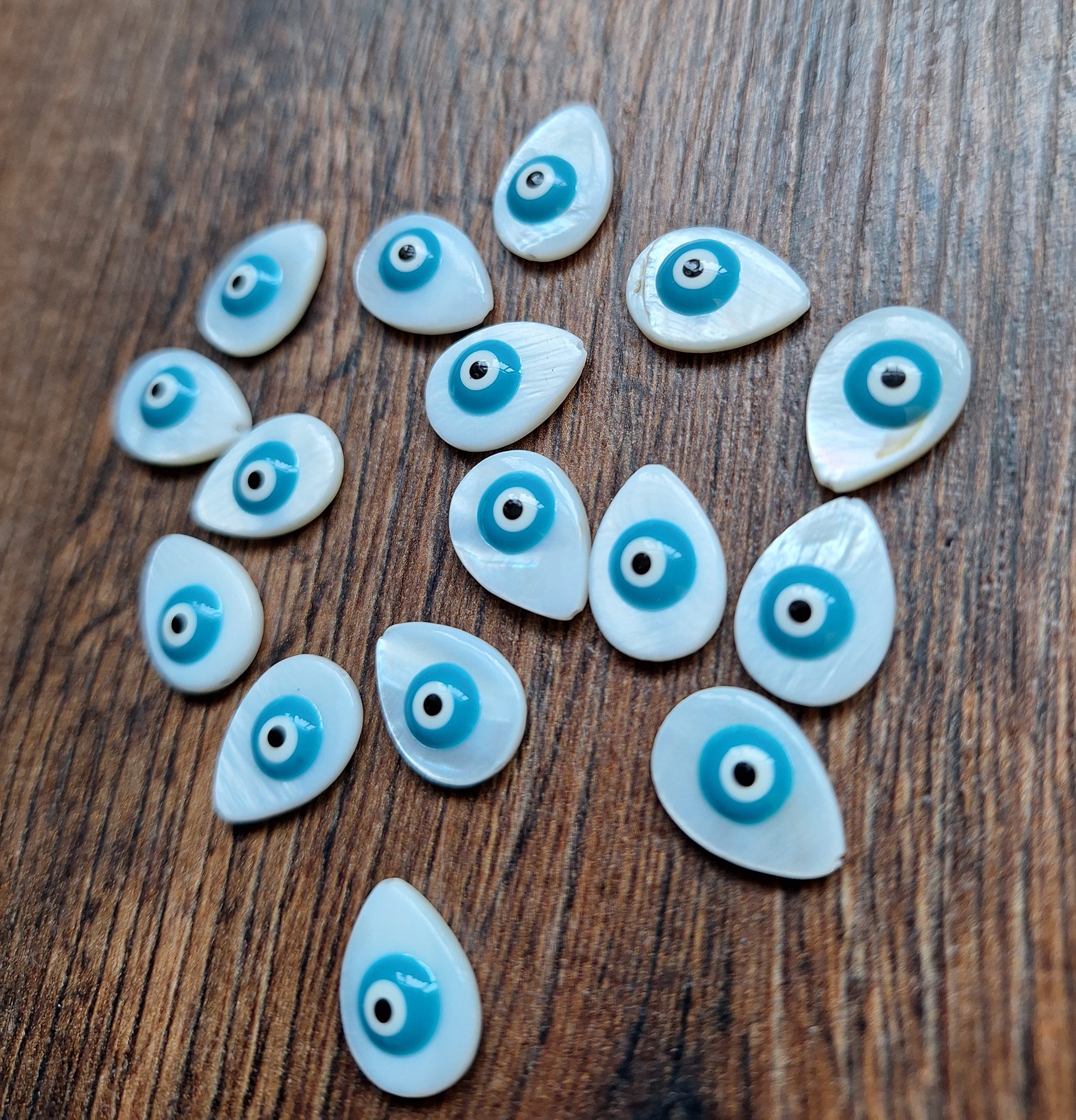 These eye-shaped beads are made on a base of mother of pearl, the shiny and opalescent inside of some shells. Since Paleolithic times, mother of pearl has been highly appreciated as a material for making all kinds of jewelry and decorations and has been a trade-currency of (sometimes extremely) high value. As such, mother of pearl has become a symbol for material wealth. In traditional (Siberian) shamanism, mother of pearl is considered to be one of the nine traditional 'jewels' of the shaman and is connected to the Middleworld and the Water element.