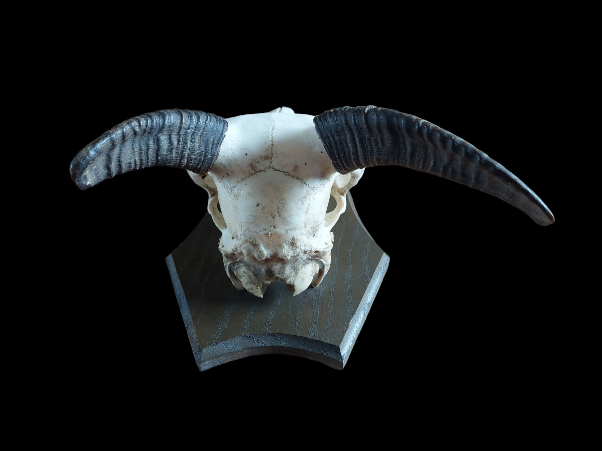 Nice upper skull from a muflon, younger animal. This skull comes from an animal that died of natural causes, but has been attached to a 'trophy board' for decorational purposes.