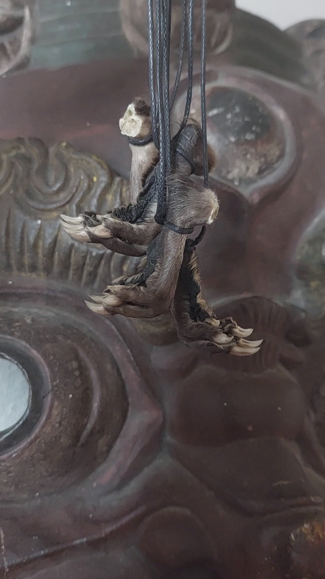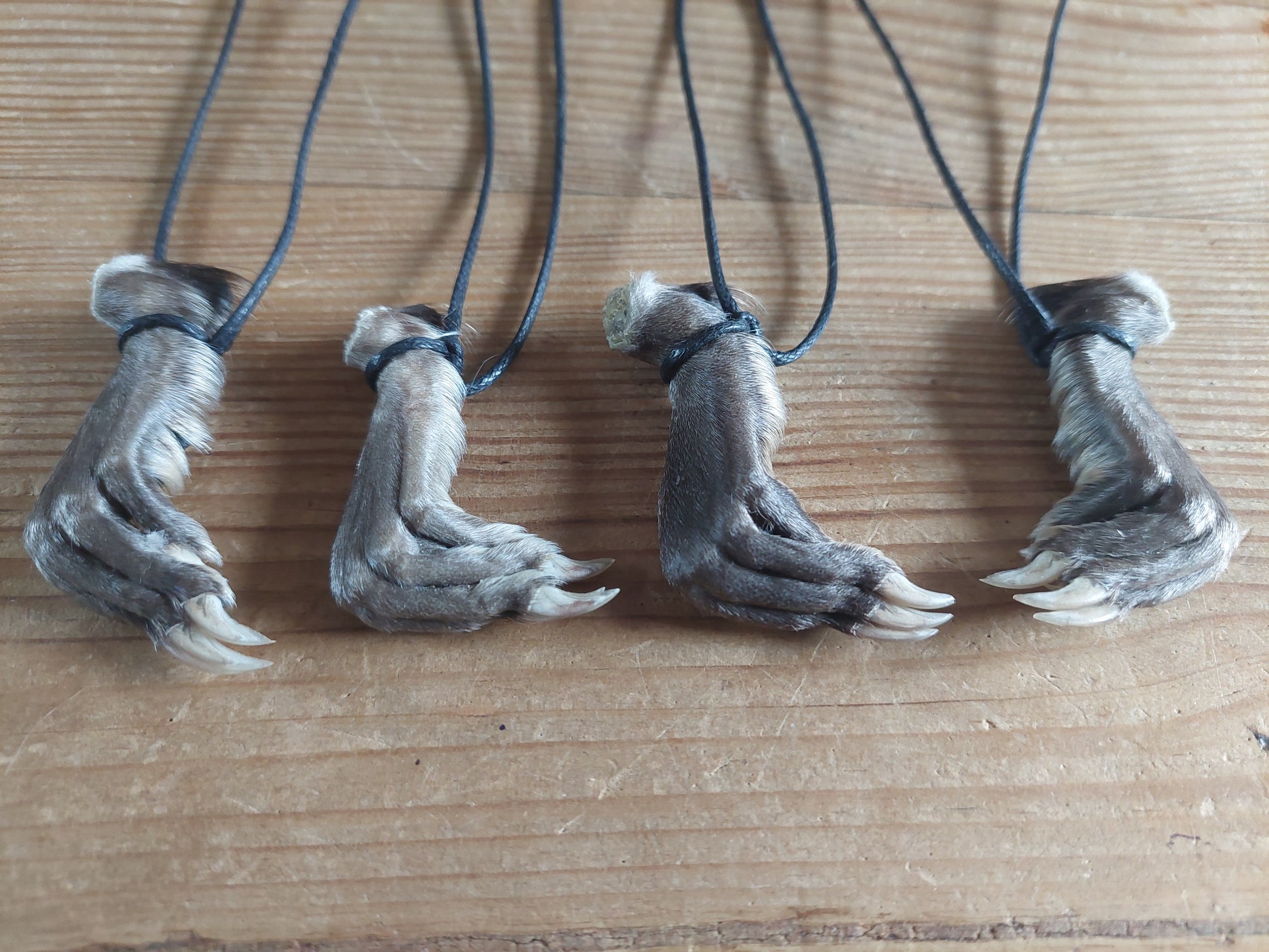 The paws have been made into necklaces with a simple black waxcord, which closes with a simple knot, so they can easily be adjusted to your personal size. Wear these necklaces simply as they are, to connect you with the spirit of Musk Rat, or use them for further crafting purposes on for example your ritual clothing or attributes.