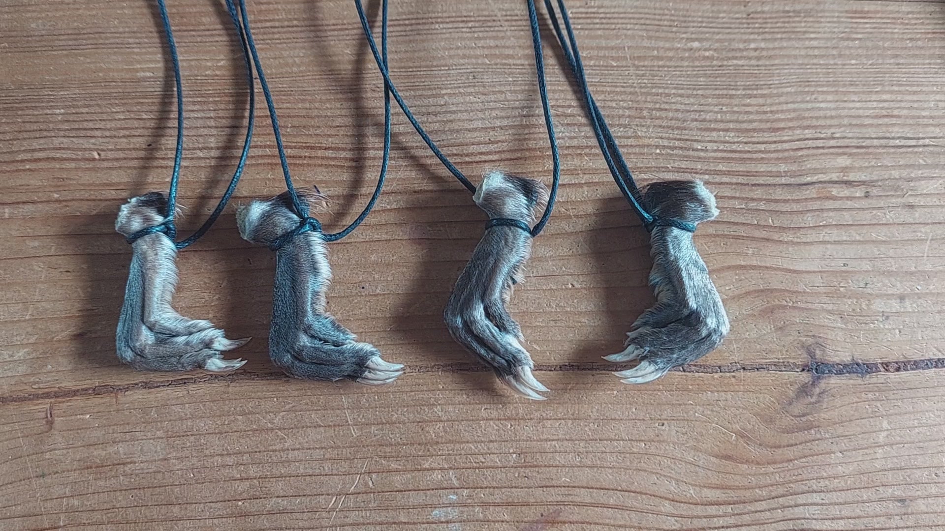 Necklaces made with front paws from dutch musk rats. The paws have been prepared complete, so including bones, hide, nails etc.