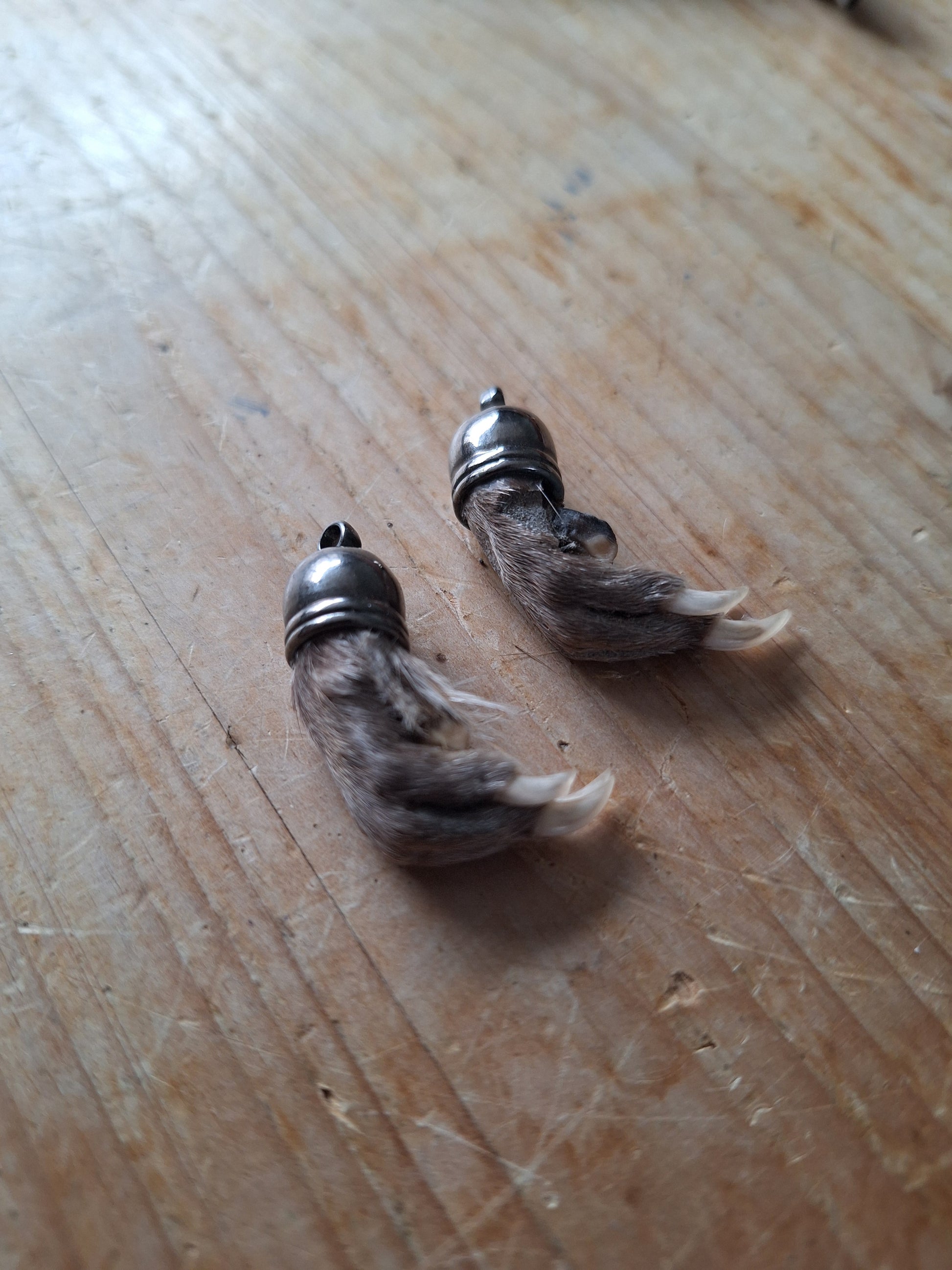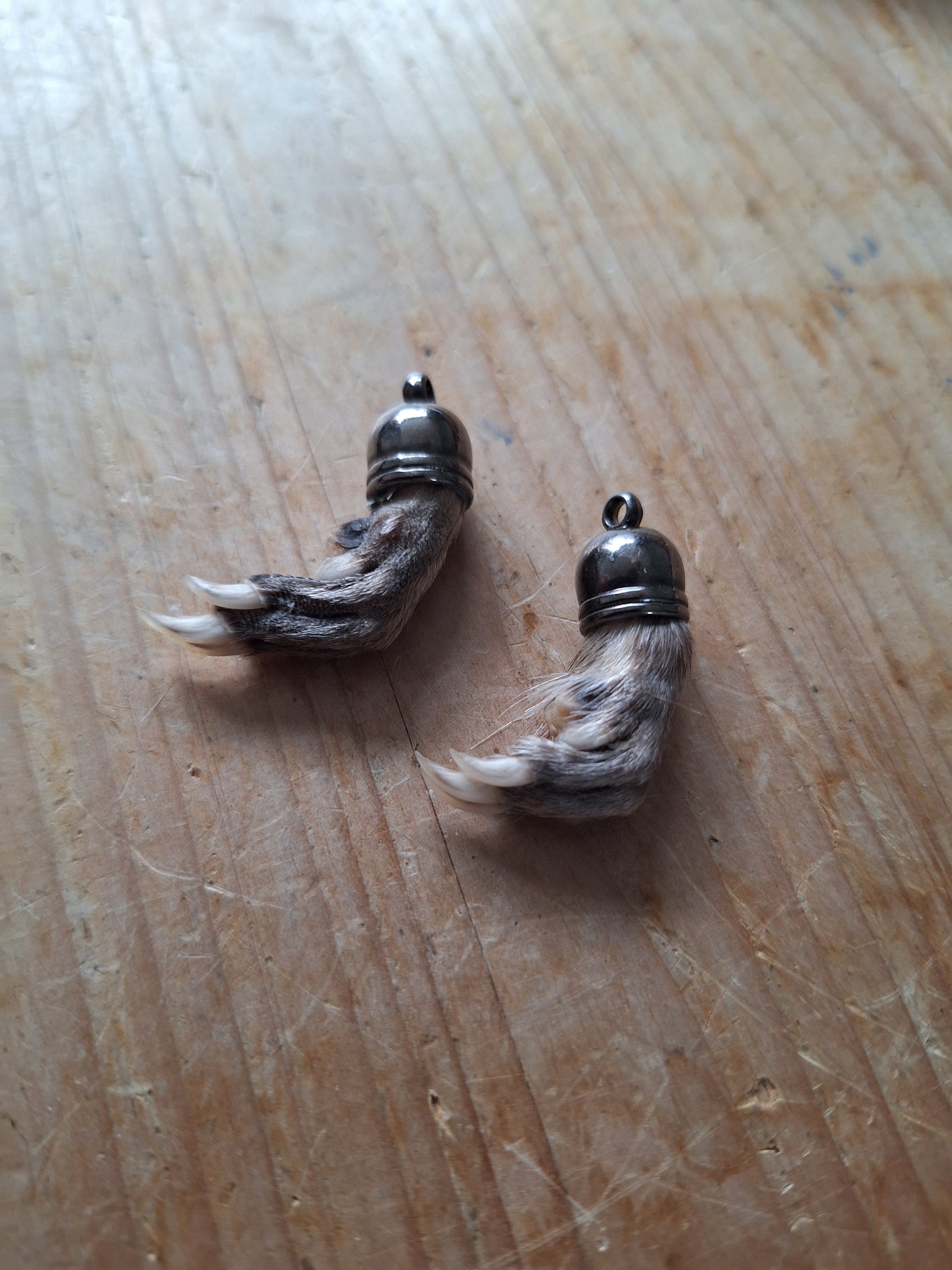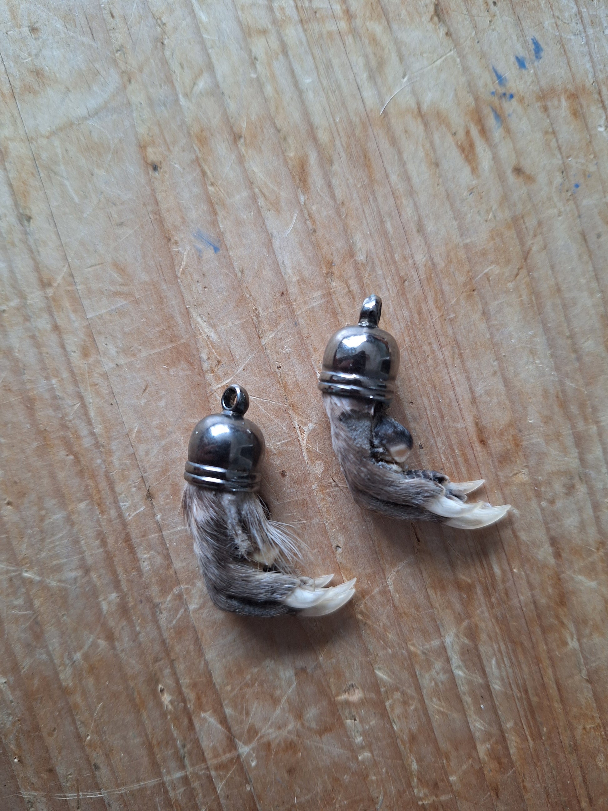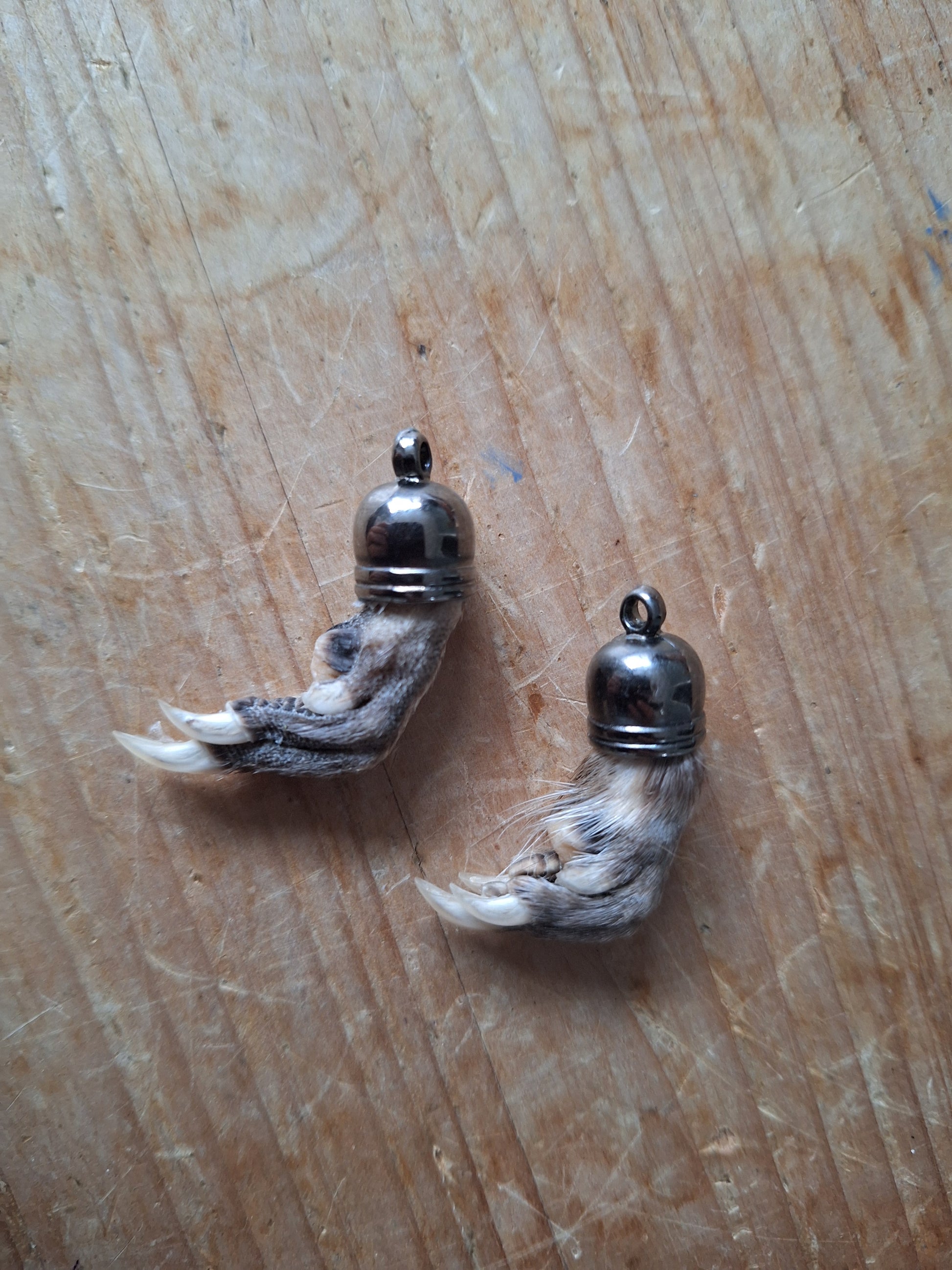Pendants made with complete prepared front paws from dutch musk rats. The paws have been attached into a metal bead cap in an antique silver color. The bead caps have an eyelet to them, so these are ready to be hung on a simple cord or necklace or of course for further use in all your personal crafting purposes.