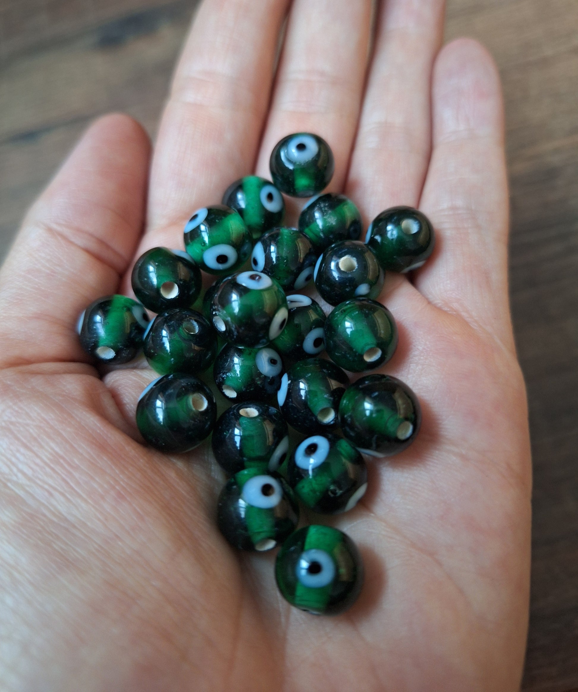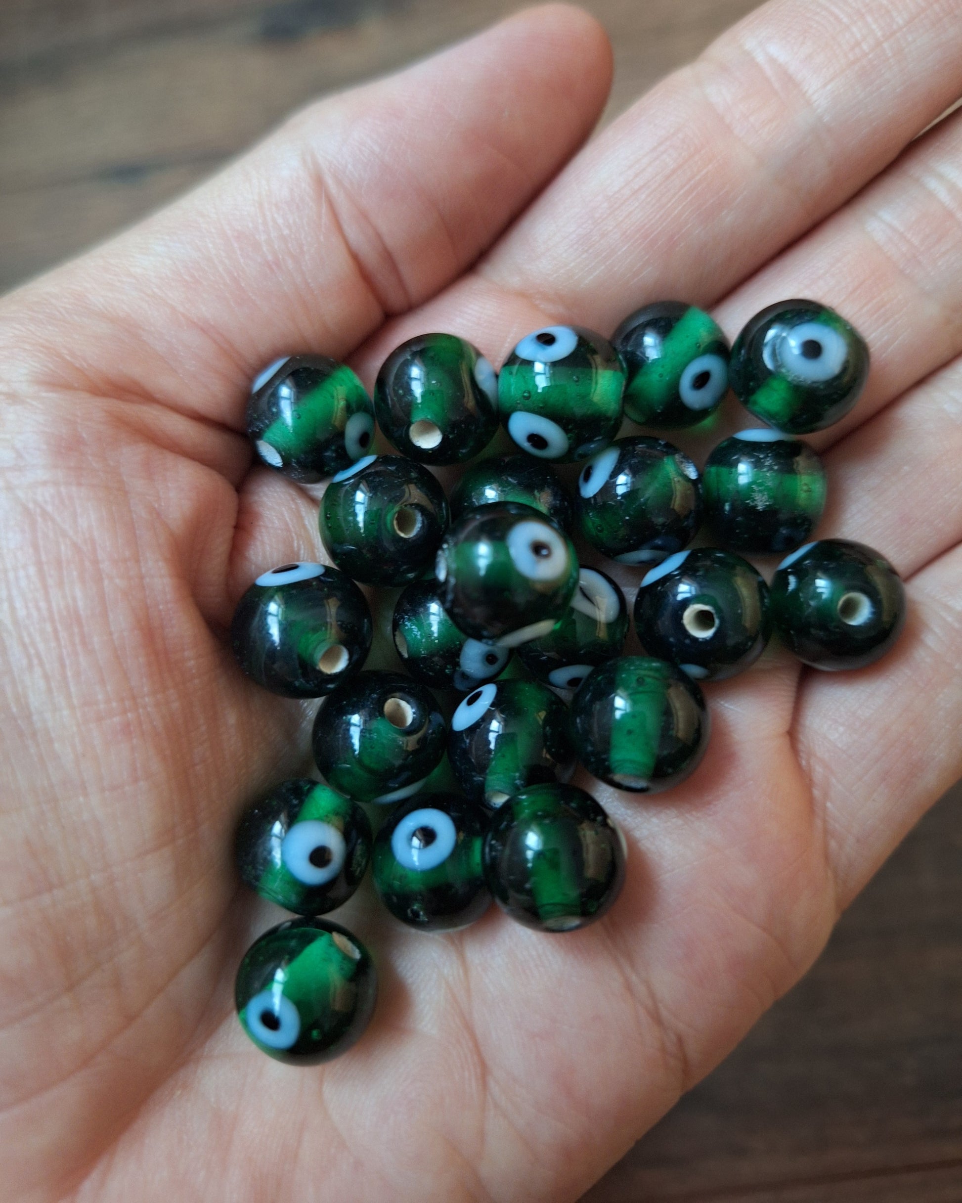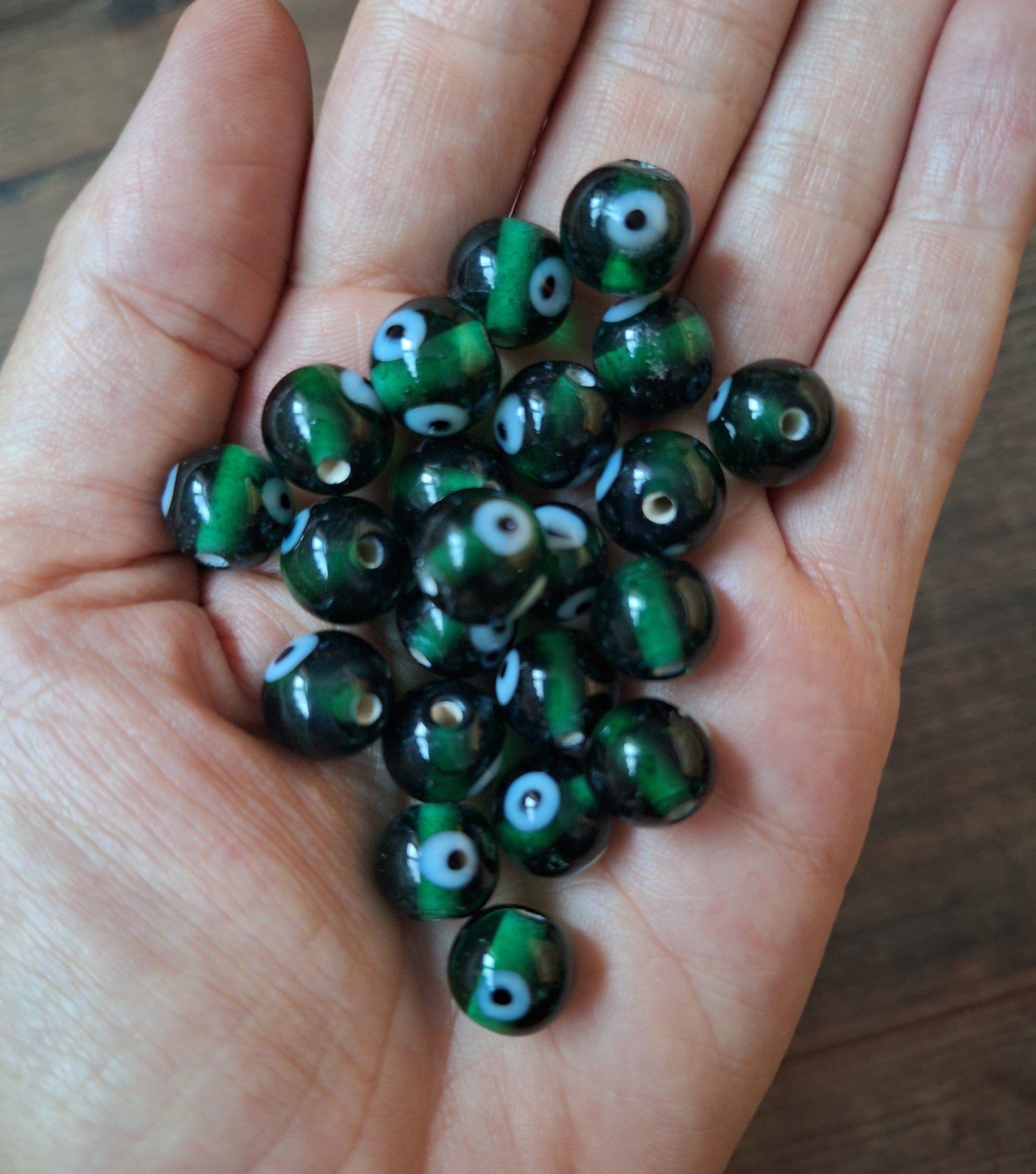 Recently made glass beads from Nepal with depictions of eyes. The transparant green glass has been crafted around a white clay core.