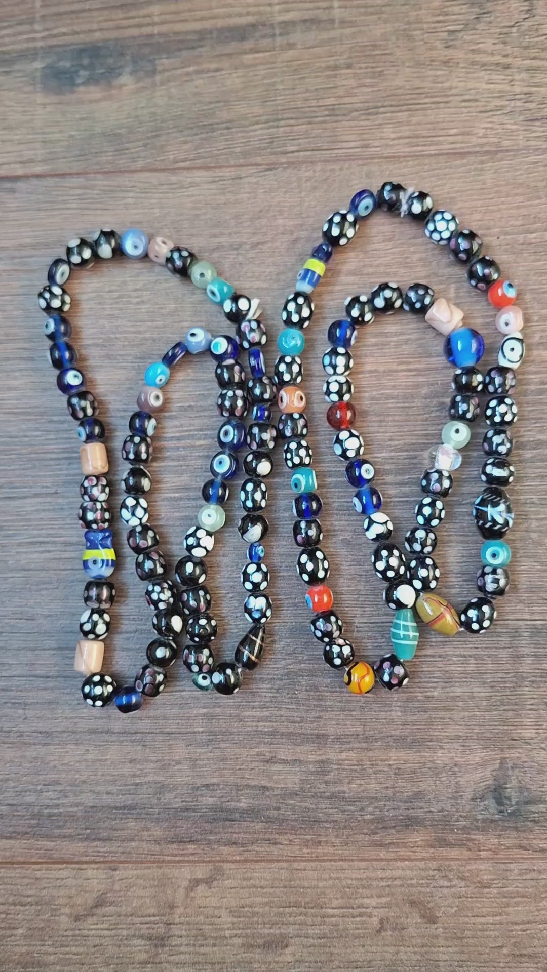 Strands of colorful glass beads from Nepal. The beads have been recently made and, as can be seen on the pictures, a strand consists of a random mix of styles, colors and sizes. Perfect for all kinds of crafting purposes.