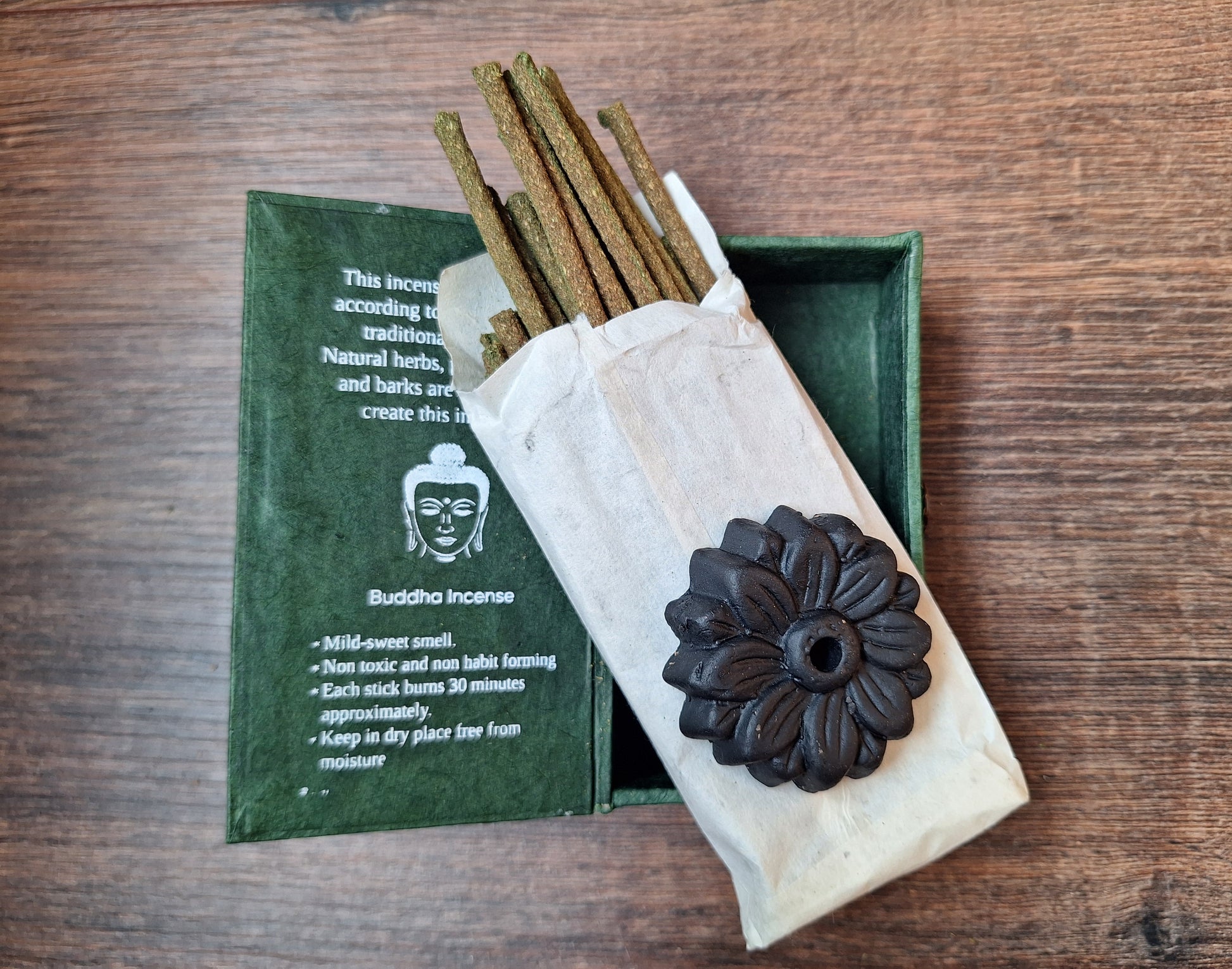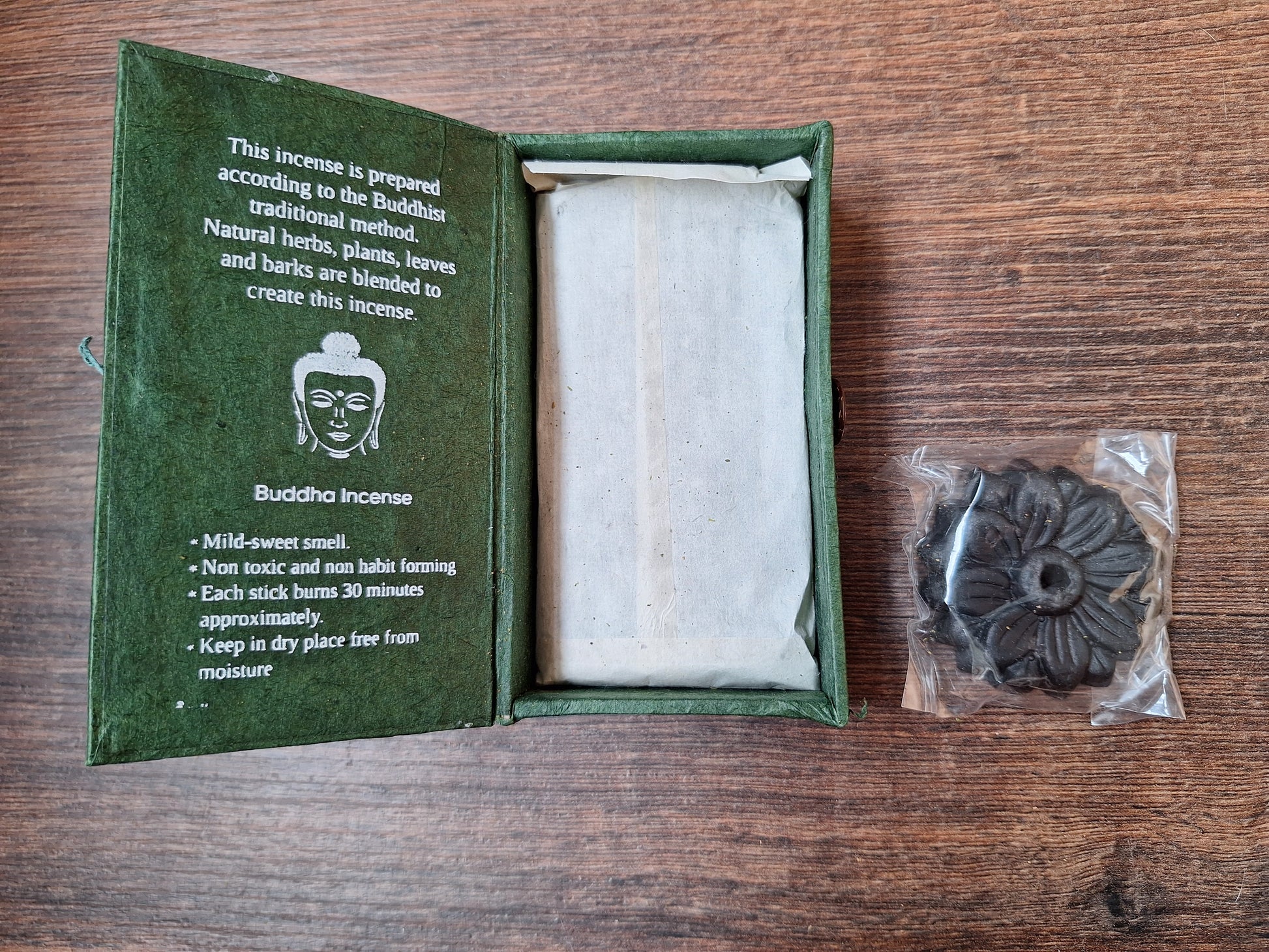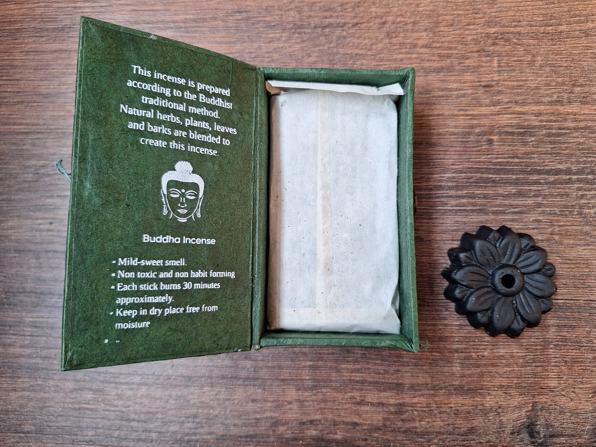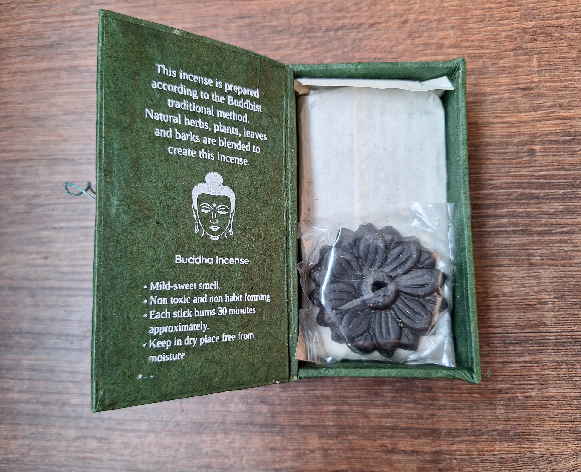 The incense sticks come together with a flower-shaped stone burner (approximately 5 centimeters diameter) and are packed in a good quality cardboard box. Sizes of the box; 11,5 centimeters long, 6,5 centimeters wide and 3,5 centimeters deep.
