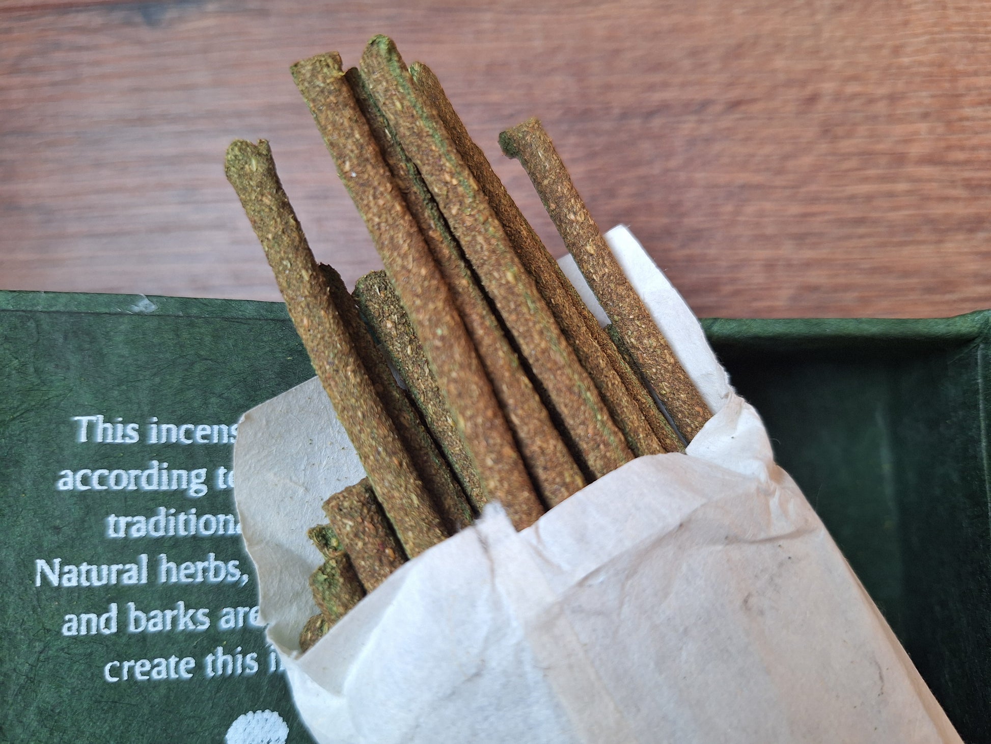 One package contains 30 woodfree, hand-rolled incense sticks with a length of approximately 11 centimeters. One stick burns approximately 30 minutes (in an indoor environment, this might of course be different when burning it on a windy, outside location).