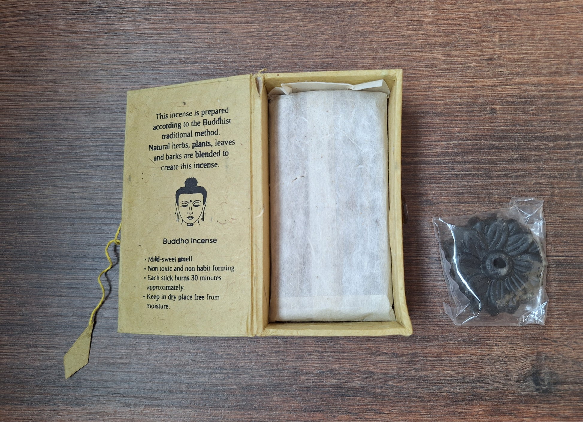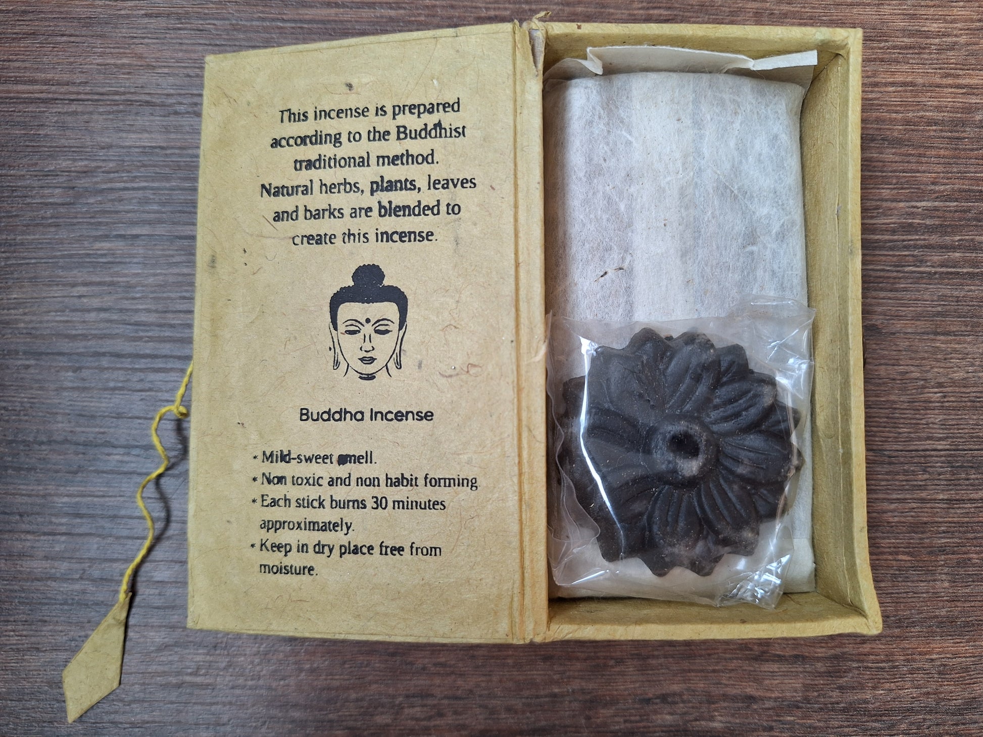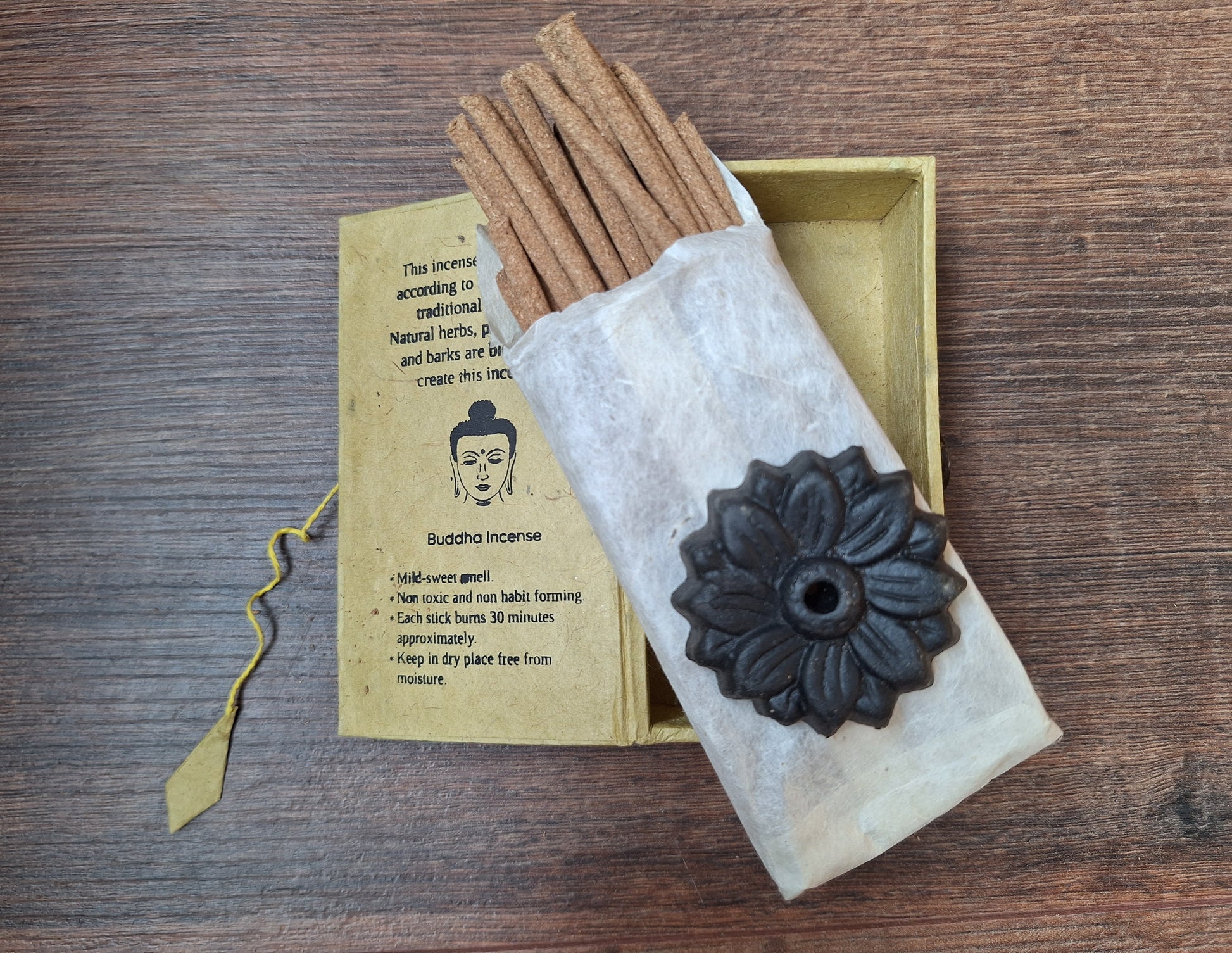 The incense sticks come together with a flower-shaped stone burner (approximately 5 centimeters diameter) and are packed in a good quality cardboard box. Sizes of the box; 11,5 centimeters long, 6,5 centimeters wide and 3,5 centimeters deep.