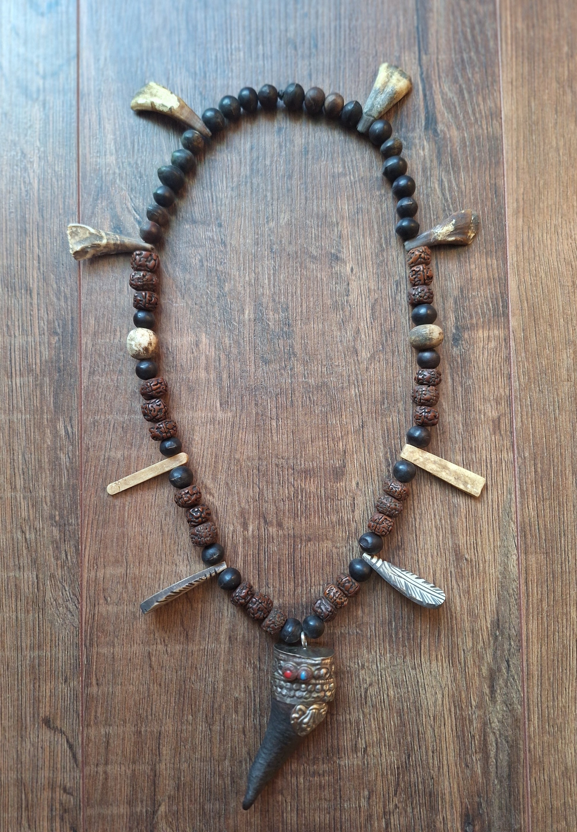 On this base, multiple traditional items have been attached; handcarved and engraved yak bone pendants, bone beads, yak teeth and a small cow horn in a Tibetan silver setting as a centerpiece.