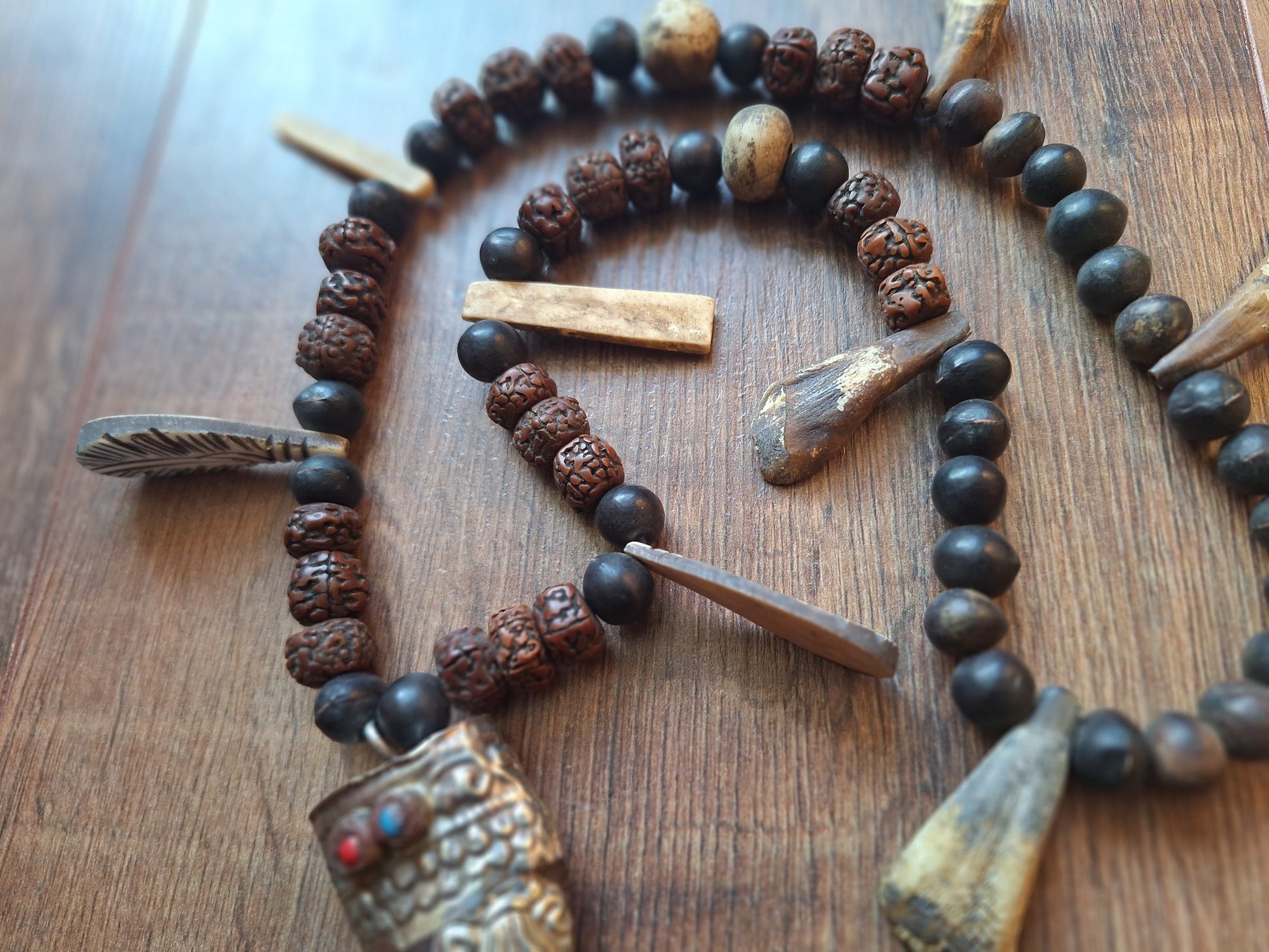 Sizes; total length of this necklace is approximately 72 centimeters (measured only the string of beads, not including the pendants), total weight is 160 grams. The central horn pendant is approximately 9 centimeters long.