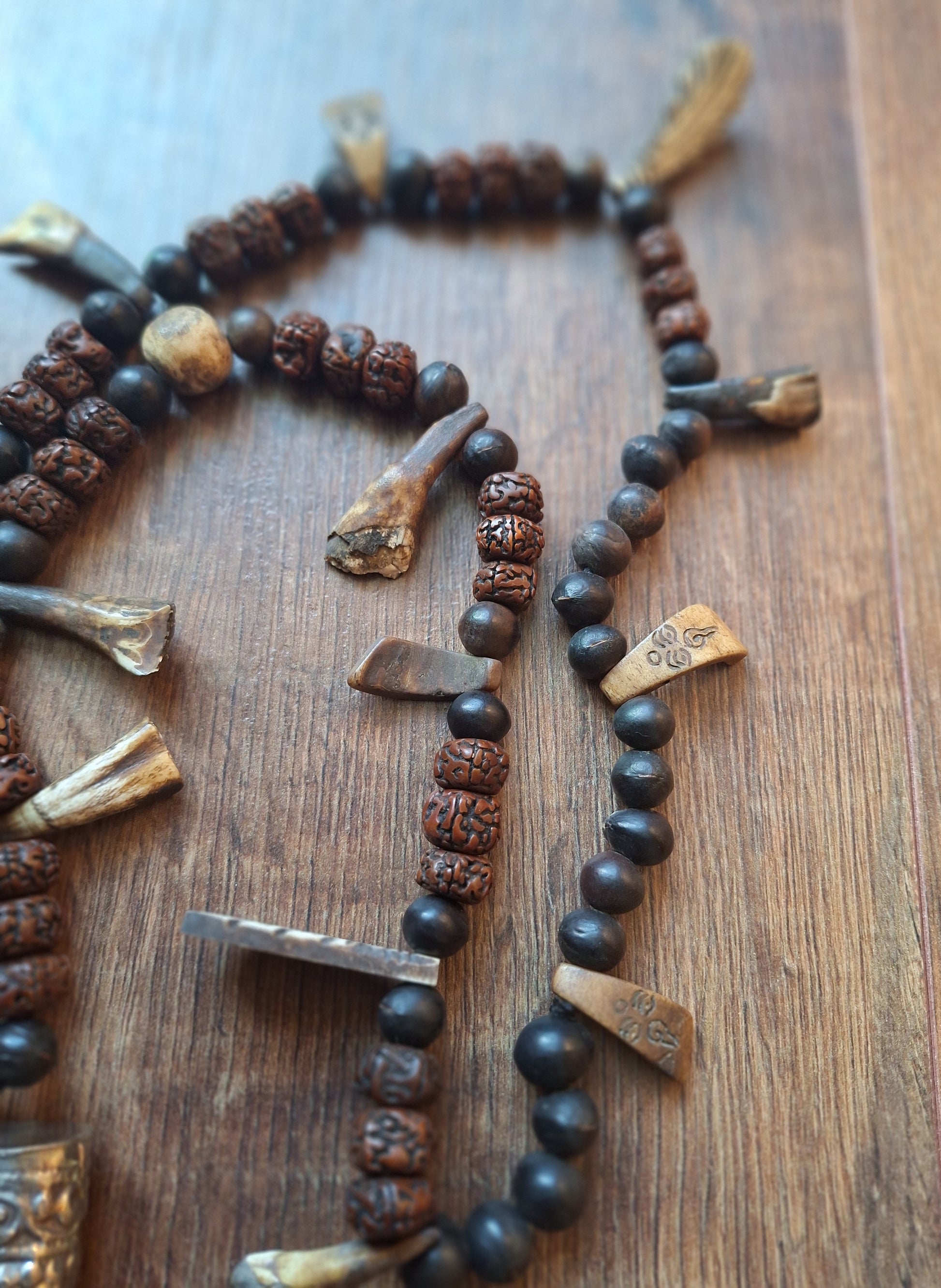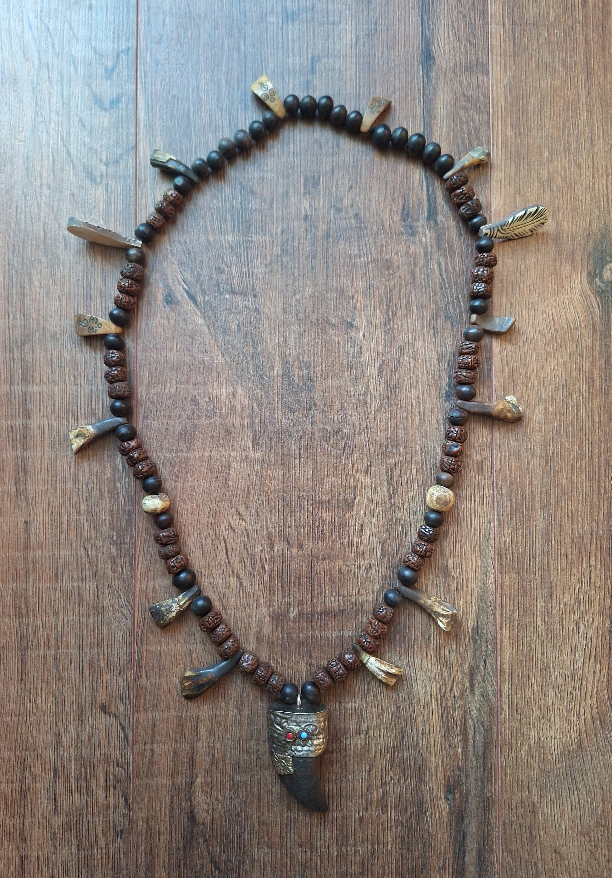 On this base, multiple traditional items have been attached; handcarved and engraved yak bone pendants, bone beads, yak teeth and a small cow horn in a Tibetan silver setting as a centerpiece.