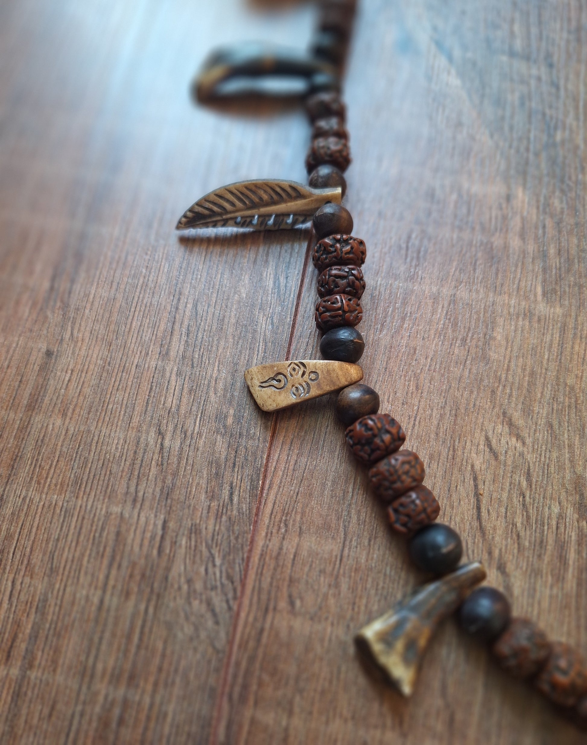 On this base, multiple traditional items have been attached; handcarved and engraved yak bone pendants, bone beads, yak teeth and a small cow horn in a Tibetan silver setting as a centerpiece.
