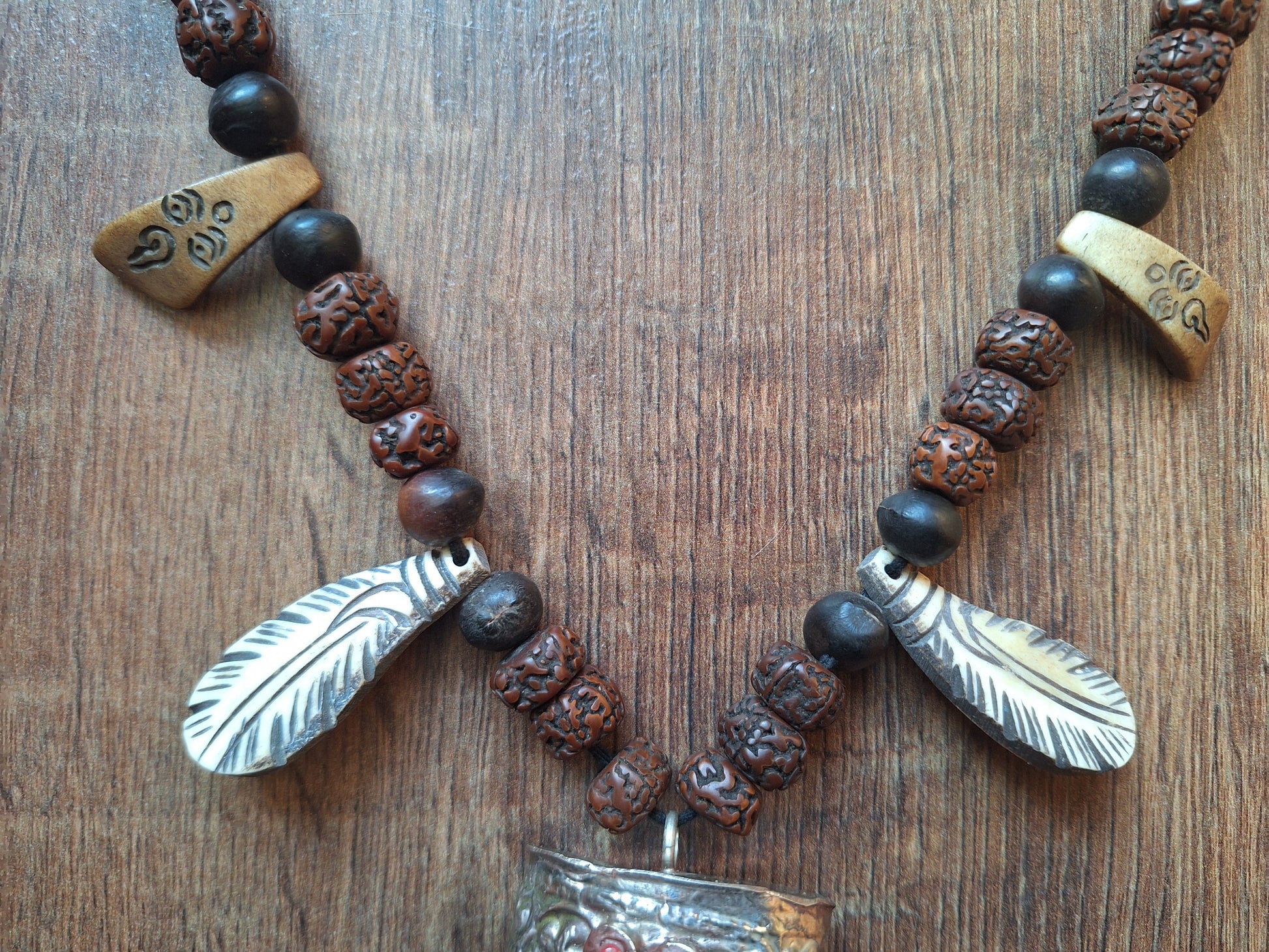 Sizes; total length of this necklace is approximately 88 centimeters (measured only the string of beads, not including the pendants), total weight is 216 grams. The central horn pendant is approximately 9 centimeters long.