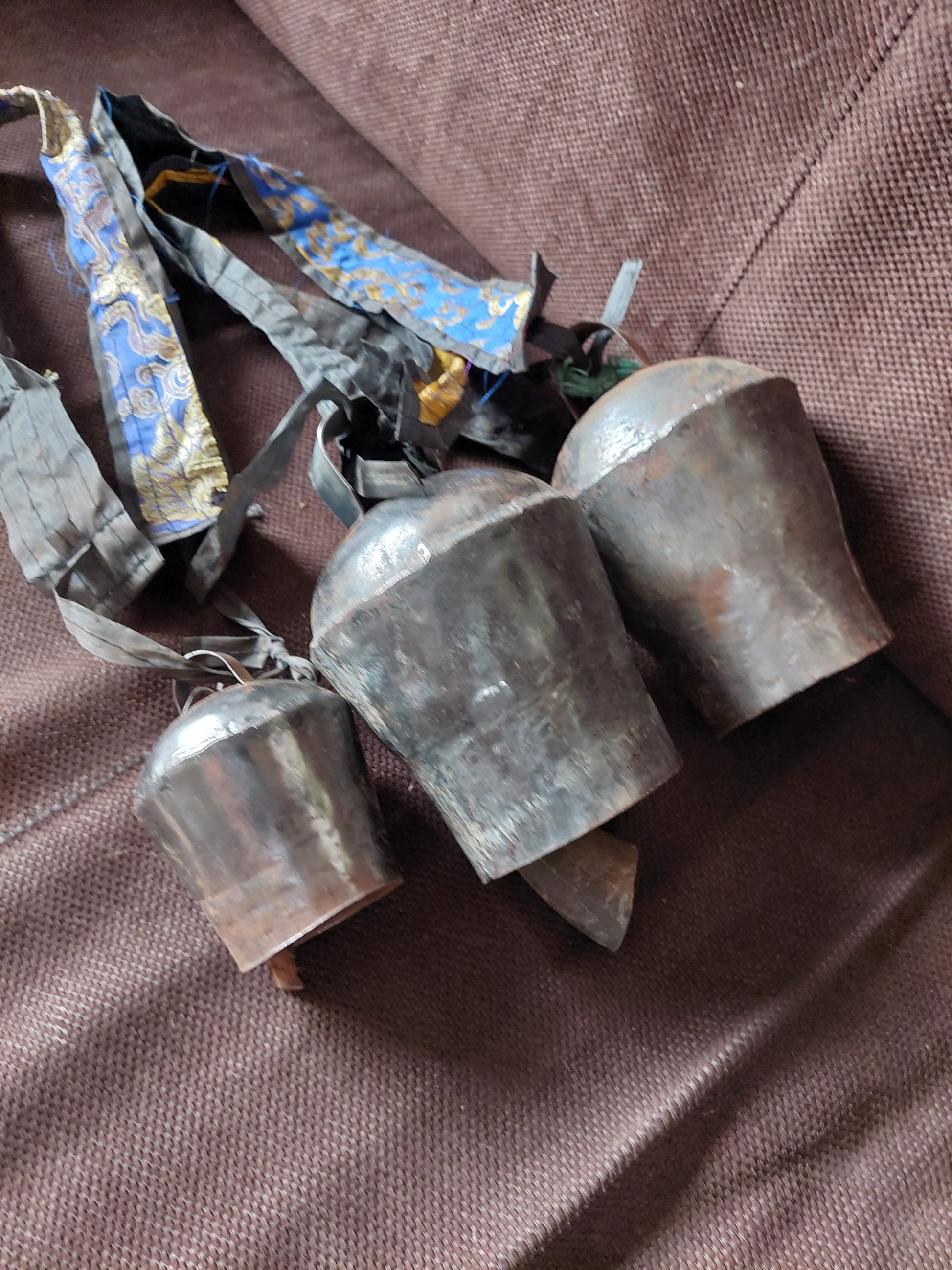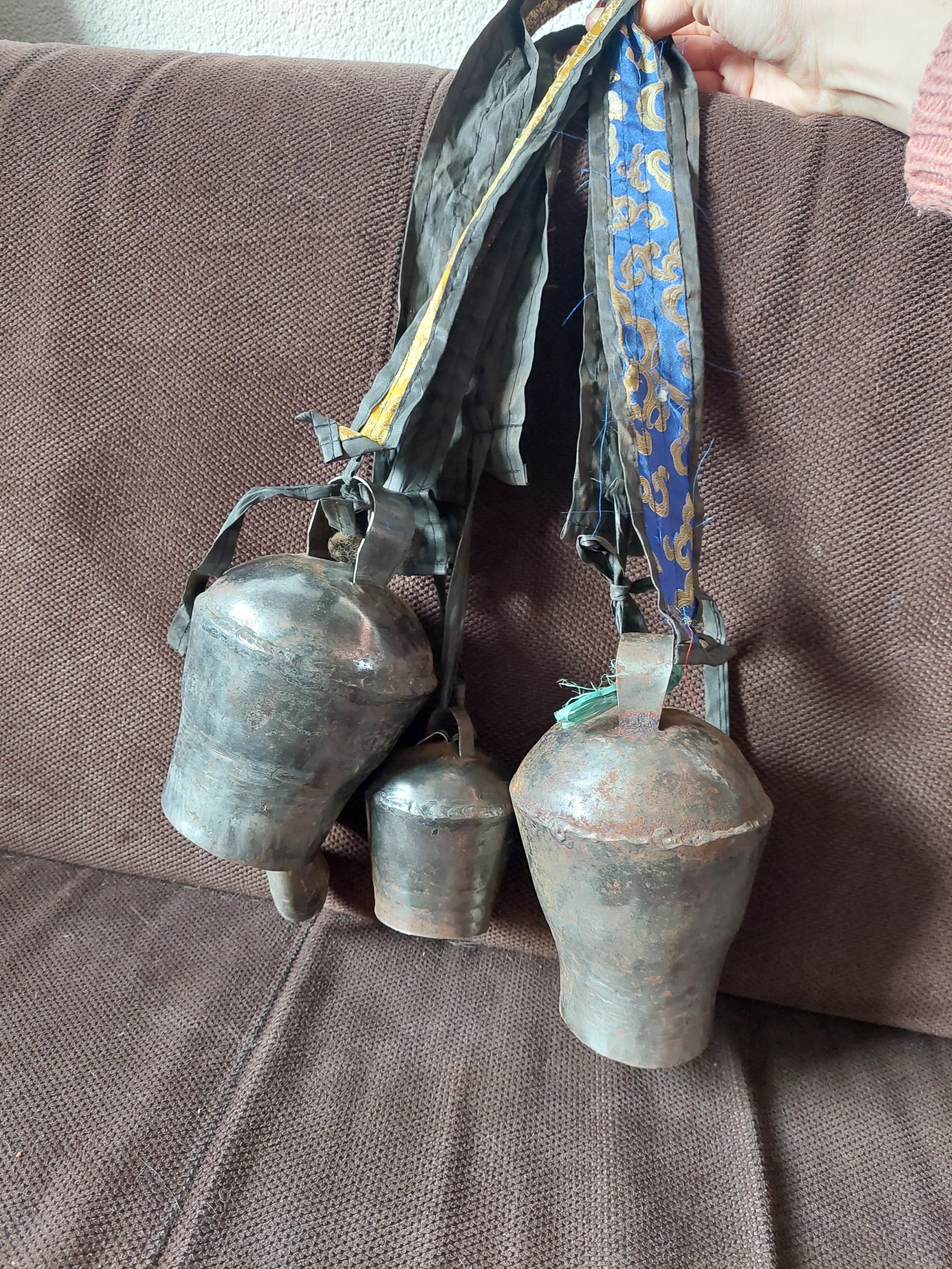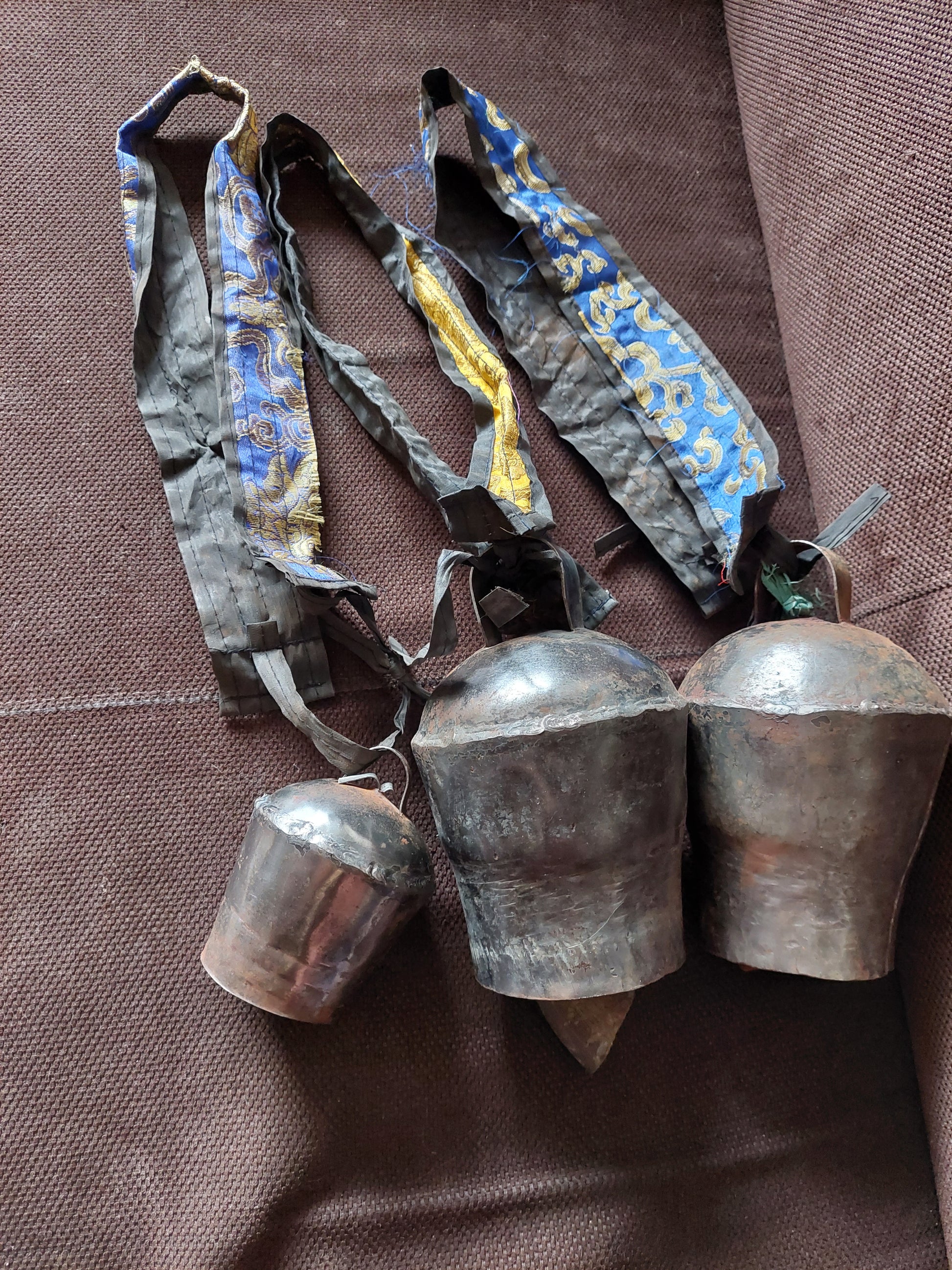 The bells are hung on a fabric (yak neck) strap, lined with brocade. The two bigger ones have a clapper made of yak horn, the smallest one has a clapper made of an iron nail (see detail pictures). Here are some more details: