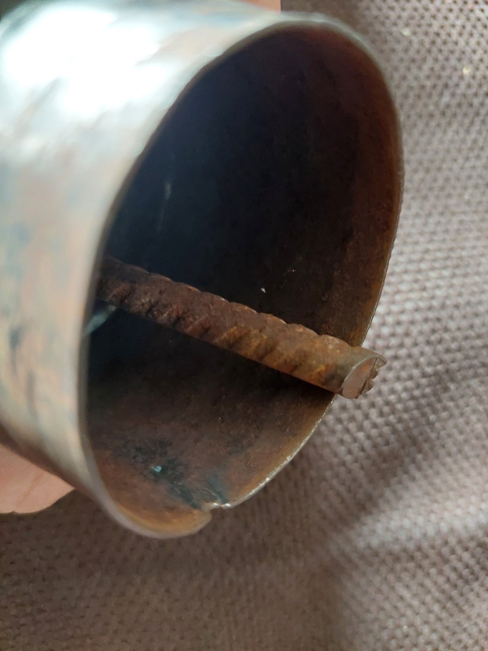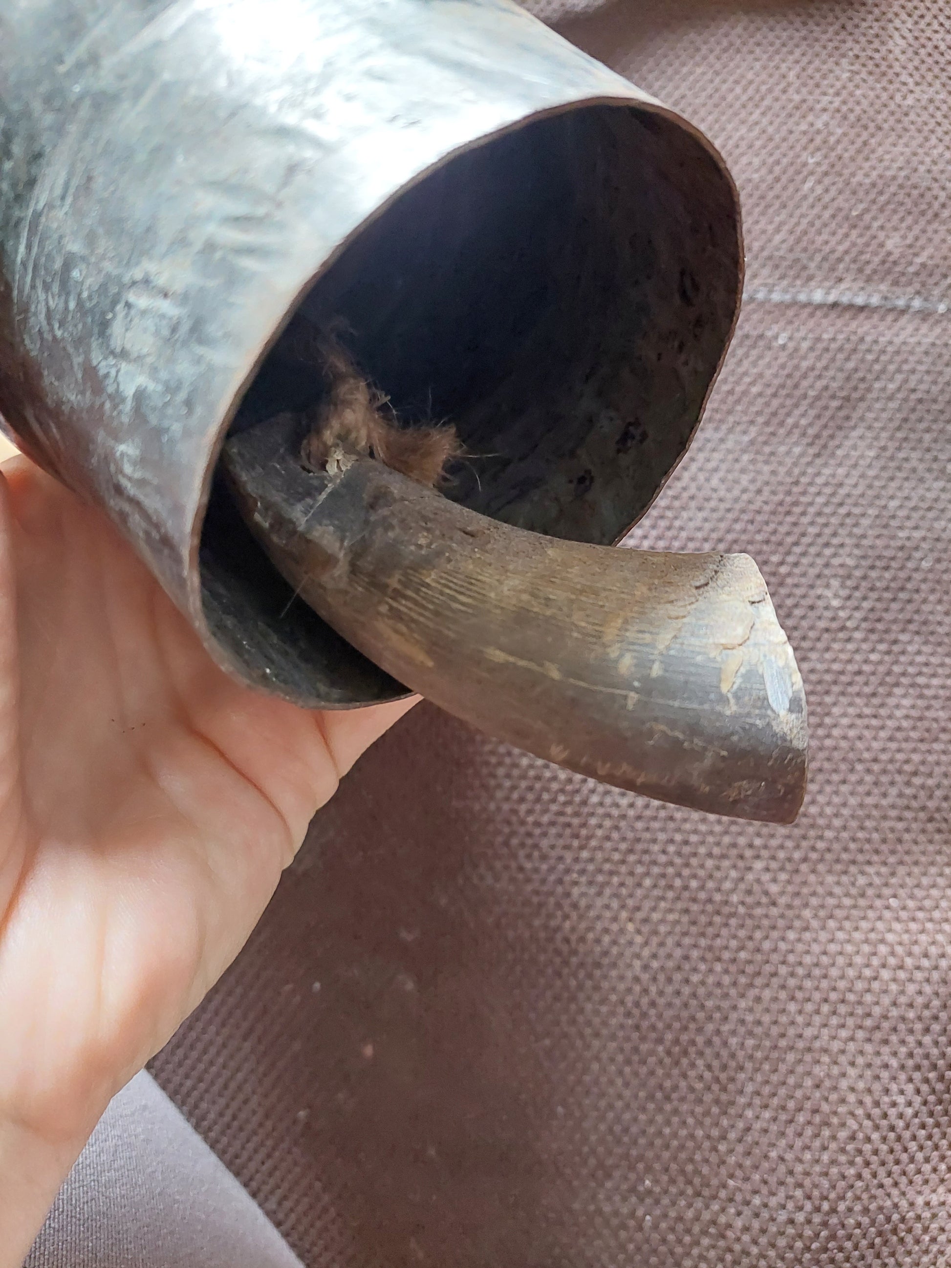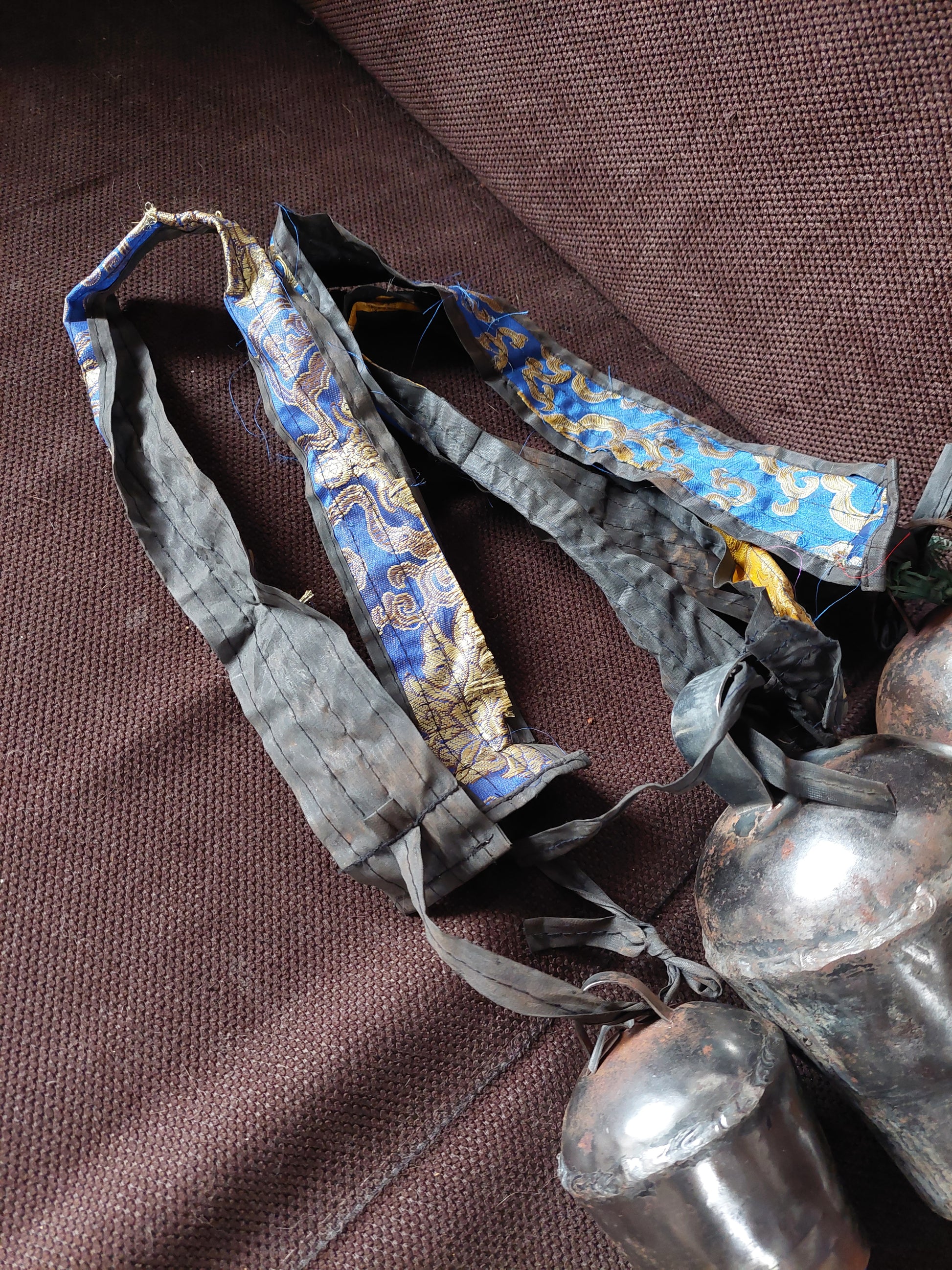 The bells are hung on a fabric (yak neck) strap, lined with brocade. The two bigger ones have a clapper made of yak horn, the smallest one has a clapper made of an iron nail (see detail pictures). Here are some more details: