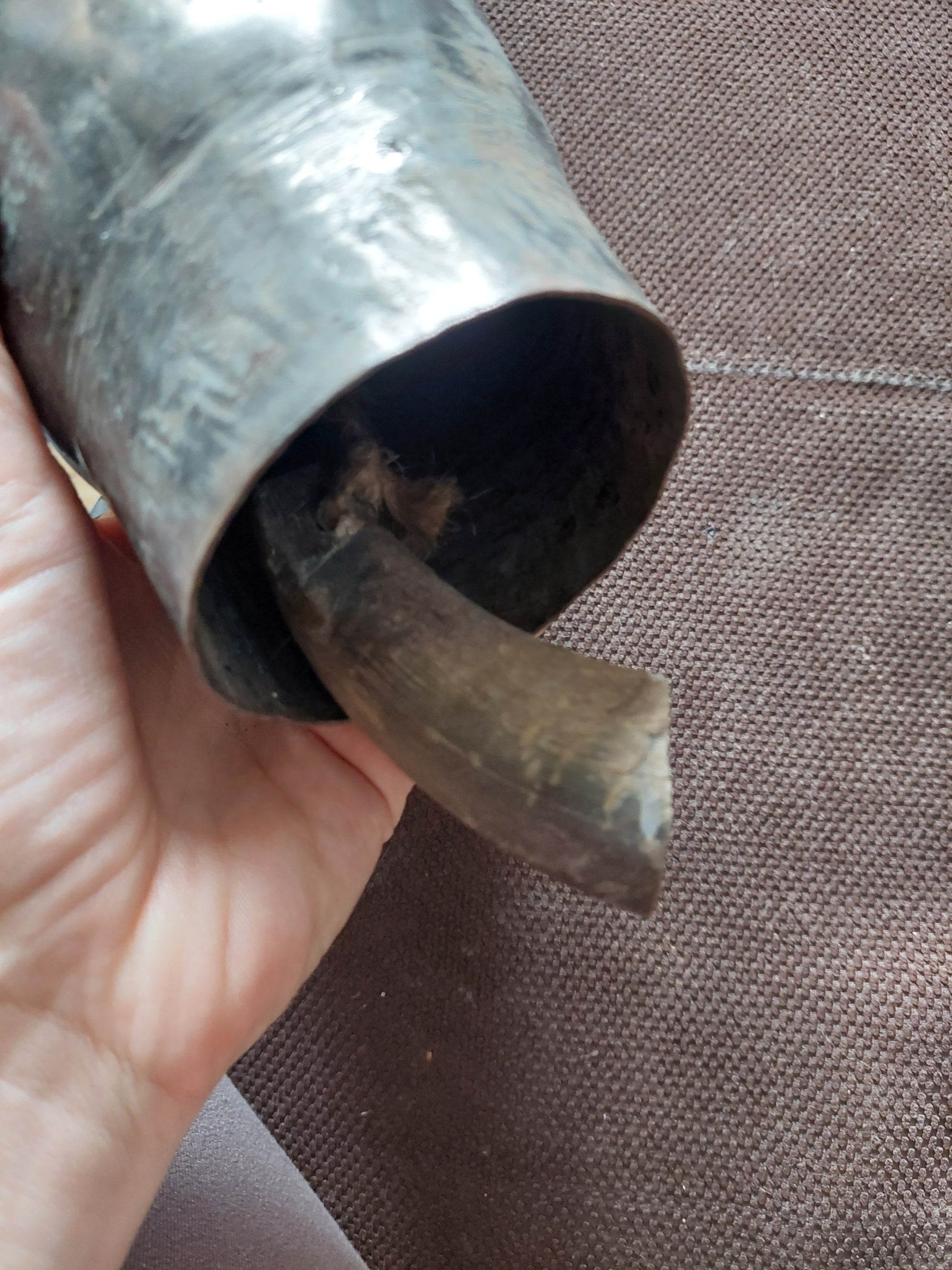 * big, blue brocade; 294 gr, horn clapper, 16 centimeters long (including eyelet), 13 centimeters long (without eyelet), 10,5 centimeters diameter