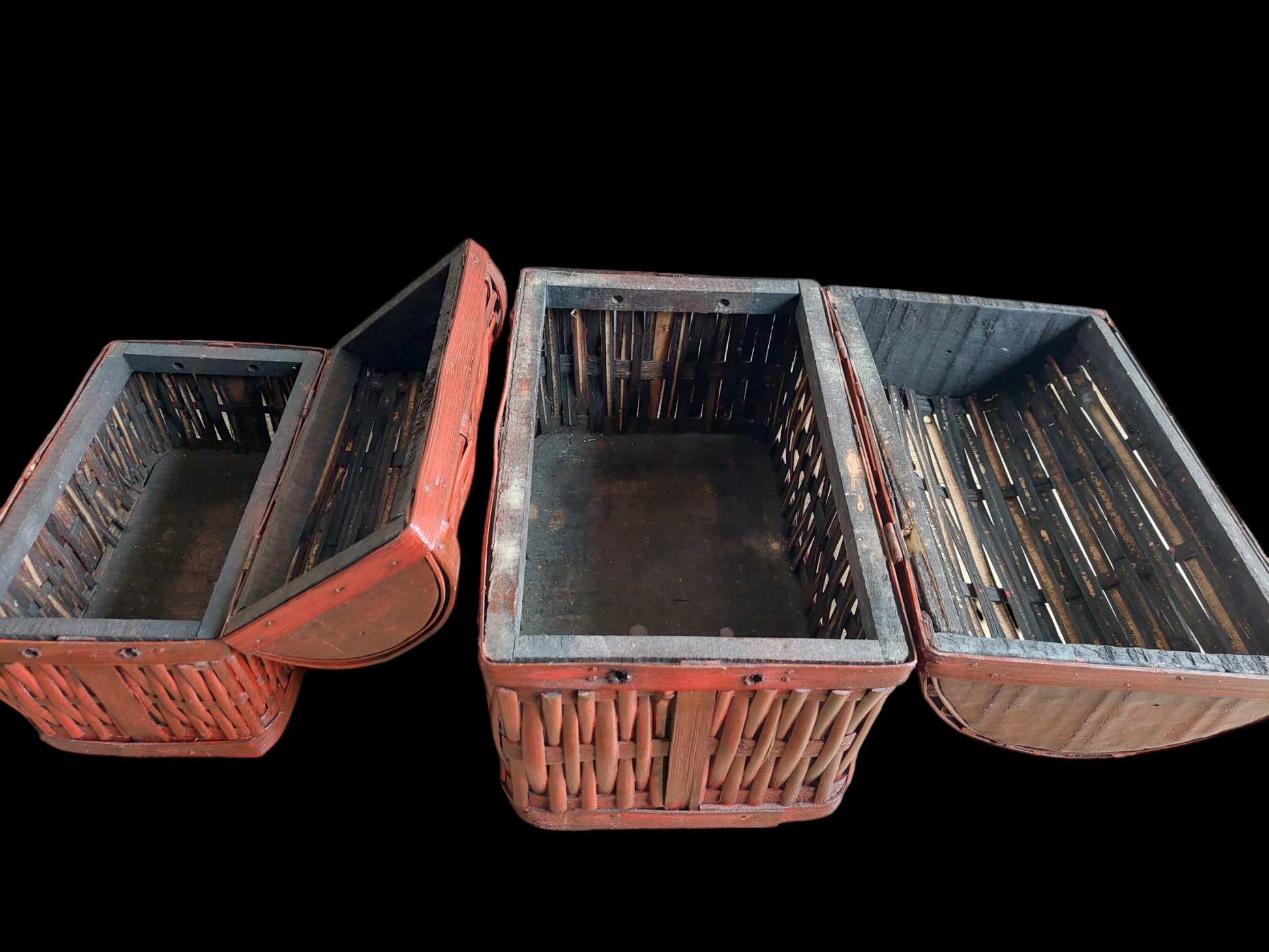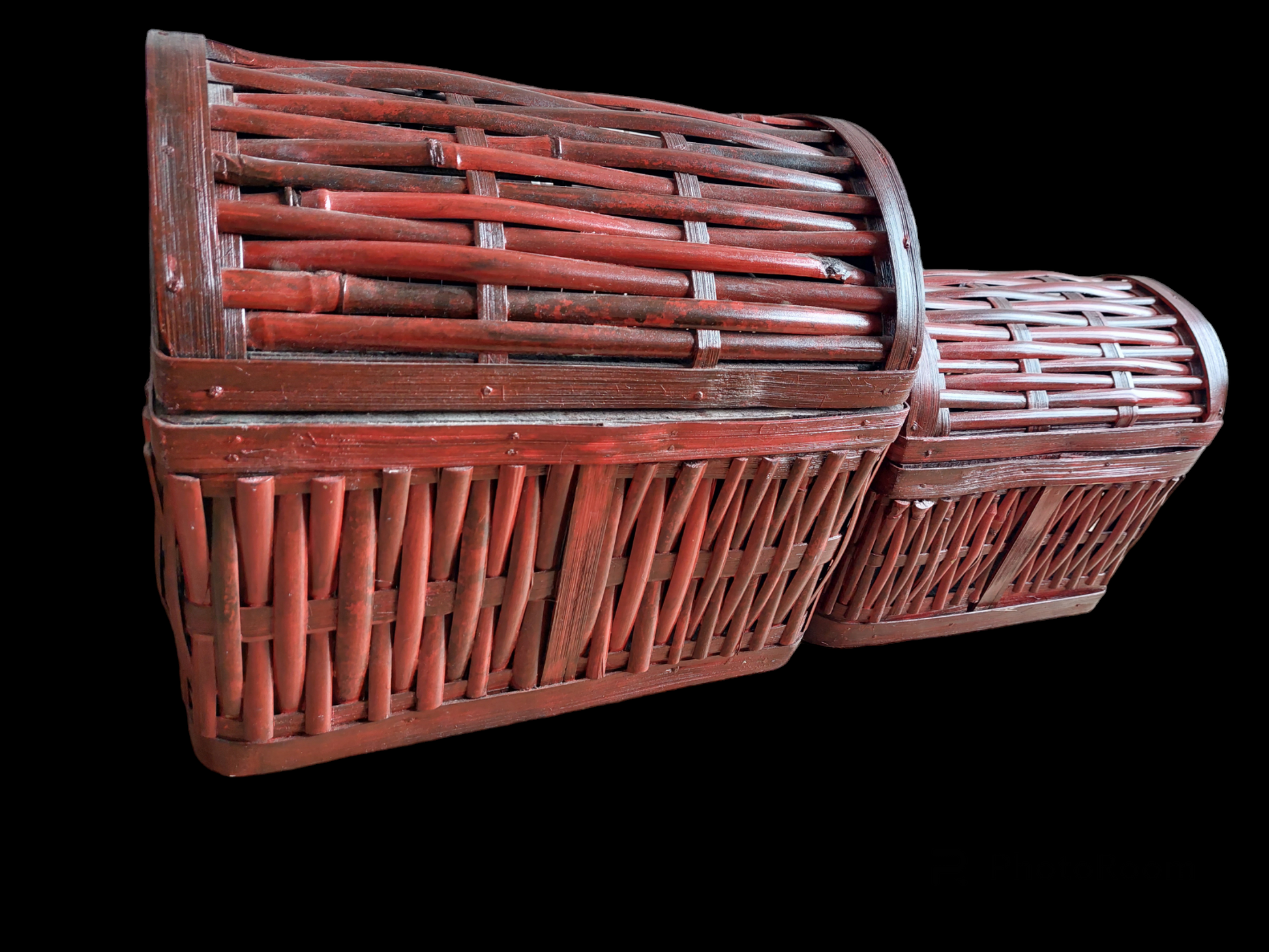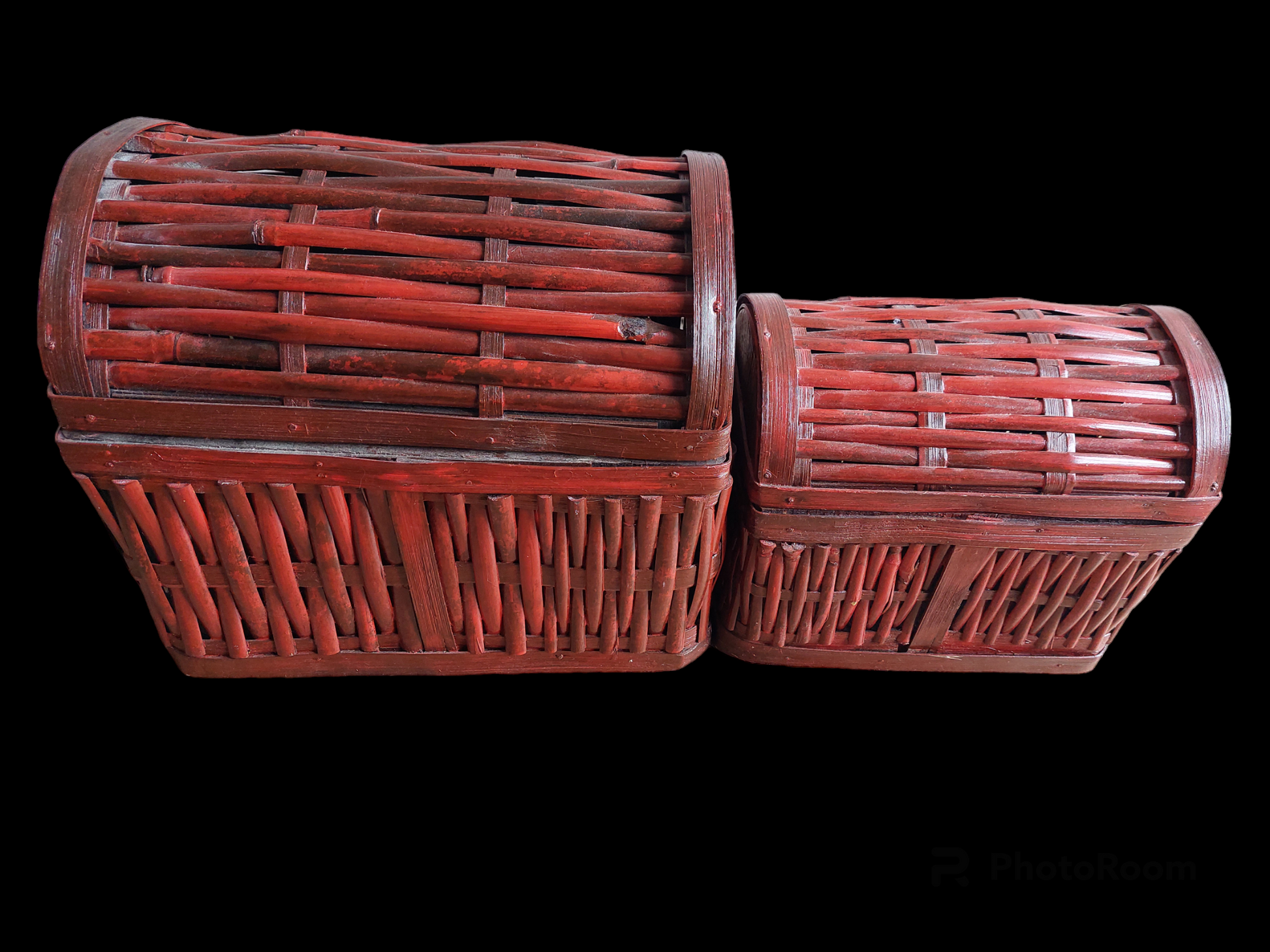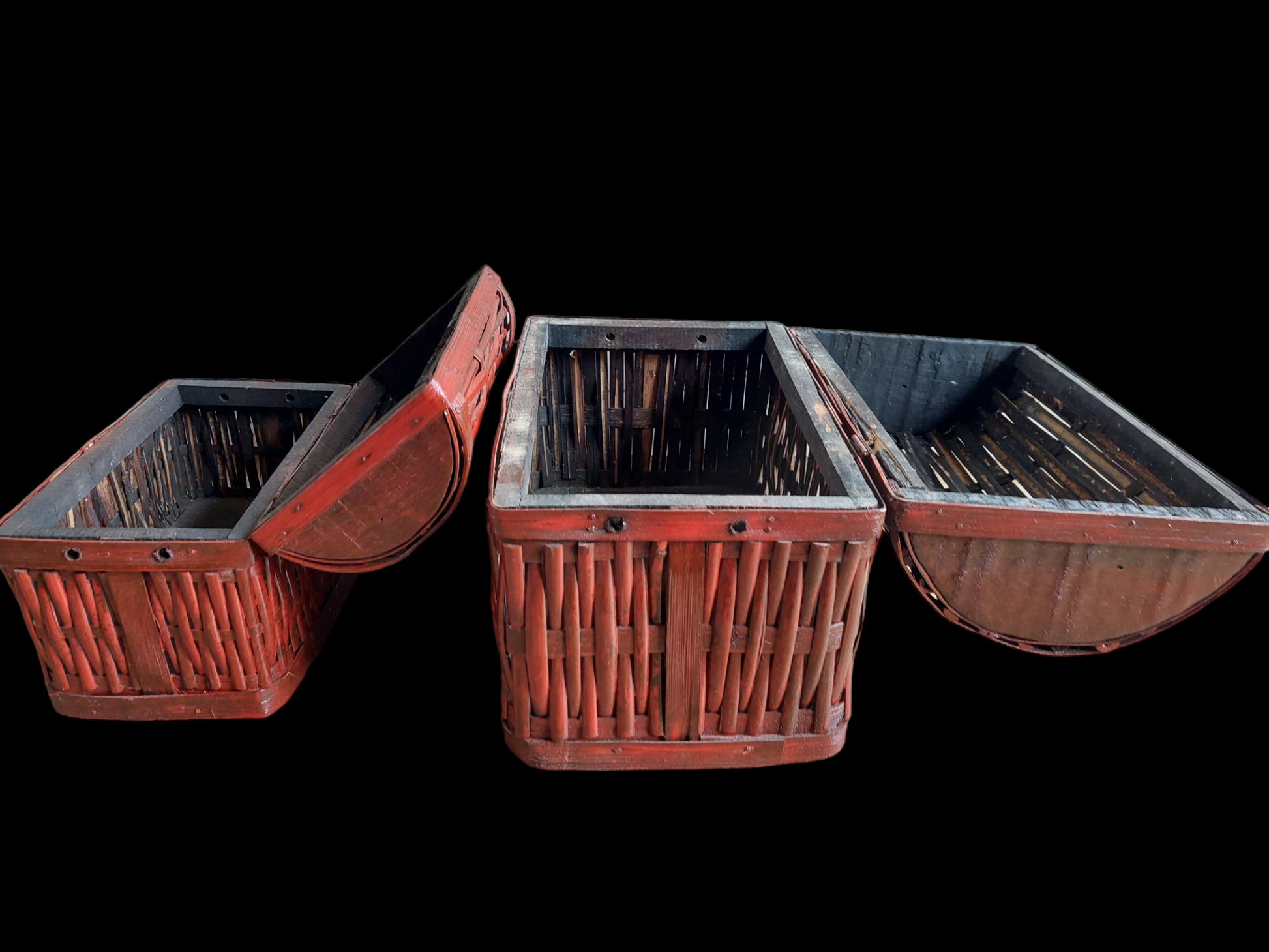 Nice storage baskets made from wood and bamboo, painted in a semi-transparent red color.