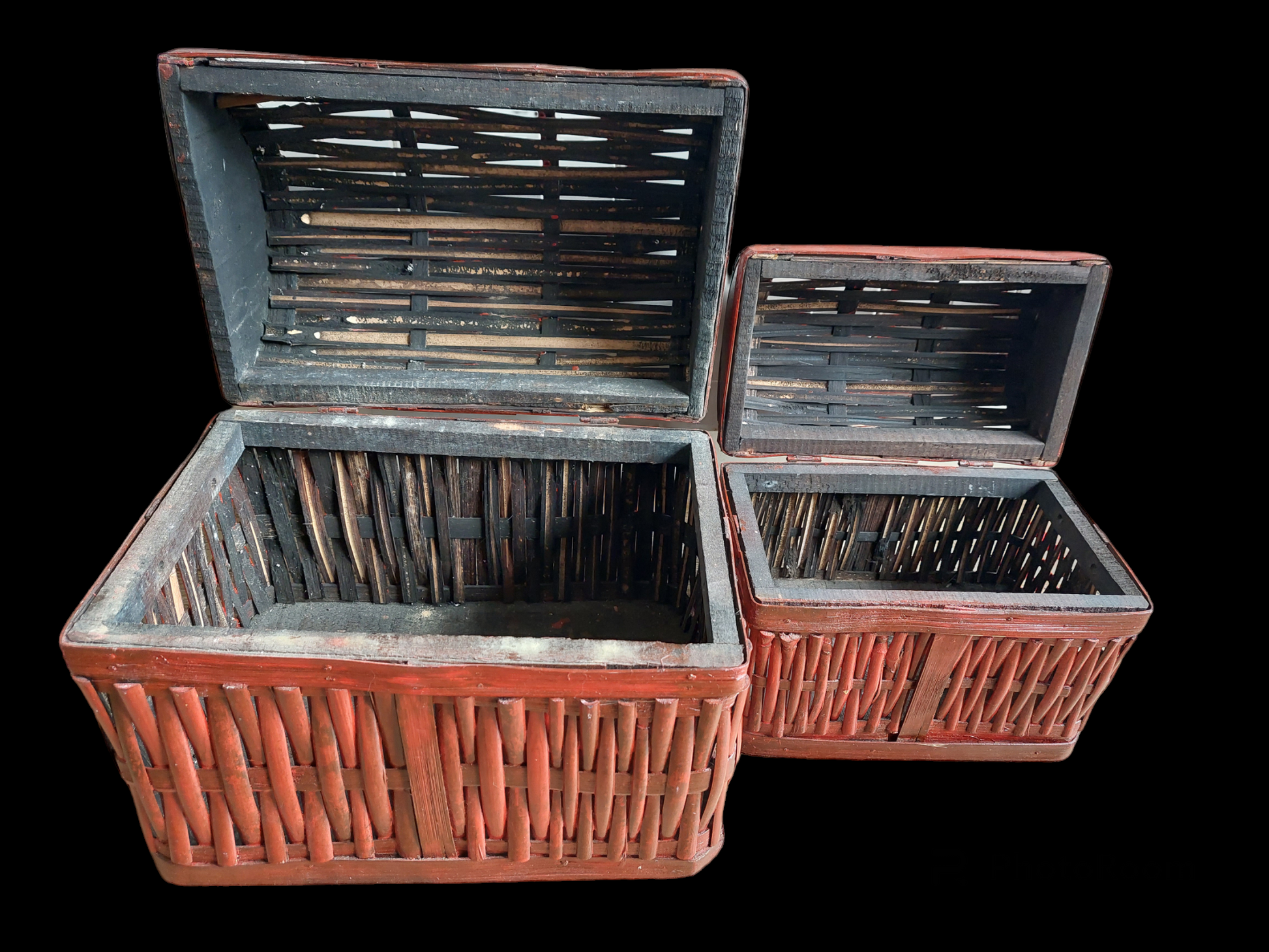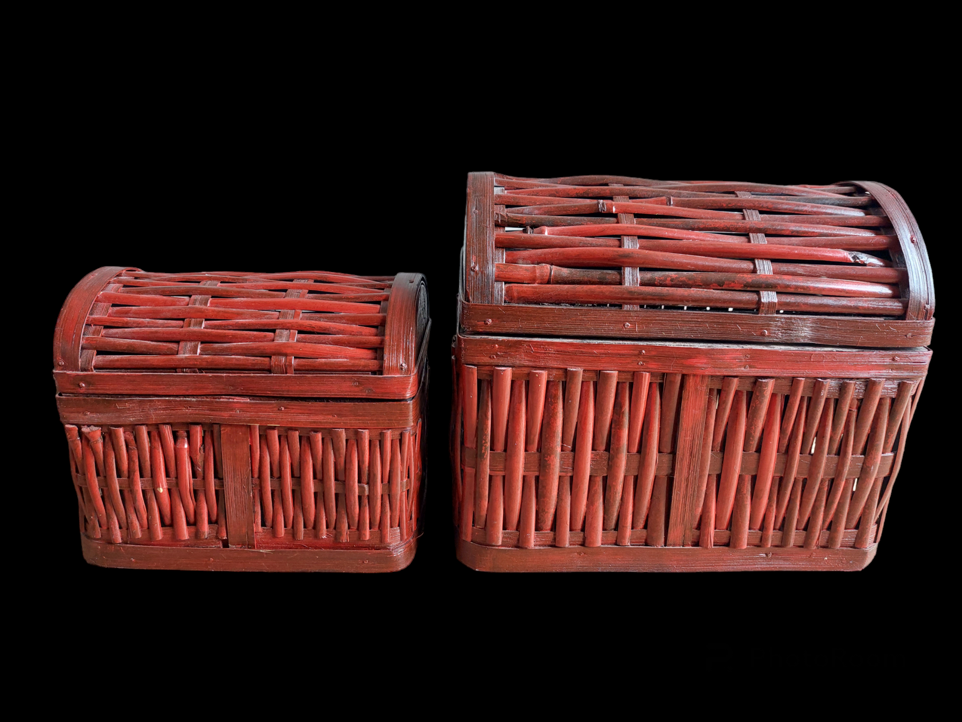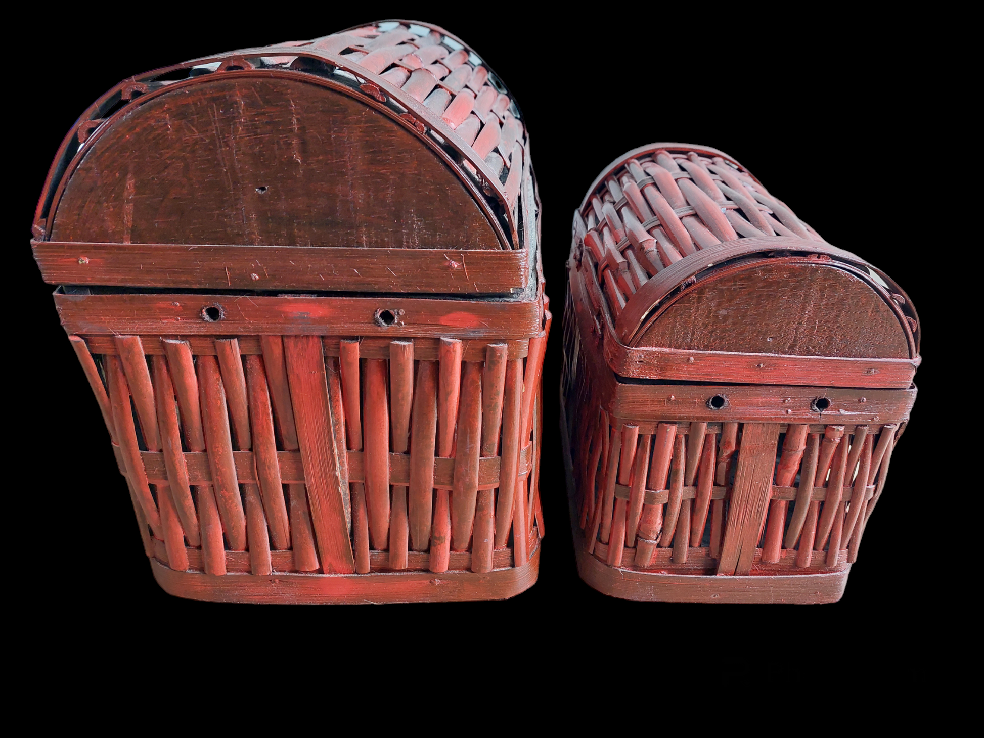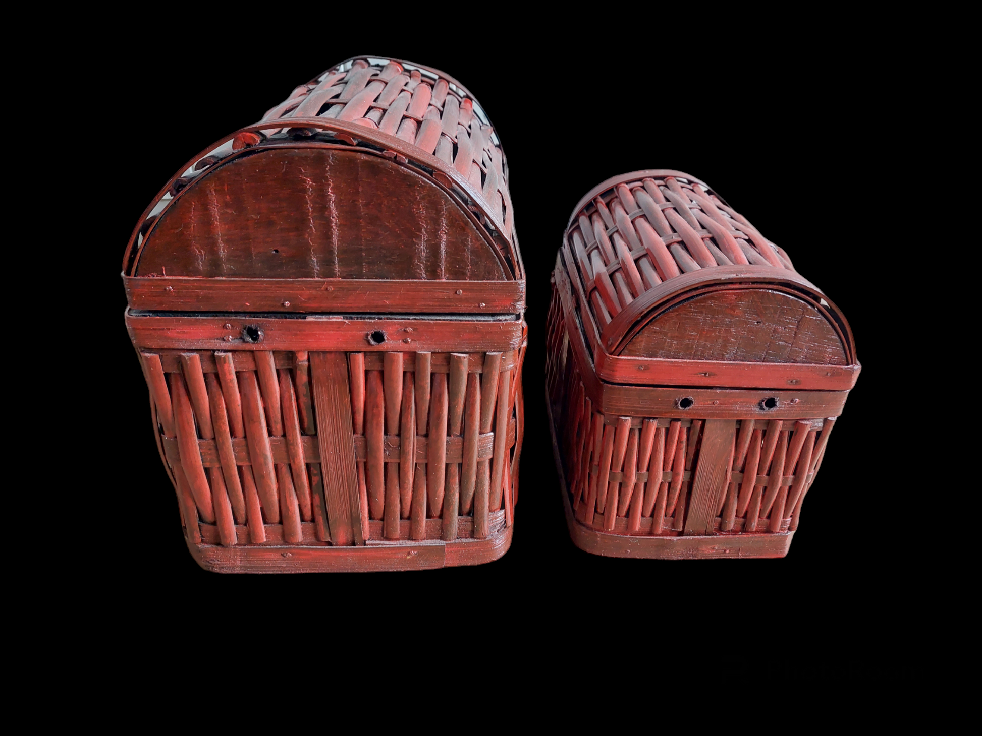 Nice storage baskets made from wood and bamboo, painted in a semi-transparent red color.