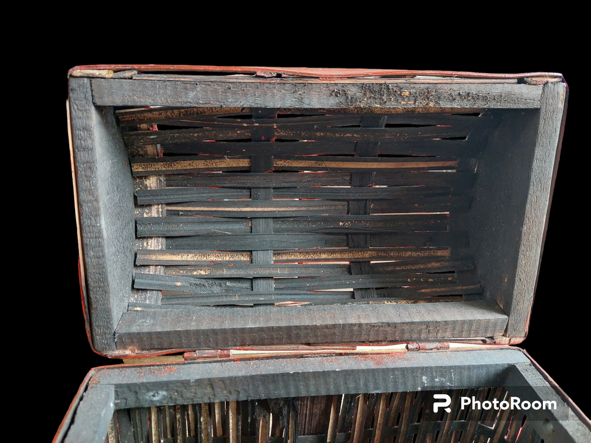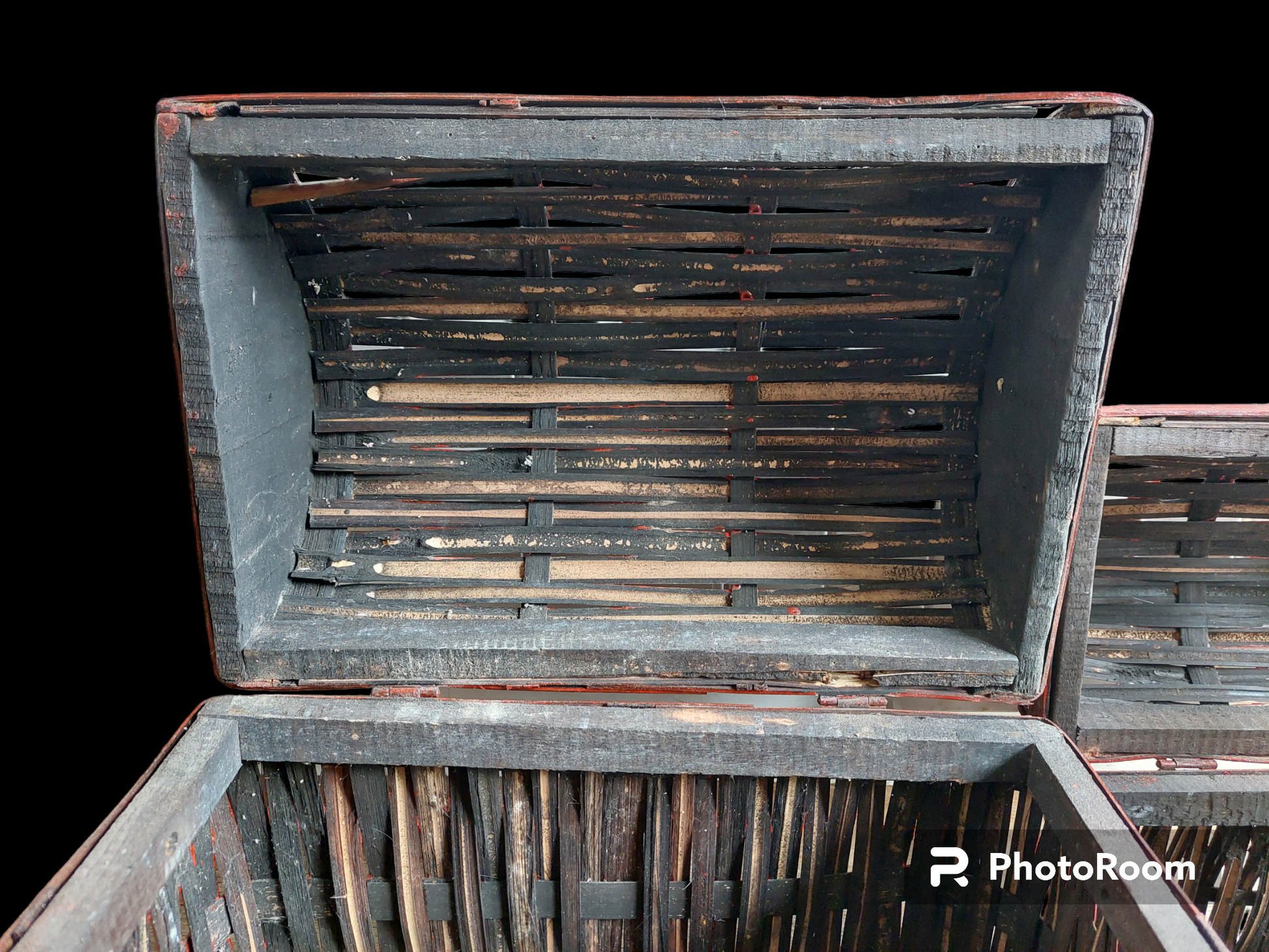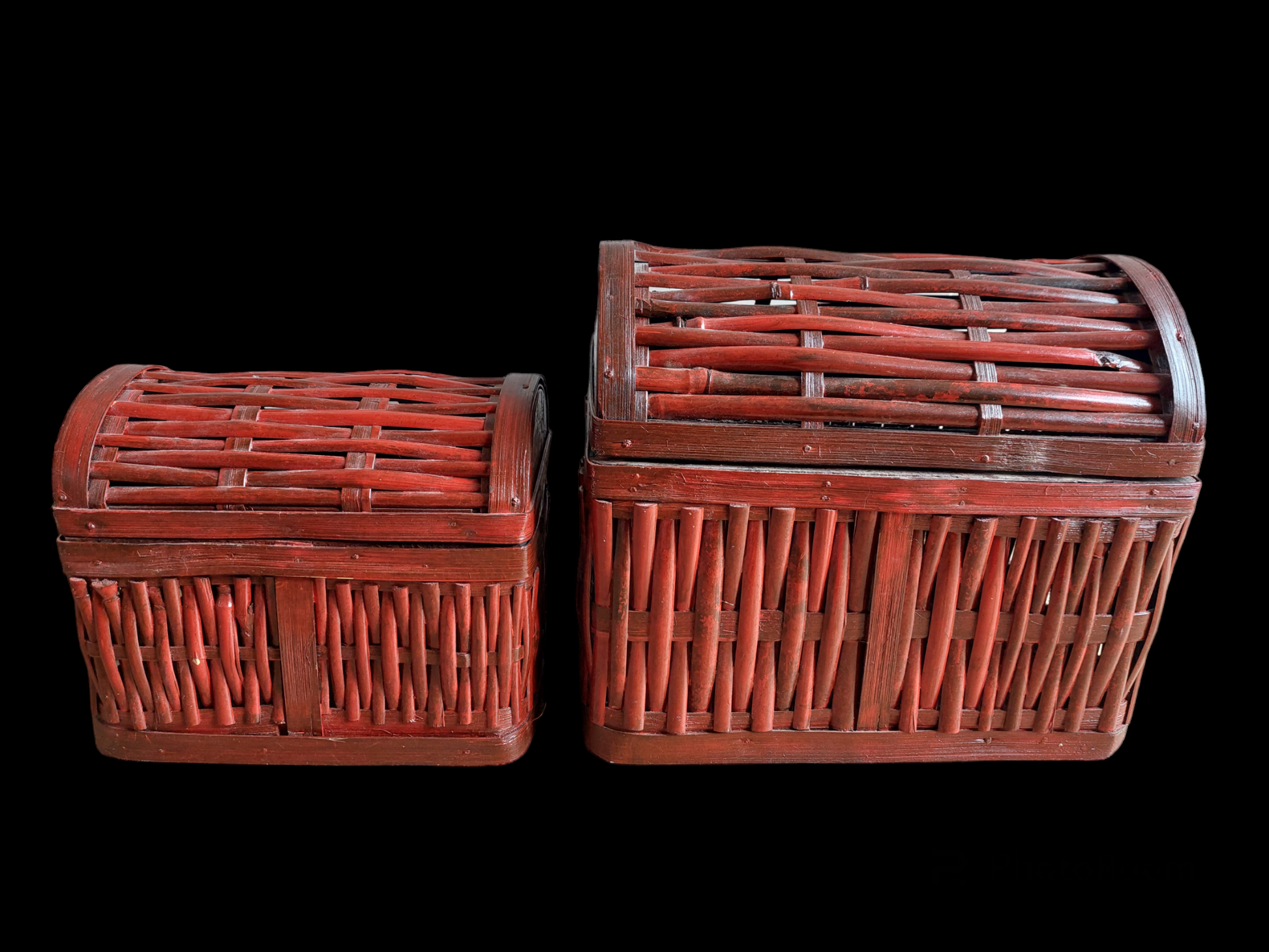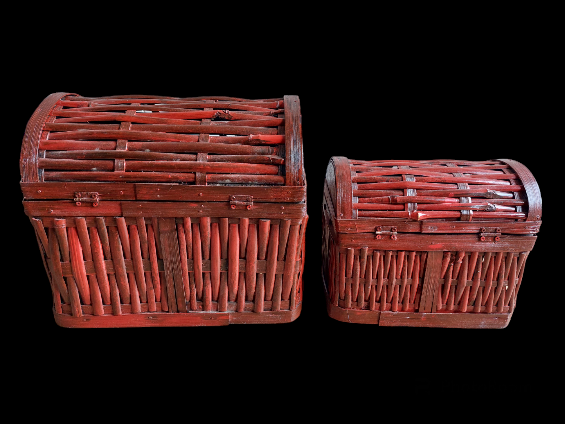 Nice storage baskets made from wood and bamboo, painted in a semi-transparent red color.