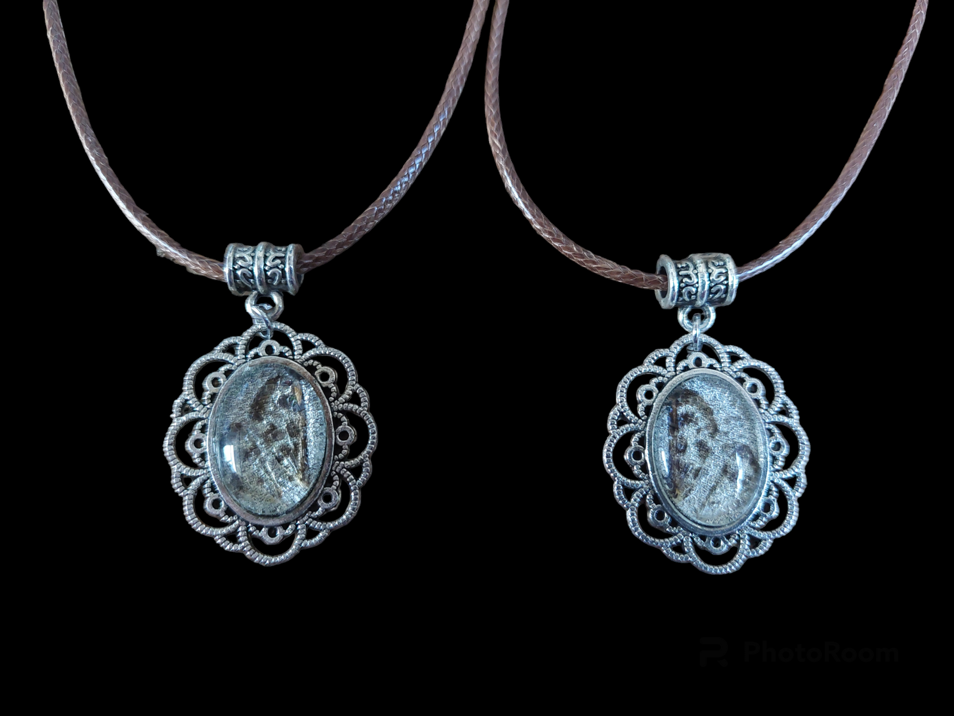 The moth wings have been put in antique silver colored metal glass cabochon jewelry pendants, with a diameter of approximately 25 millimeters